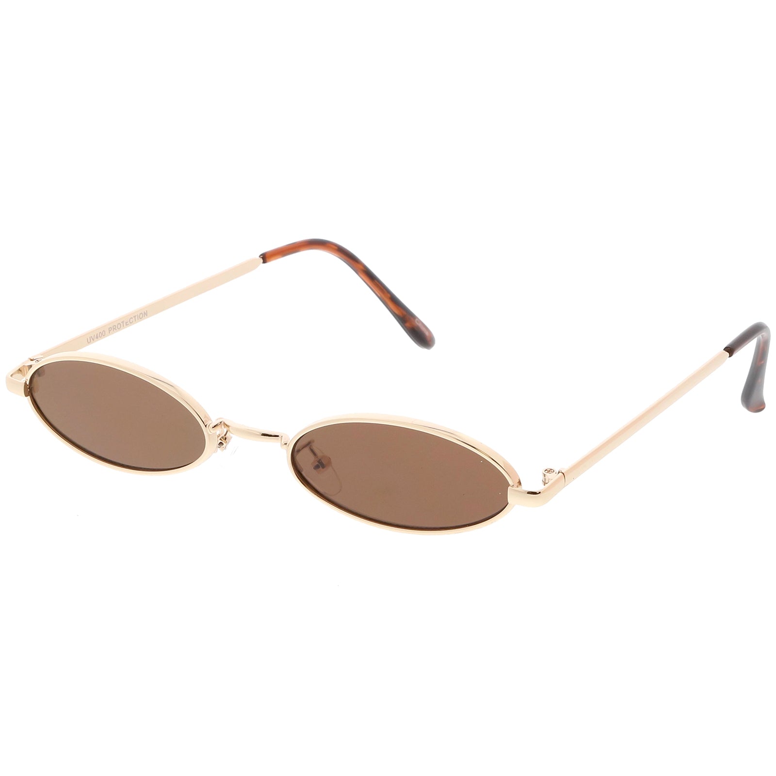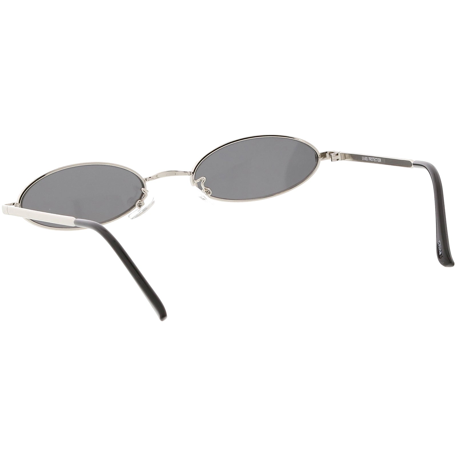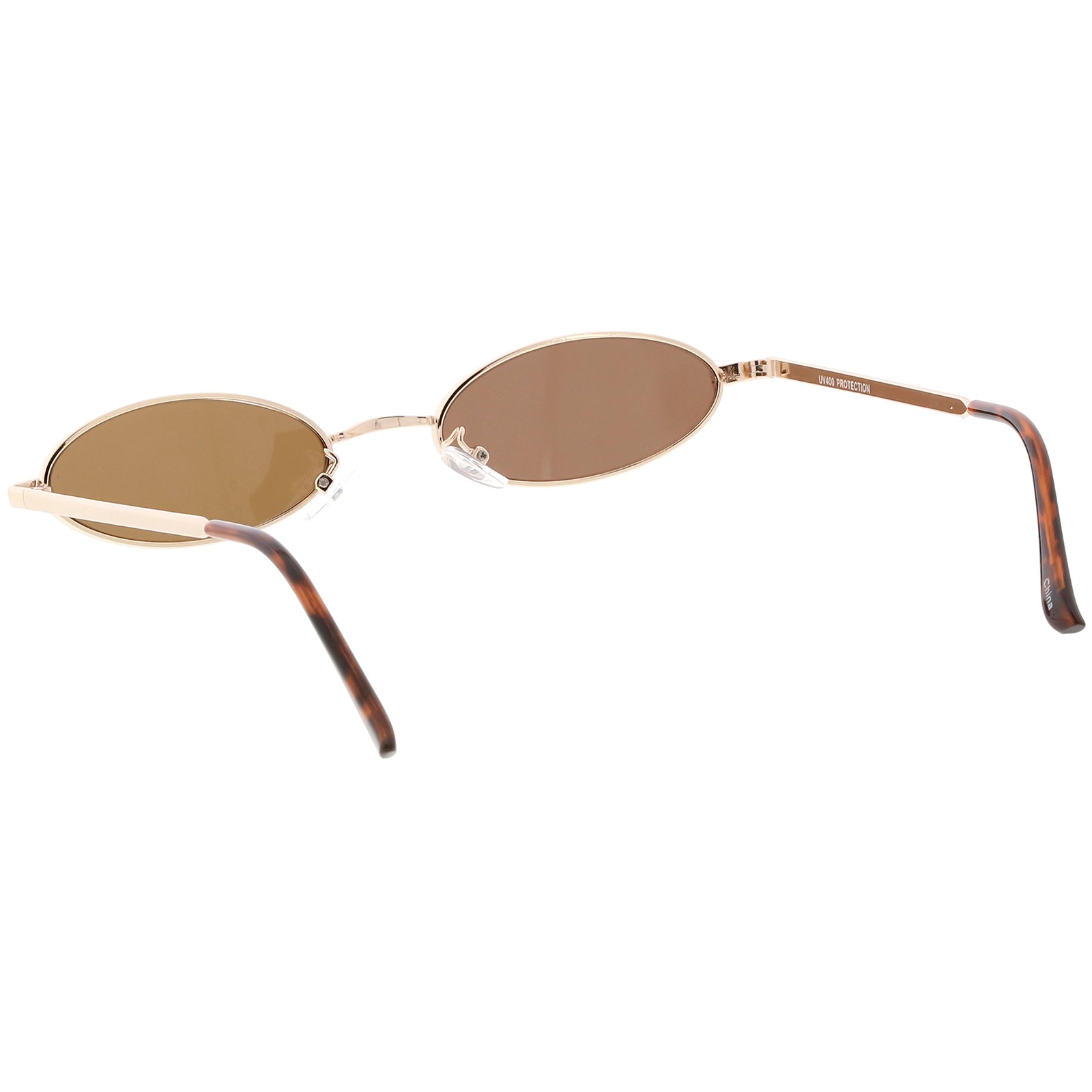 • Flash back to the 90's with this classic, extremely small, oval style. Wear these celebrity must-have sunglasses with any outfit, and you'll have people doing a double take. The sleek, full metal design is made a unique nose piece and neutral colored flat lenses for some added edge. Finished with a metal-based frame, metal hinges, adjustable English style nose pieces, and 100% UV protected lenses.