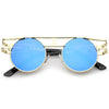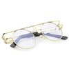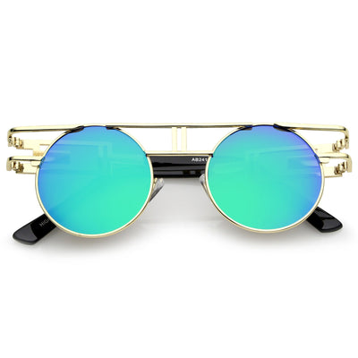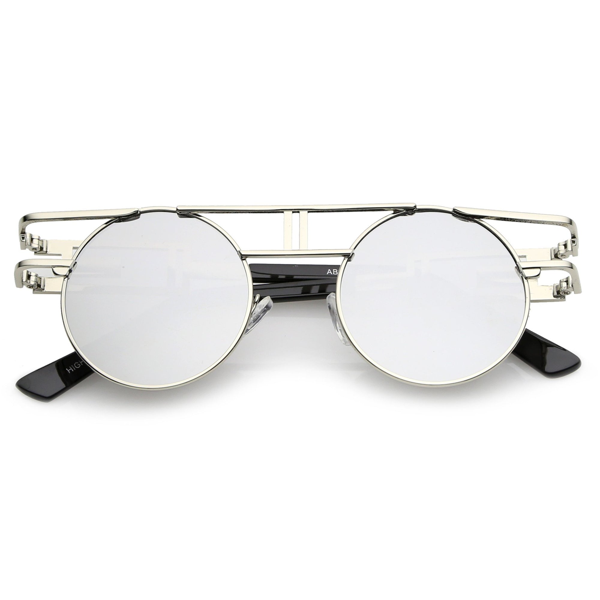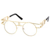 A bold and fashion forward design, these round metal glasses feature an open metal frame for a sleek steampunk aesthetic. Designed with clear and color mirrored round flat lenses and a unique brow bar for stand-out appeal, these round glasses are a great statement piece. Made with a metal based frame, English style nose pieces, metal hinges, and polycarbonate UV400 lenses.