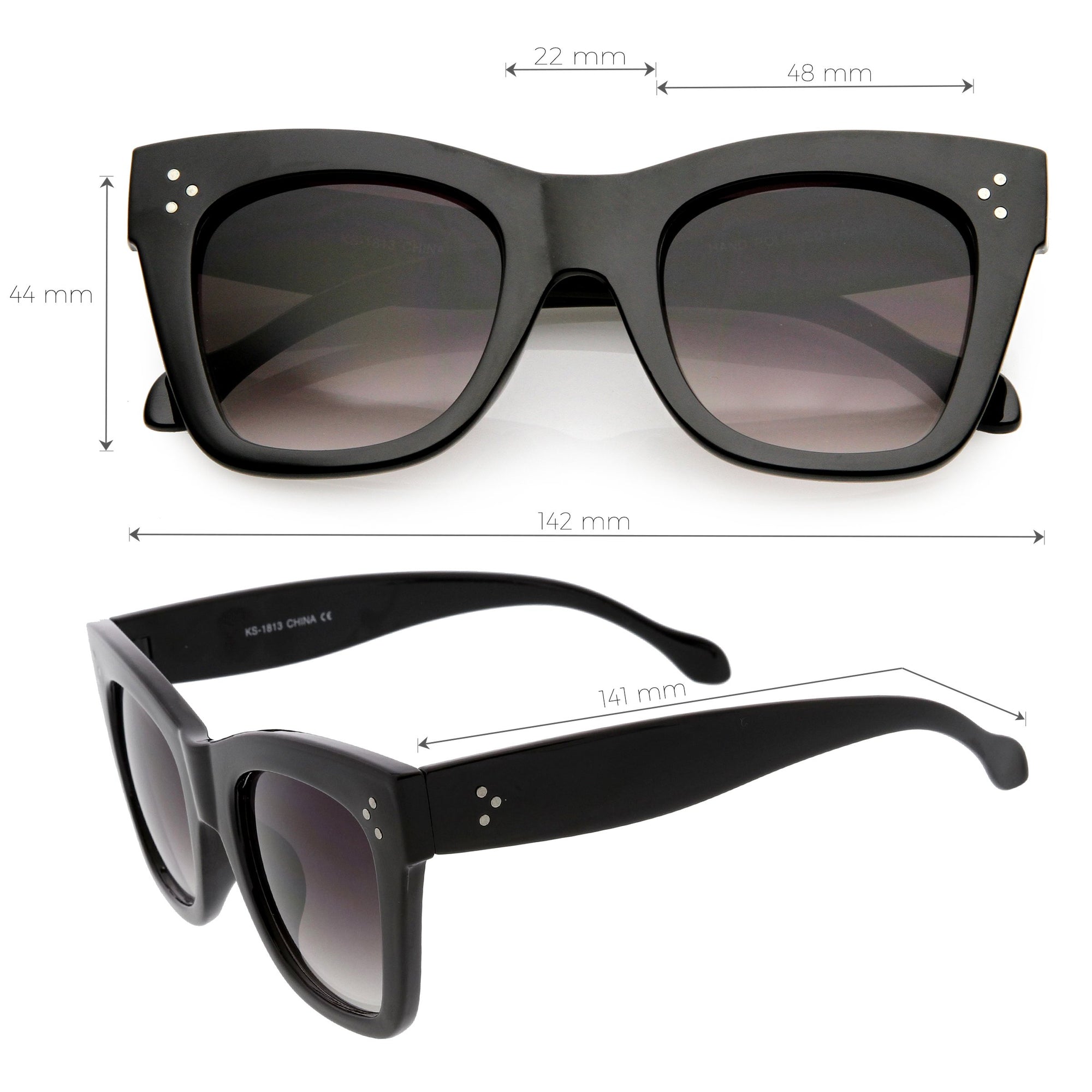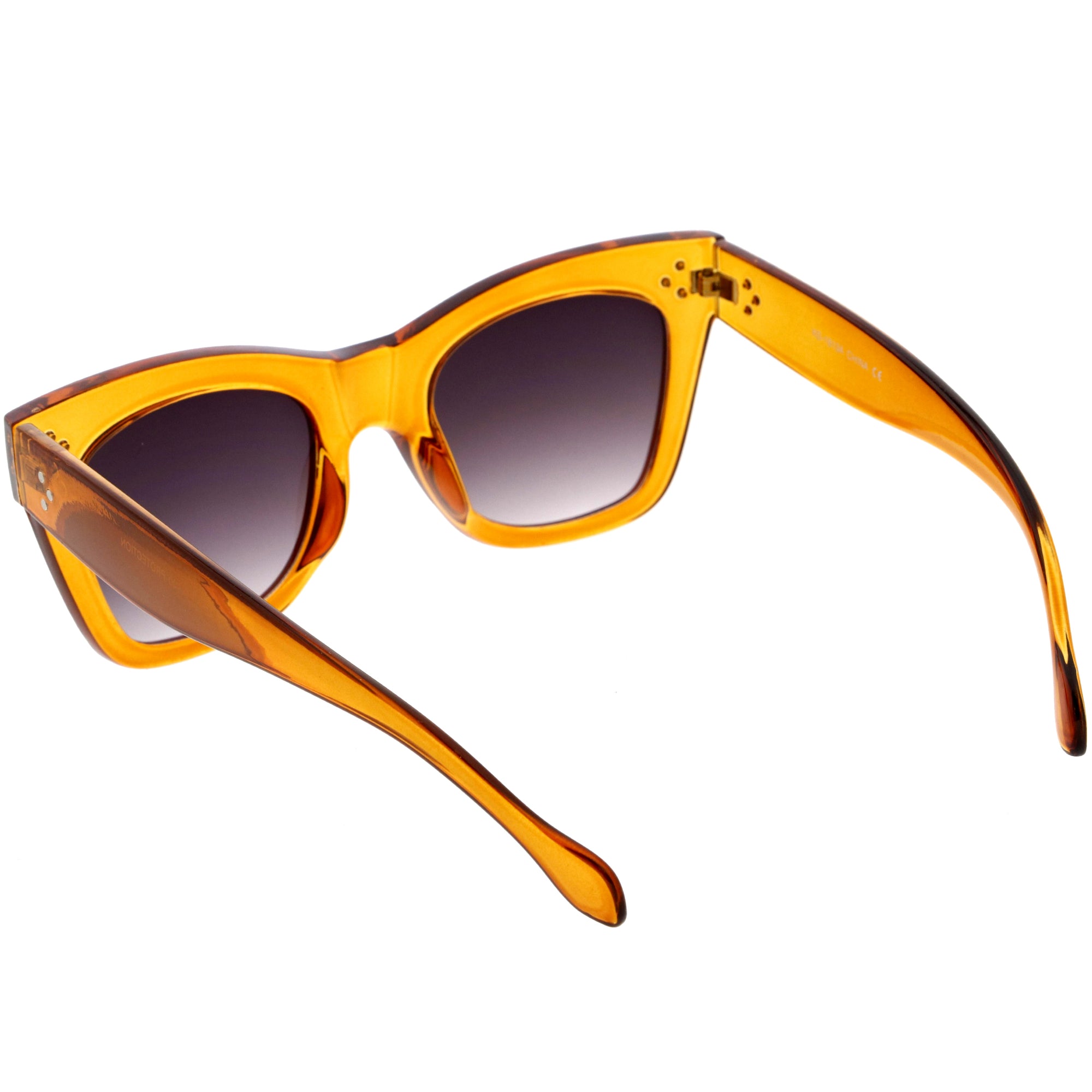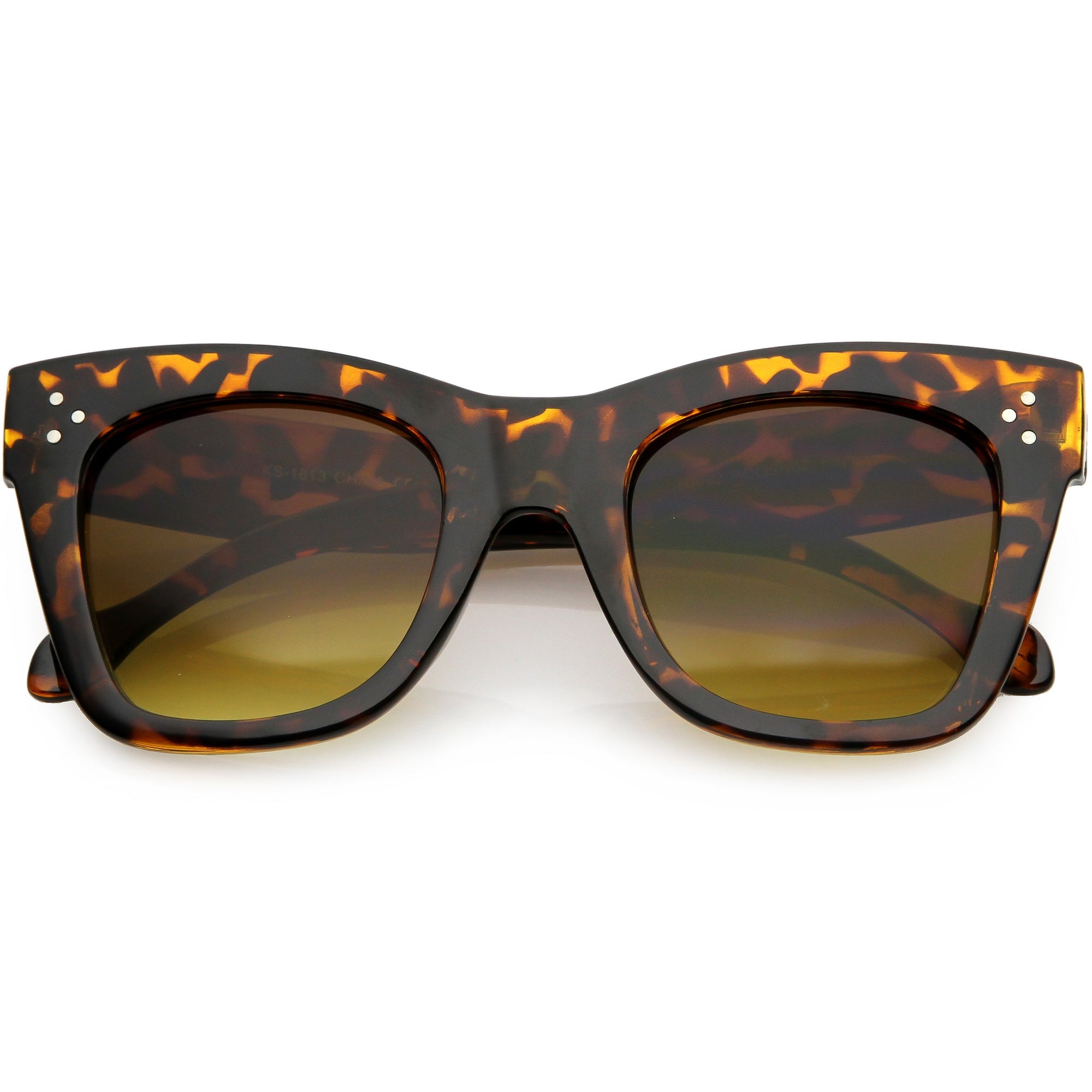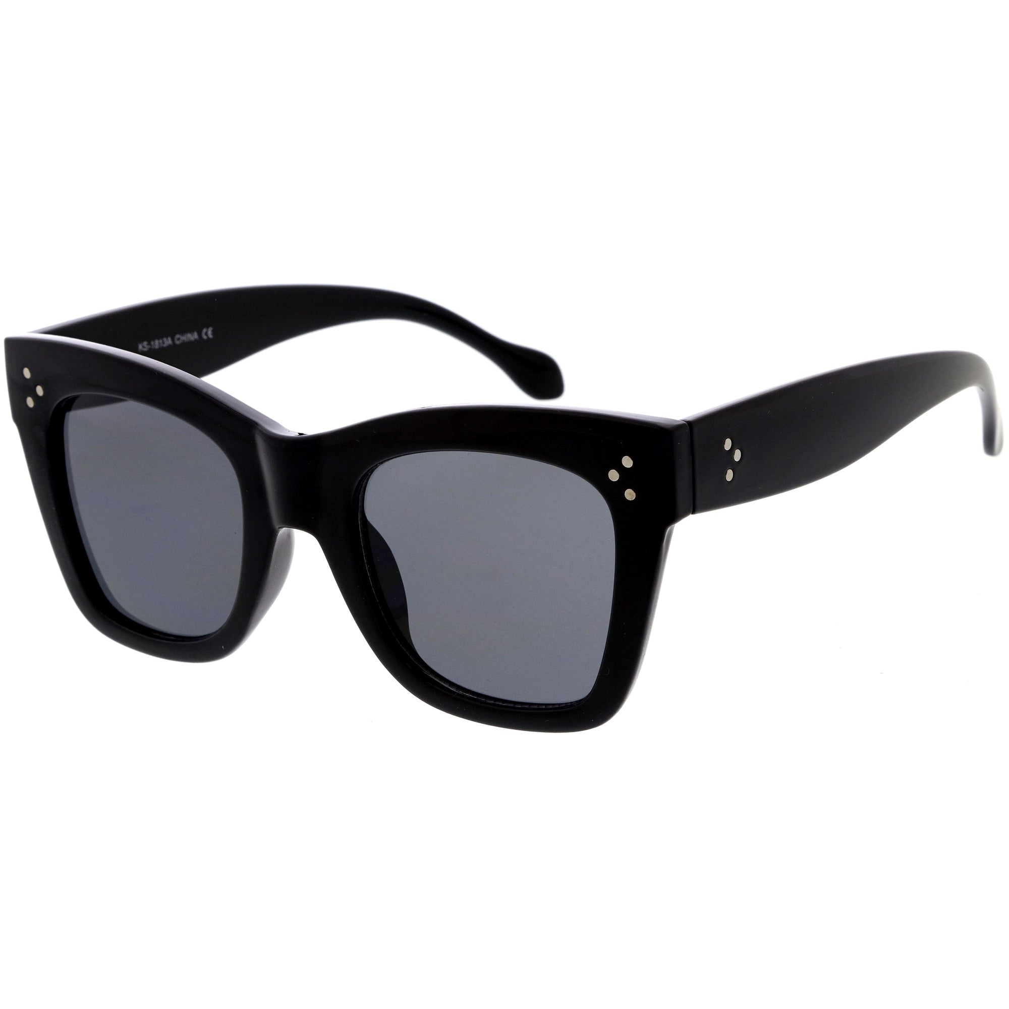 Create a stylishly chic look with these cat eye sunglasses featuring an oversize chunky frame and a subtle horn rimmed design. Neutral colored square lenses make this style great for everyday wear, while stylishly wide arms gives it fashion forward appeal. Made with a plastic based frame, reinforced metal hinges, and 100% UV protected lenses.