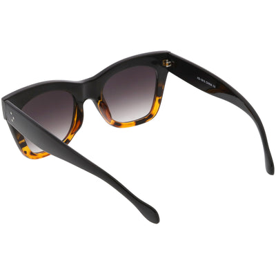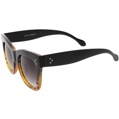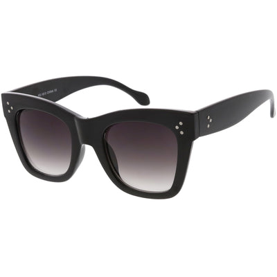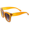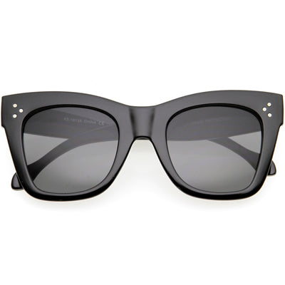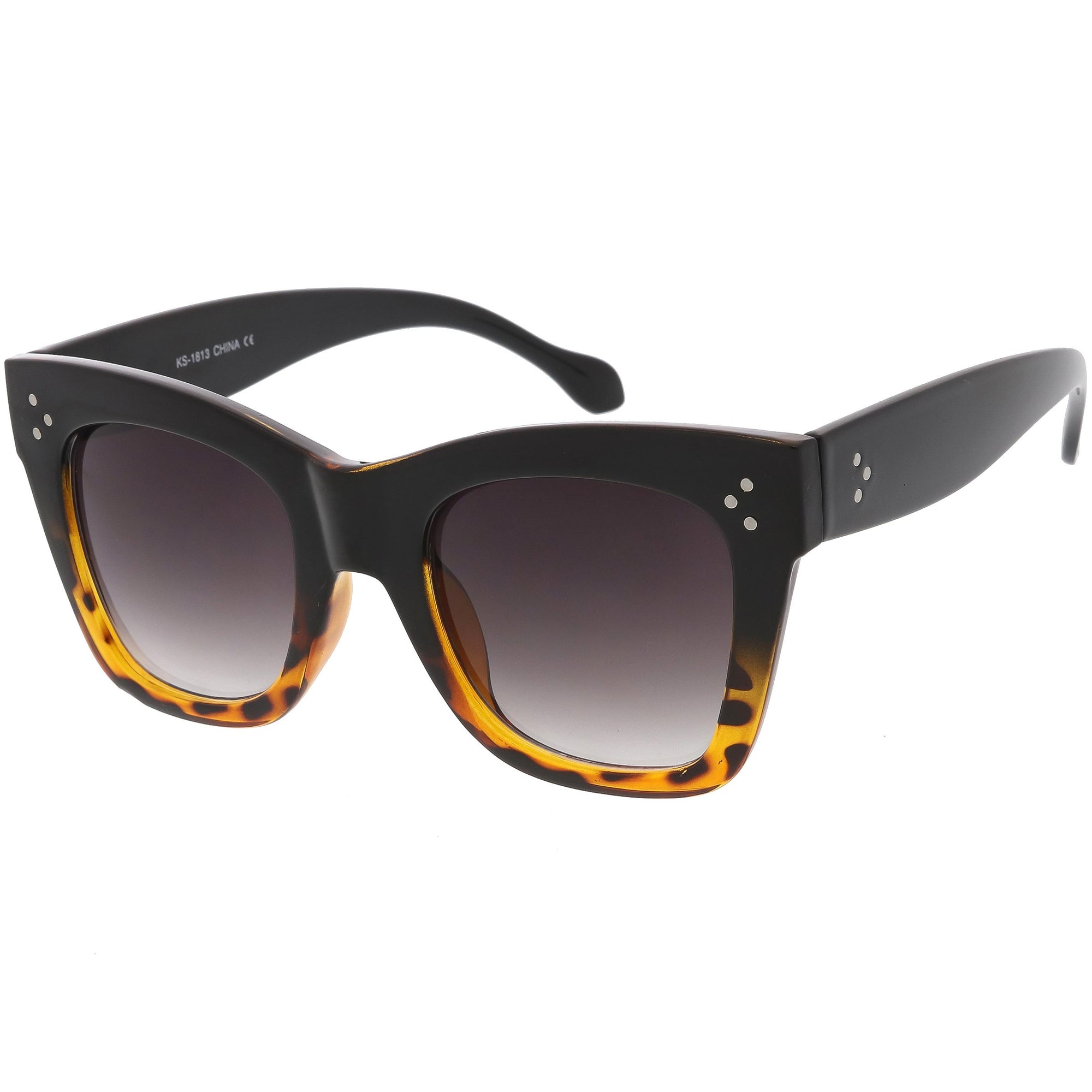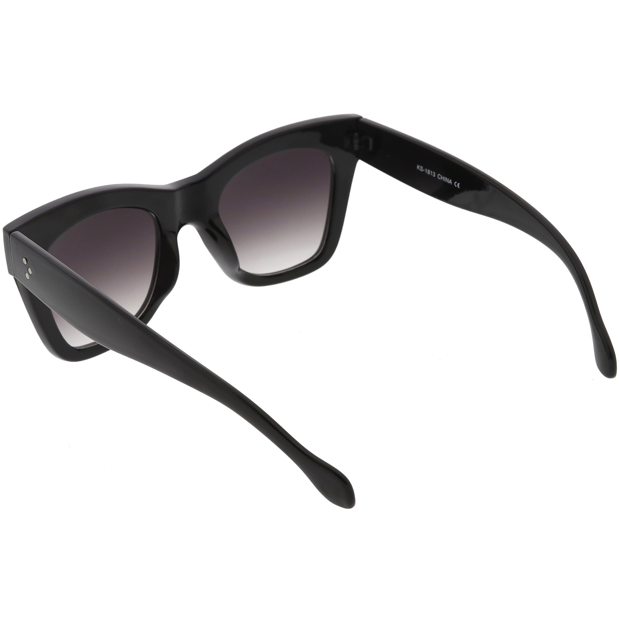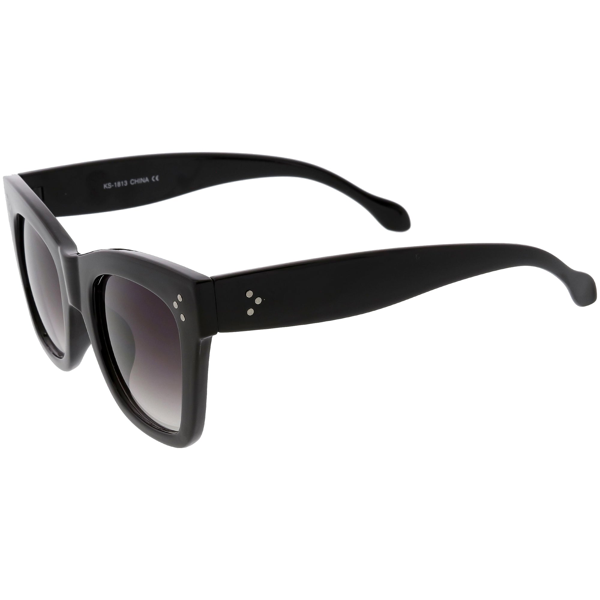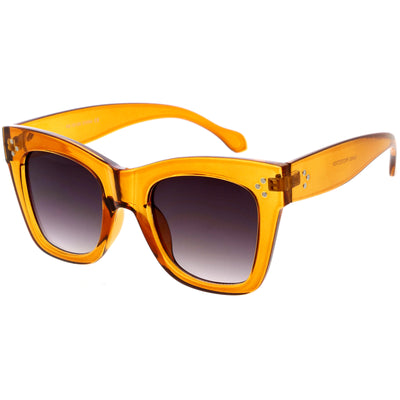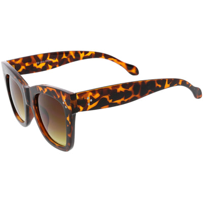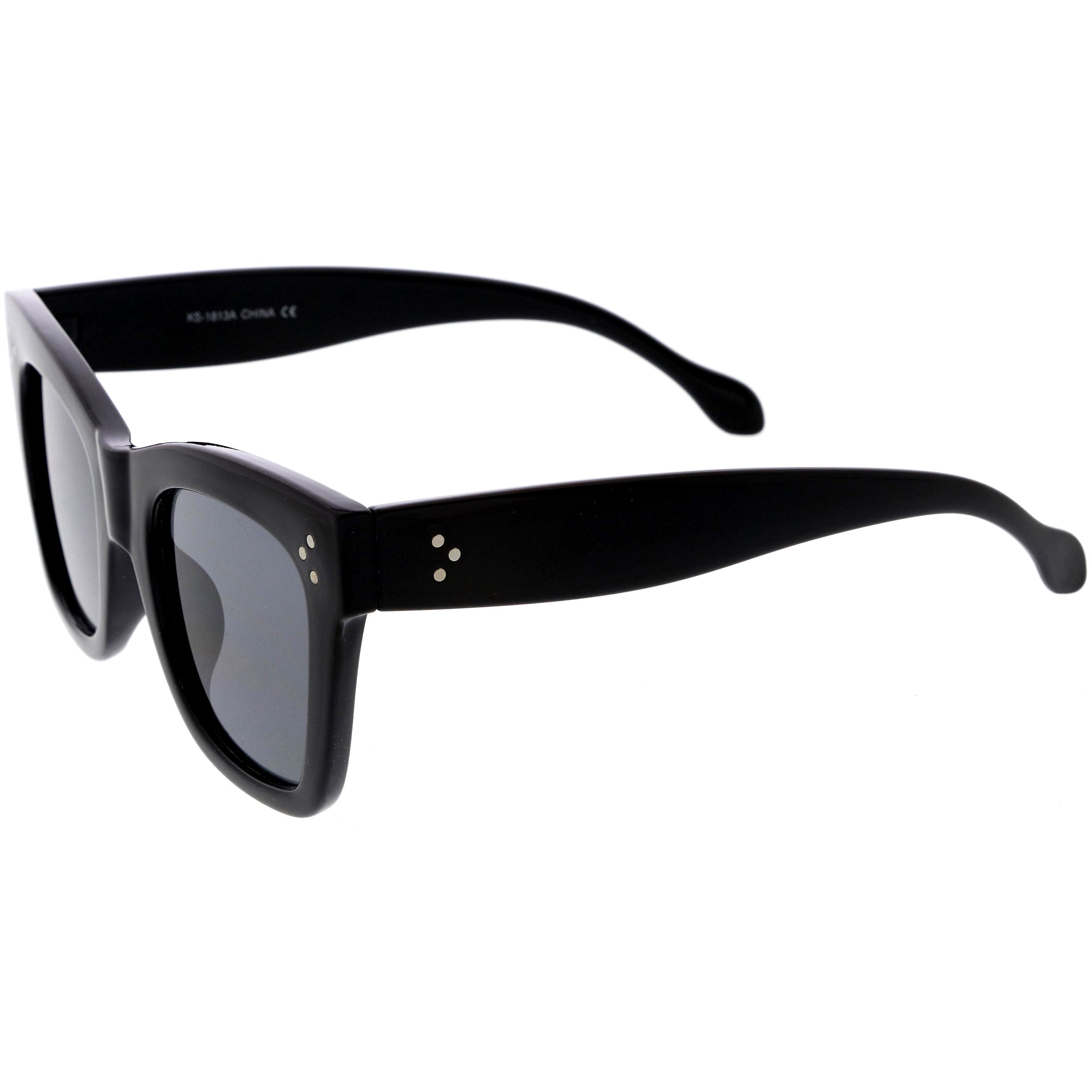 Create a stylishly chic look with these cat eye sunglasses featuring an oversize chunky frame and a subtle horn rimmed design. Neutral colored square lenses make this style great for everyday wear, while stylishly wide arms gives it fashion forward appeal. Made with a plastic based frame, reinforced metal hinges, and 100% UV protected lenses.