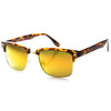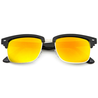 Half frame square shape that stays true to the classic and iconic look with new touch of flash mirrored lenses. Frame is crafted with an plastic brow and plastic arms, metal wire lens lining and metal nose bridge. Features metal hinges, English style nose pieces, and dark-tinted UV400 protected lenses. zeroUV(r) is a registered trademark
