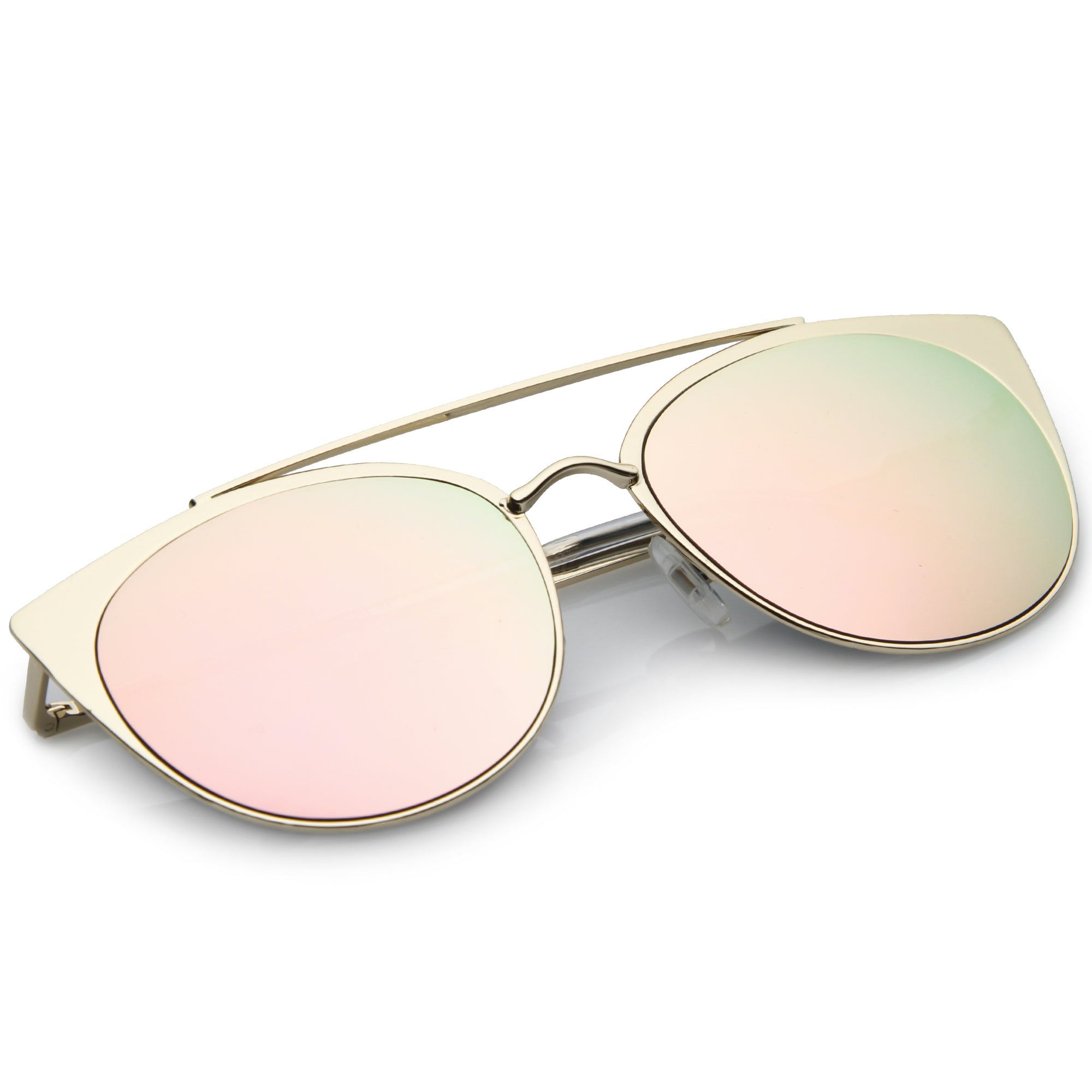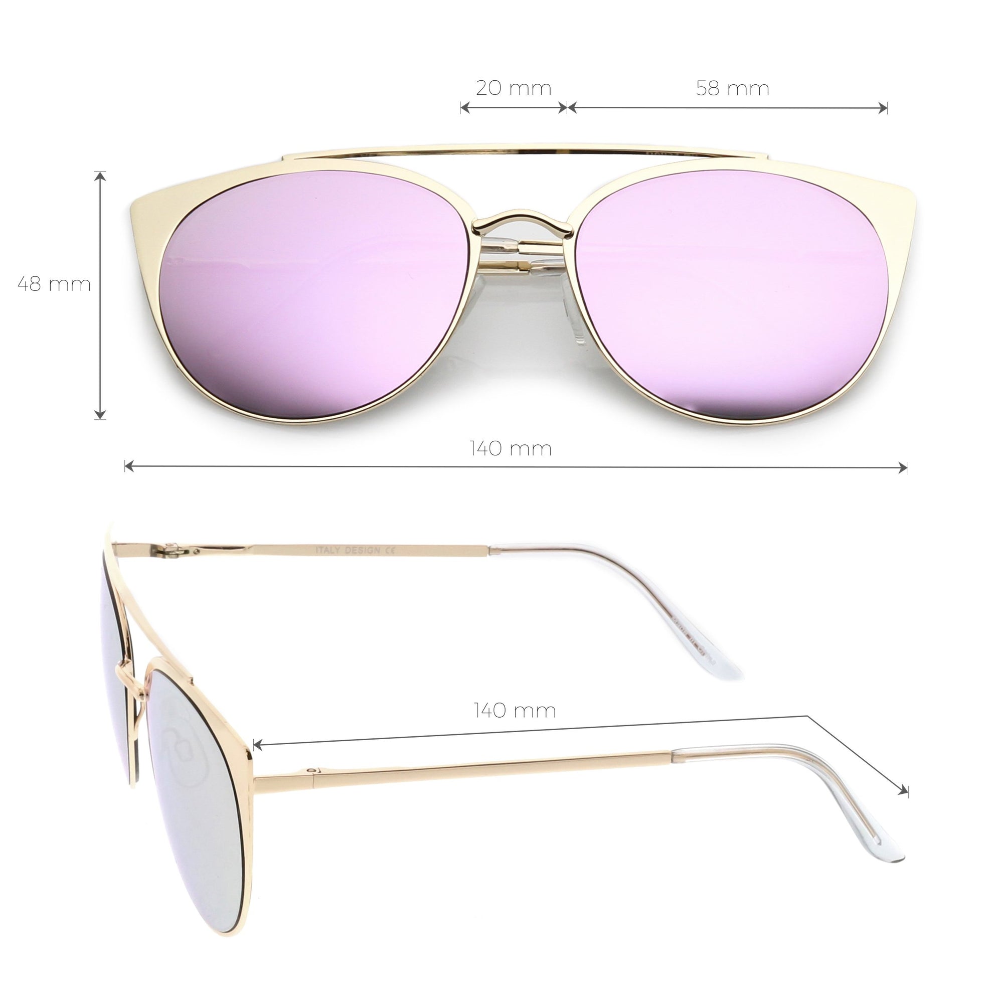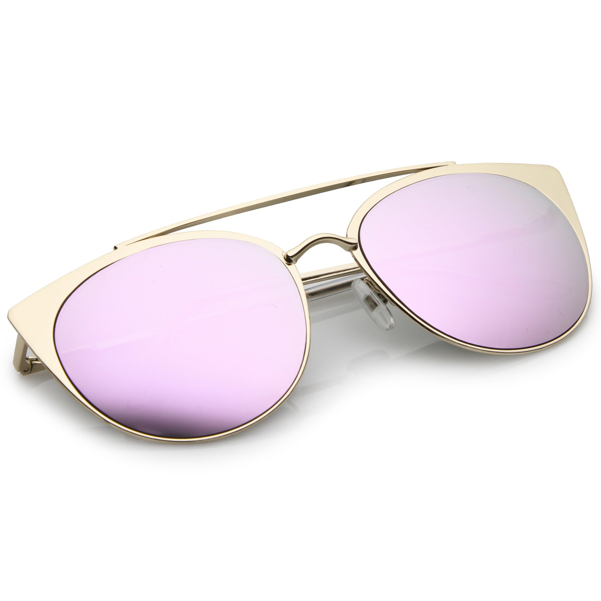 A modern style that is sure to catch anyone's attention, these metal cat eye sunglasses are designed with an oversize silhouette and colored mirror flat lenses for a statement-making effect. Accented with a sleek metal crossbar and ultra slim metal arms with spring hinges for a comfortable fit, these cat eye sunglasses add a edgy-yet-feminine touch to your go-to looks. Made with a metal based frame, adjustable English style nose pieces, metal spring hinges, and 100% UV protection.