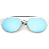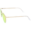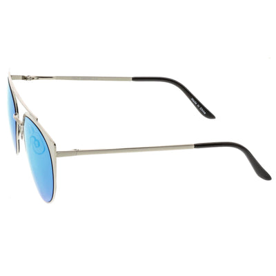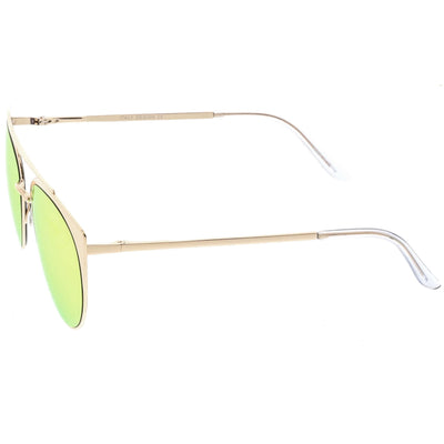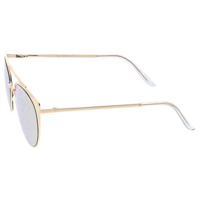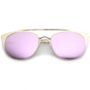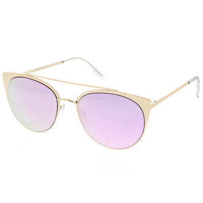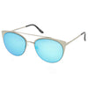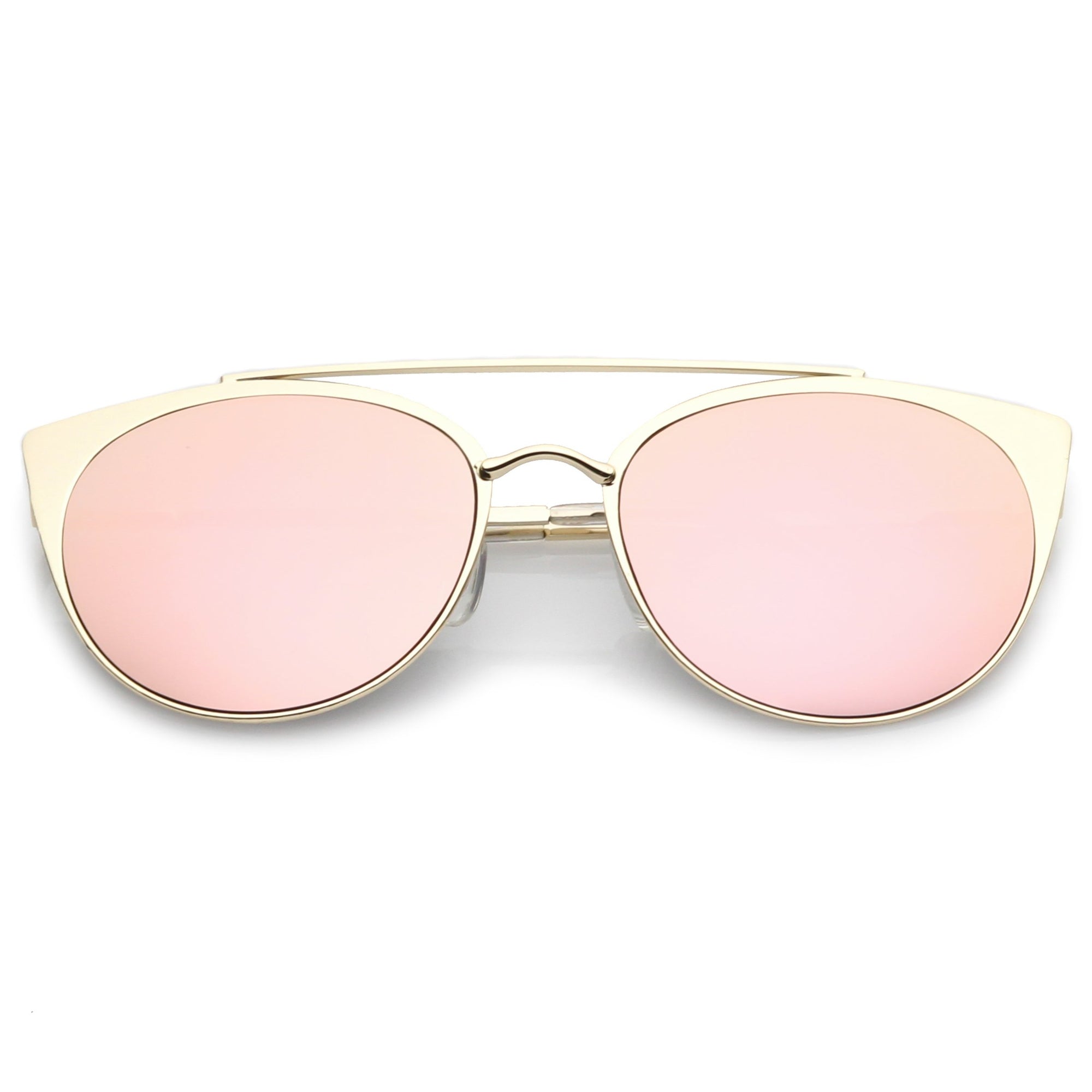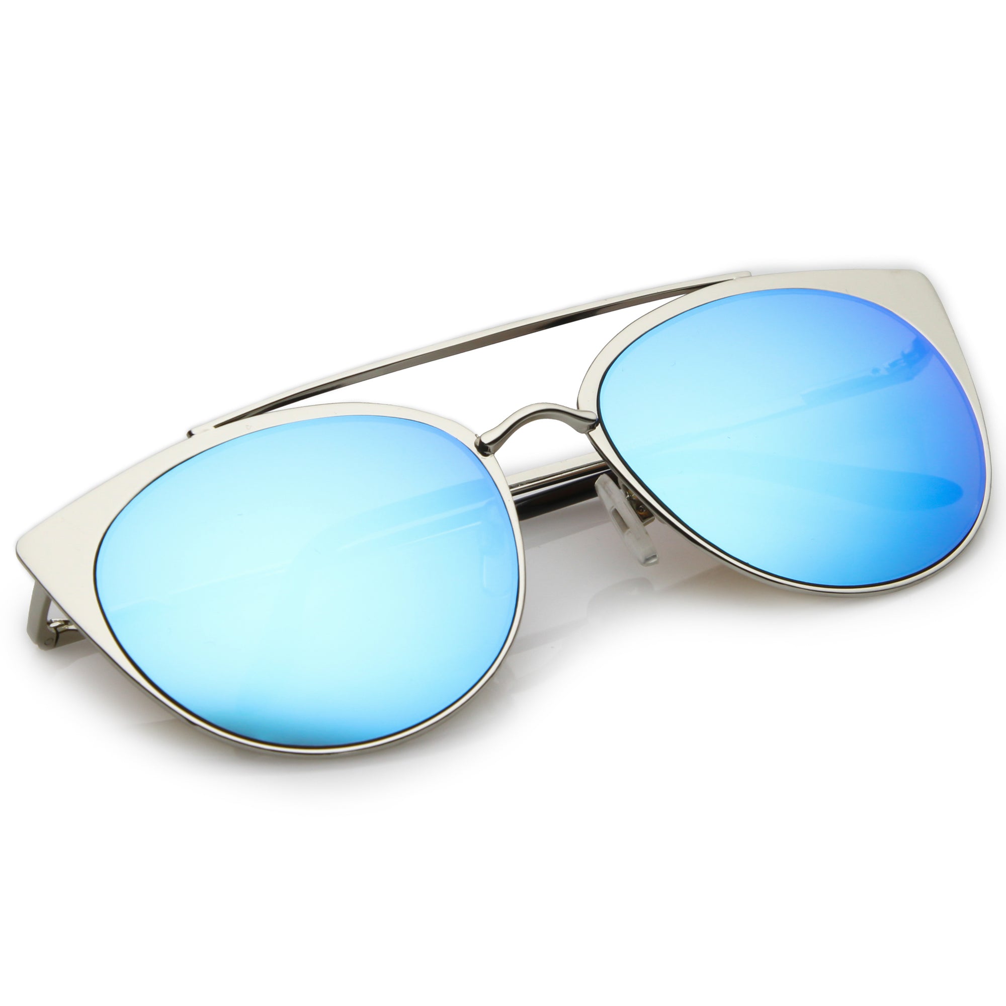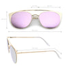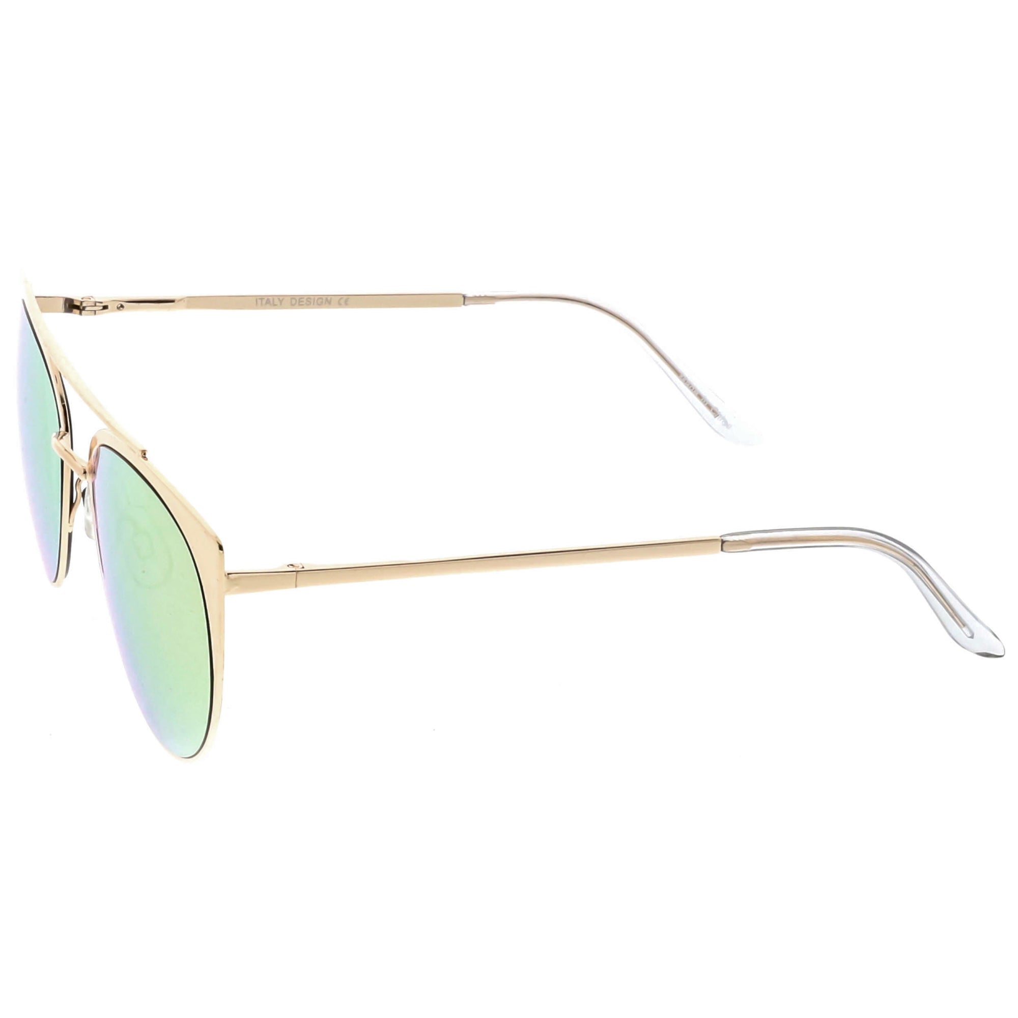 A modern style that is sure to catch anyone's attention, these metal cat eye sunglasses are designed with an oversize silhouette and colored mirror flat lenses for a statement-making effect. Accented with a sleek metal crossbar and ultra slim metal arms with spring hinges for a comfortable fit, these cat eye sunglasses add a edgy-yet-feminine touch to your go-to looks. Made with a metal based frame, adjustable English style nose pieces, metal spring hinges, and 100% UV protection.