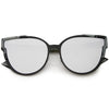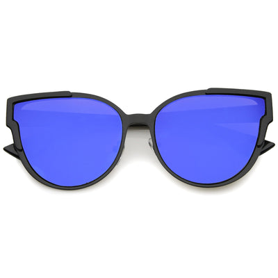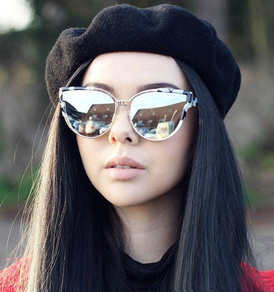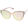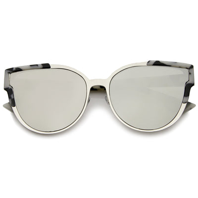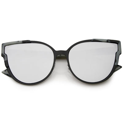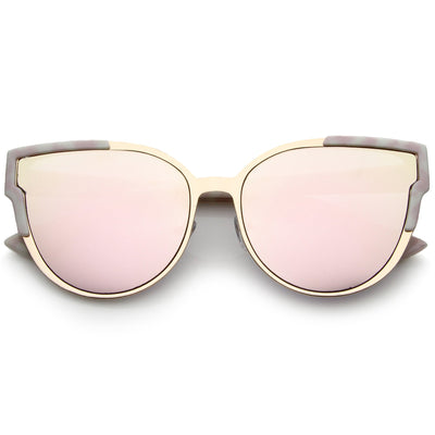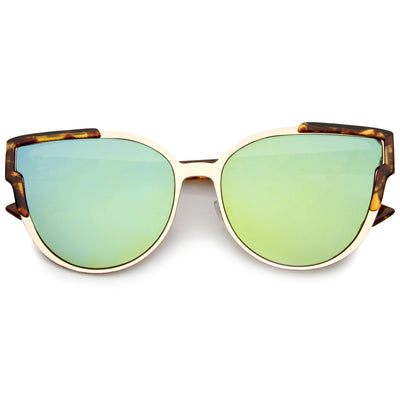 A classic cat eye design with a modern twist, these luxurious cat eye sunglasses feature a slim metal frame with acetate temples and horn rimmed details. Stunning colored mirrored flat lenses give these sunglasses an eye-catching and fashion forward appeal. Pair it with your favorite outfits for a chic and bold look. Made with a metal and plastic based frame, English style nose pieces, metal hinges, and reflective UV400 protective lenses.