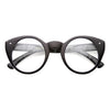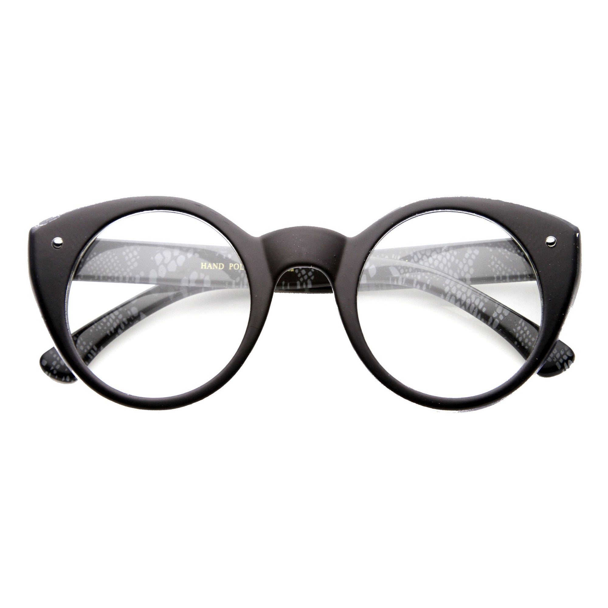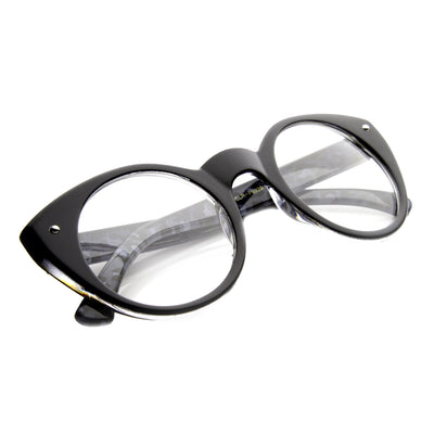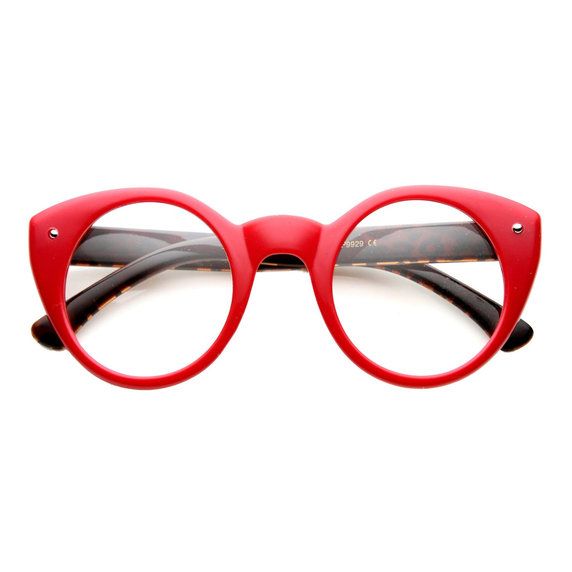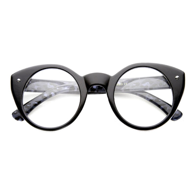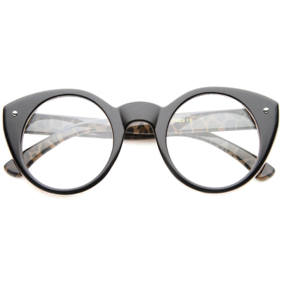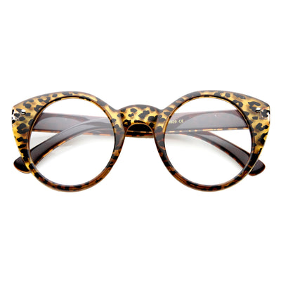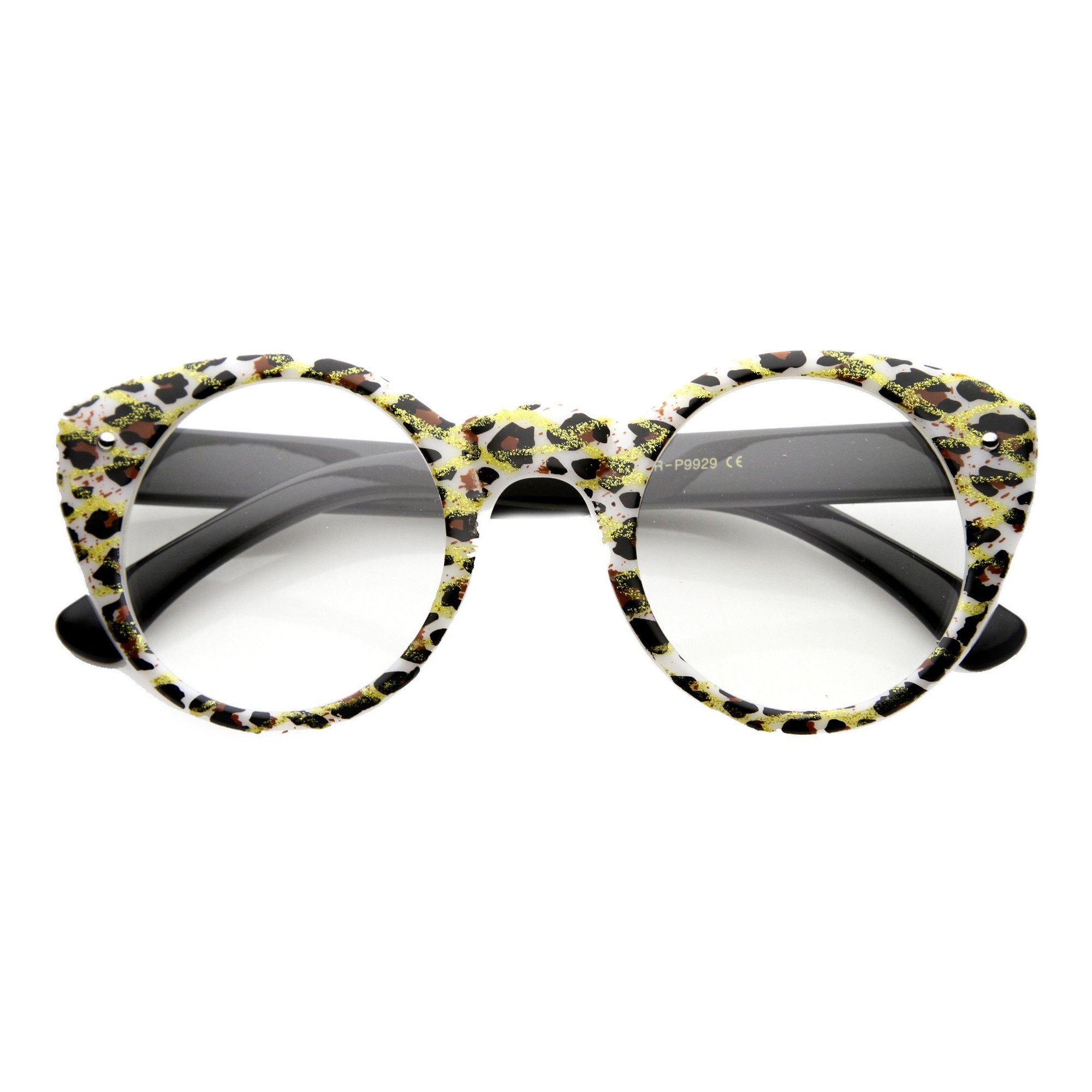 A distinct bold version of 50s-inspired cat eye glasses with high pointed corners features stylish and colorful animal print patterns. You'll find they can work with many outfits, from the very modern to the utterly vintage. Made with a plastic based frame, metal hinges and clear polycarbonate UV protected lenses.