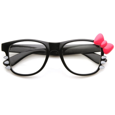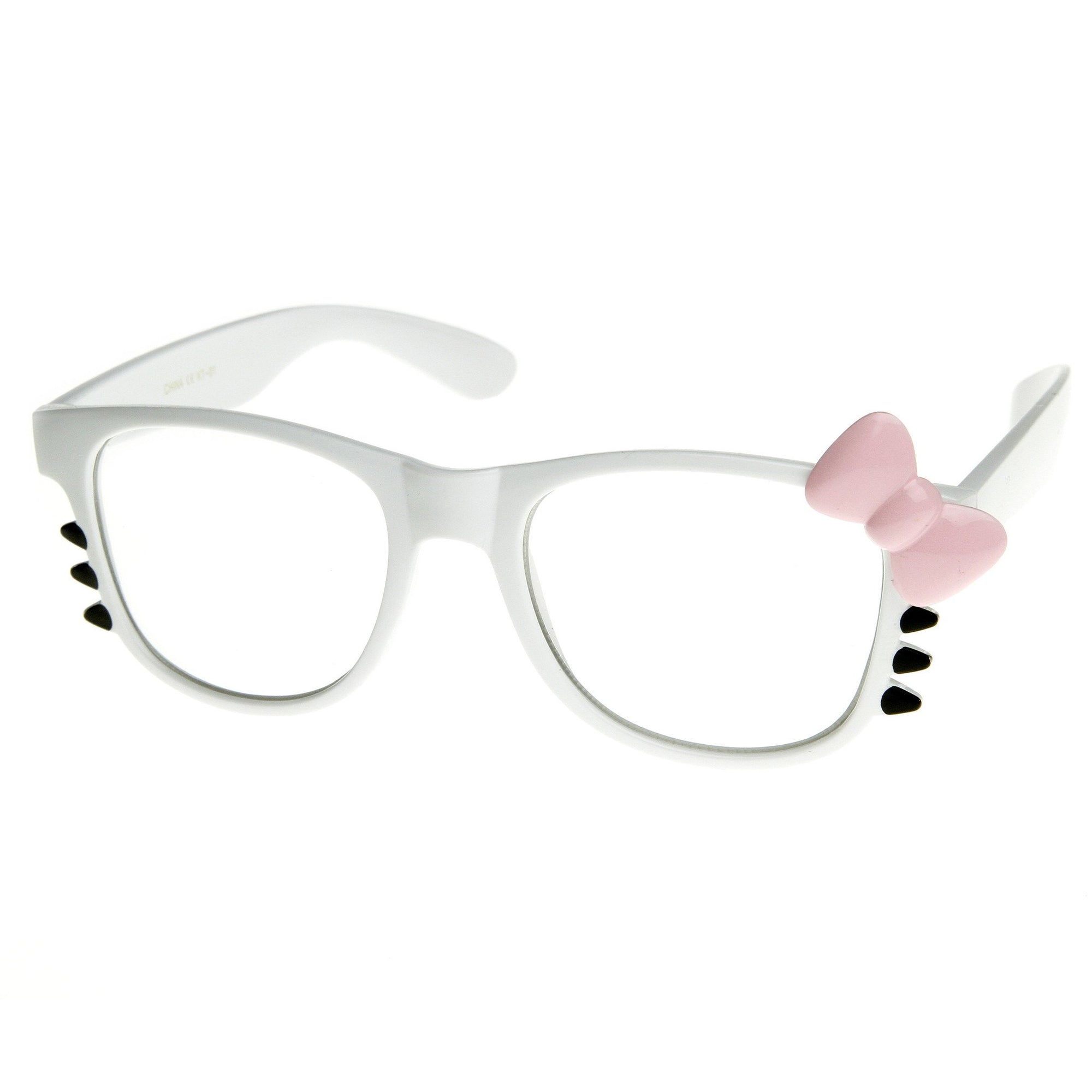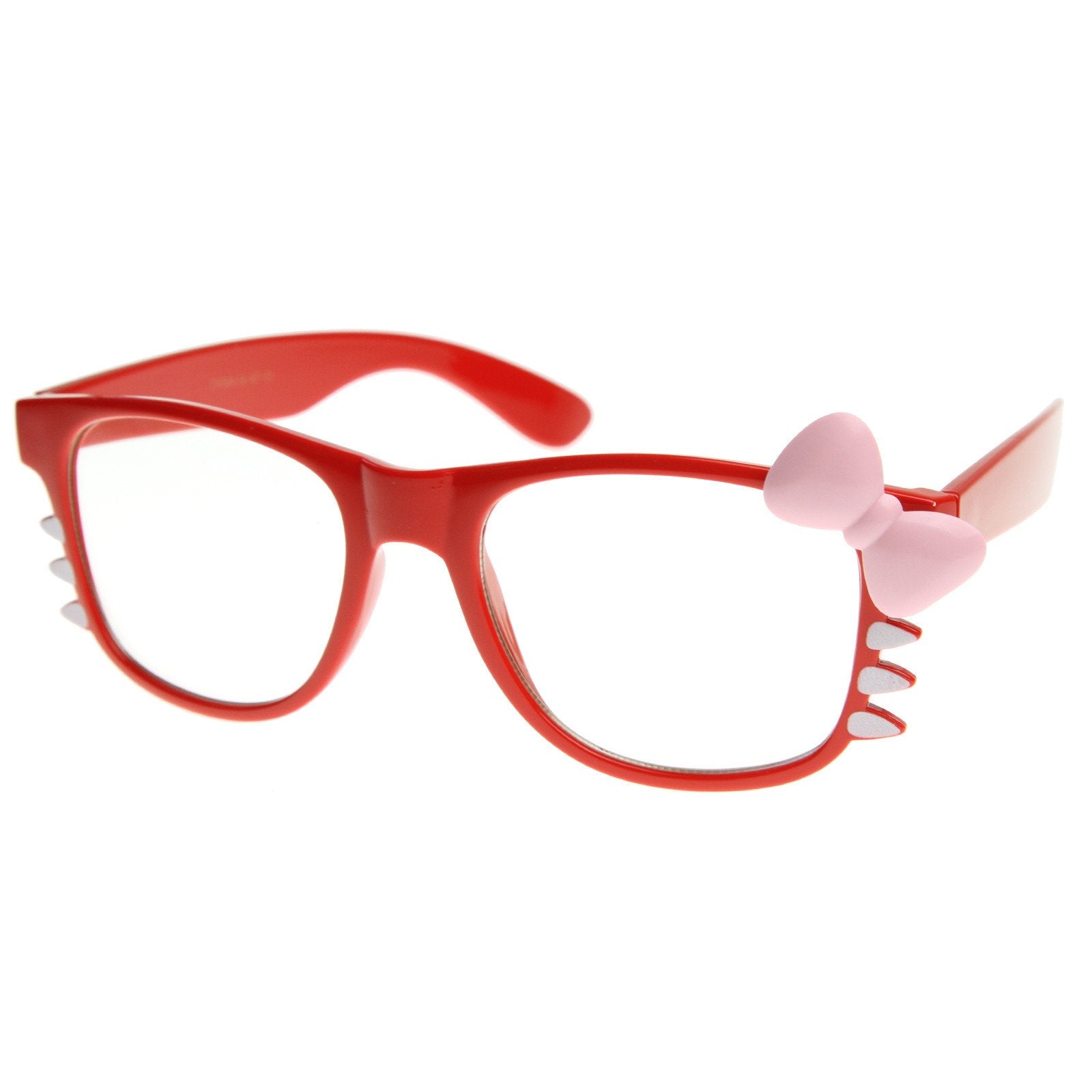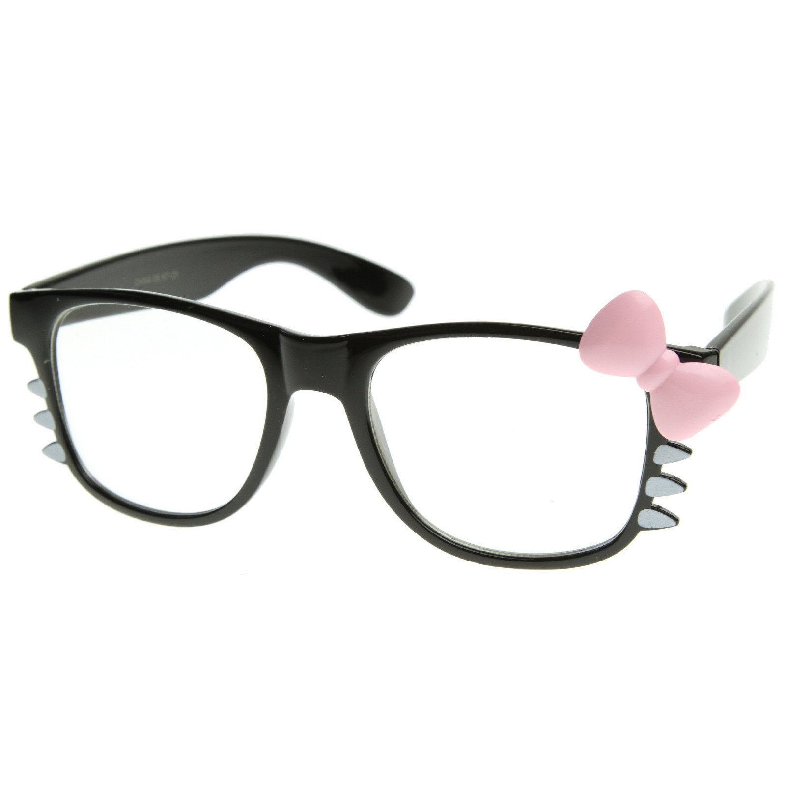 • Super cute vintage inspired horned rim glasses that features an adorable kitty bow on the left temple and whiskers on the sides of the frame. These sassy glasses are a must have for any Kitty Collection! Made with metal hinges and clear polycarbonate UV protected lens.