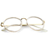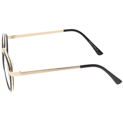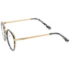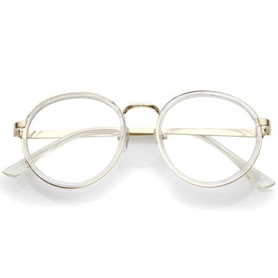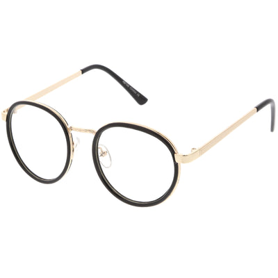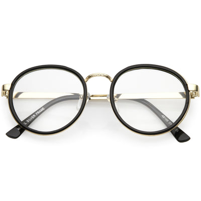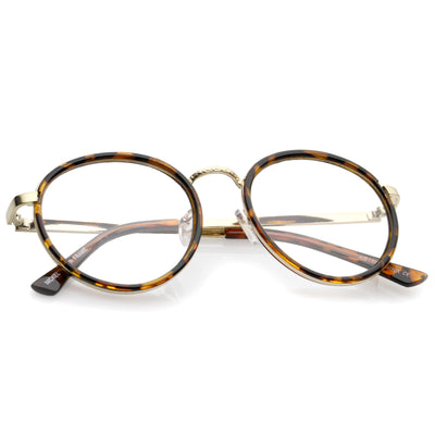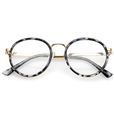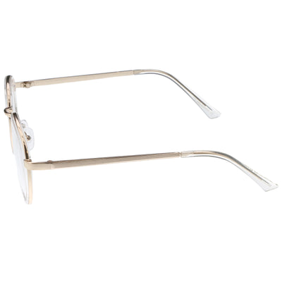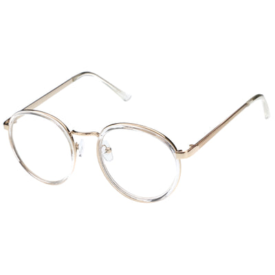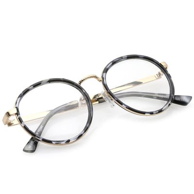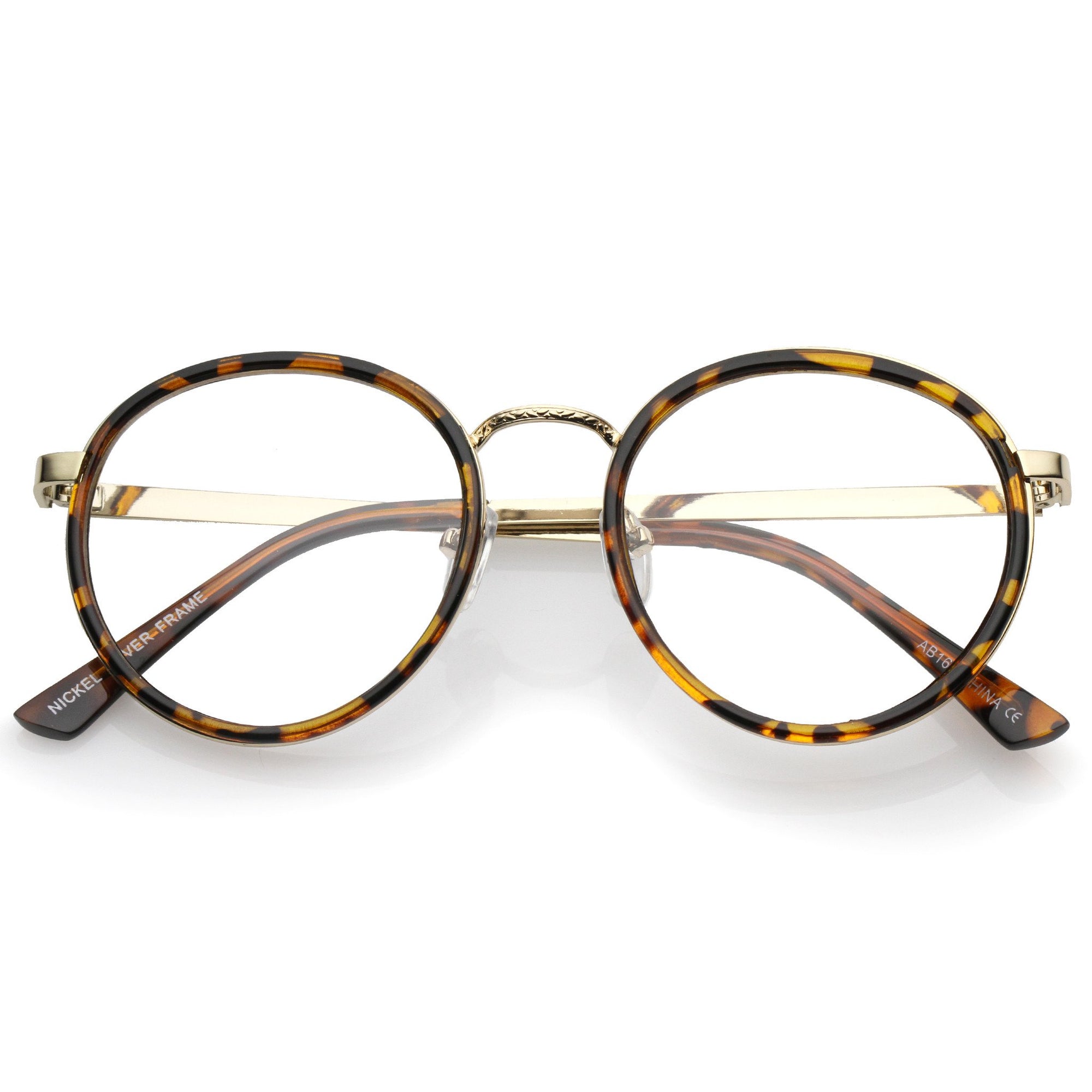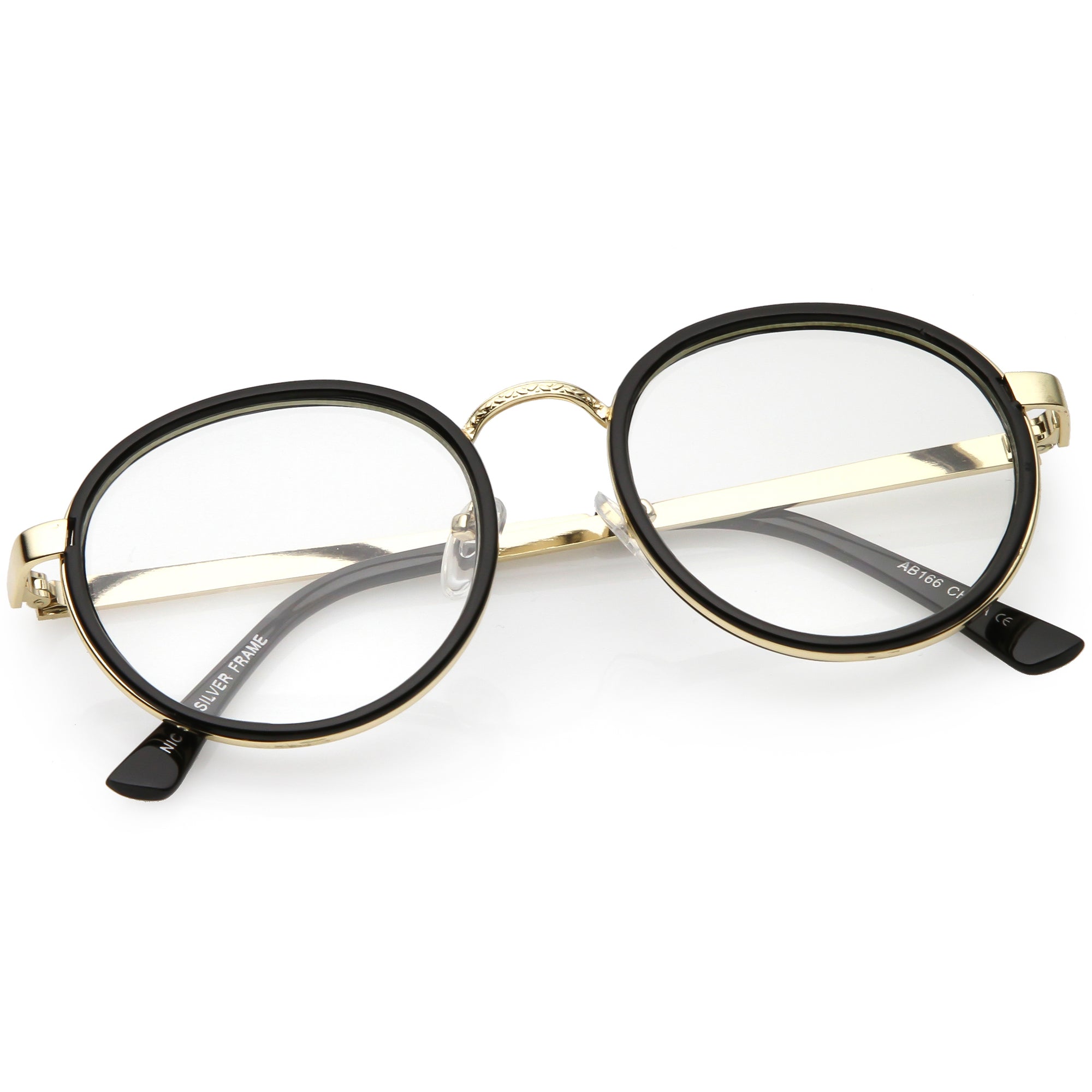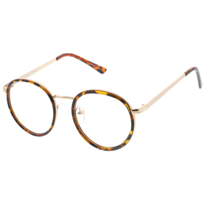 Add a sophisticated accent to your look with theses metal round eyeglasses. Featuring an etched metal nose piece and slim temples, these classic glasses are complete with clear round lenses. Minimal and effortless, these round eyeglasses are perfect for everyday wear. Made with a metal and plastic based frame, English style nose pieces, metal hinges, and polycarbonate UV400 clear lenses.