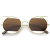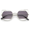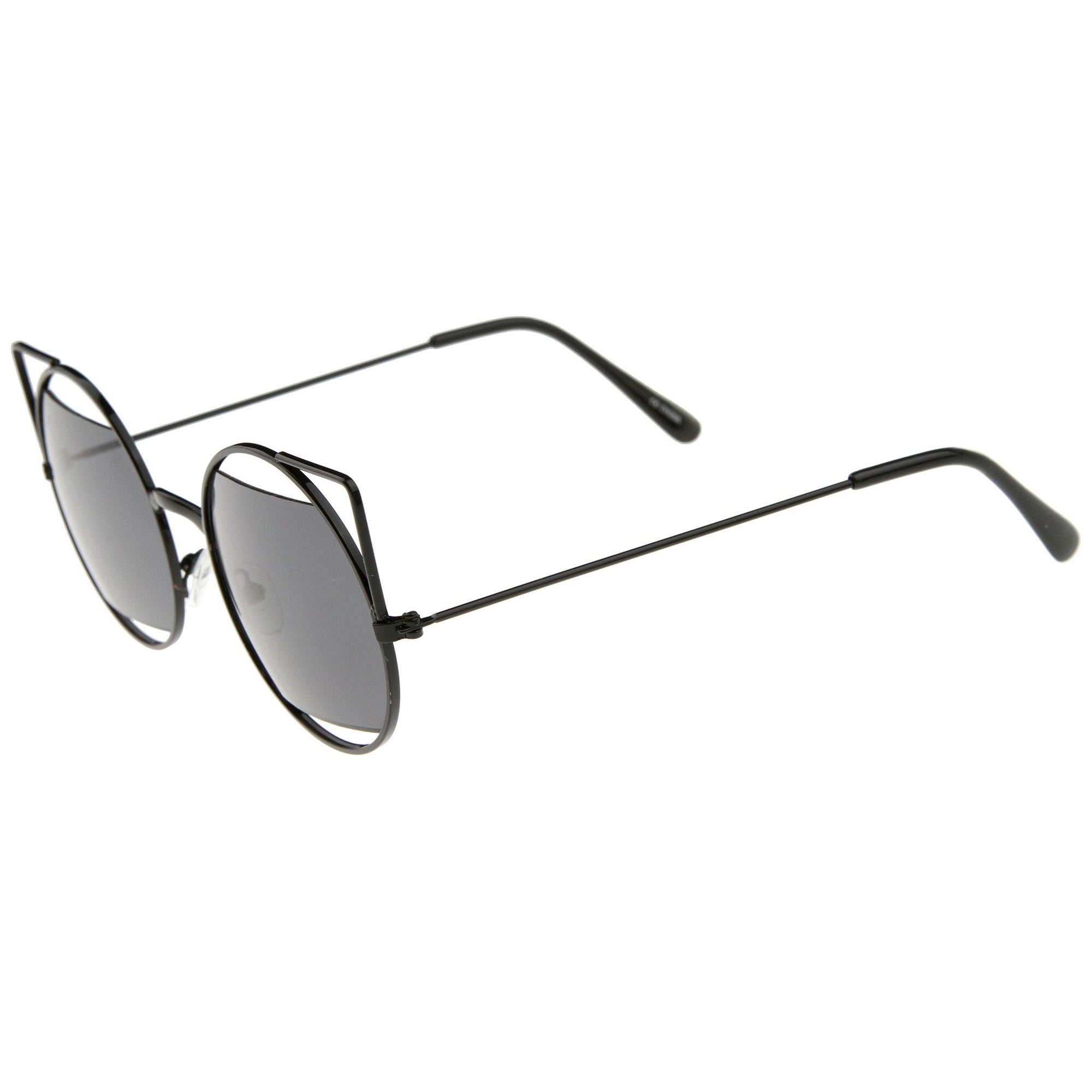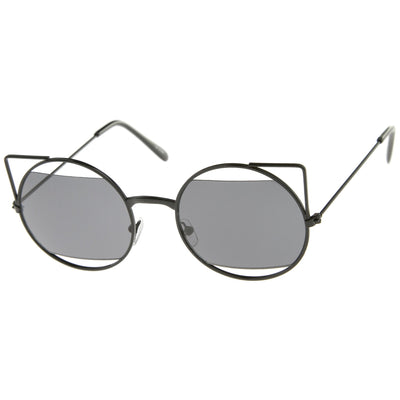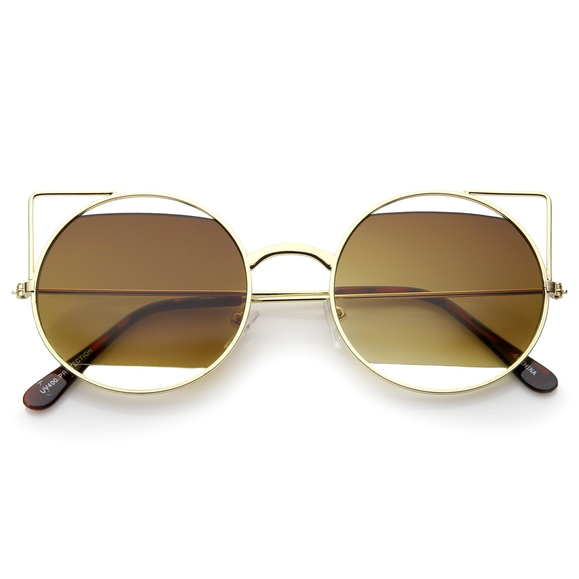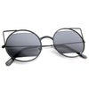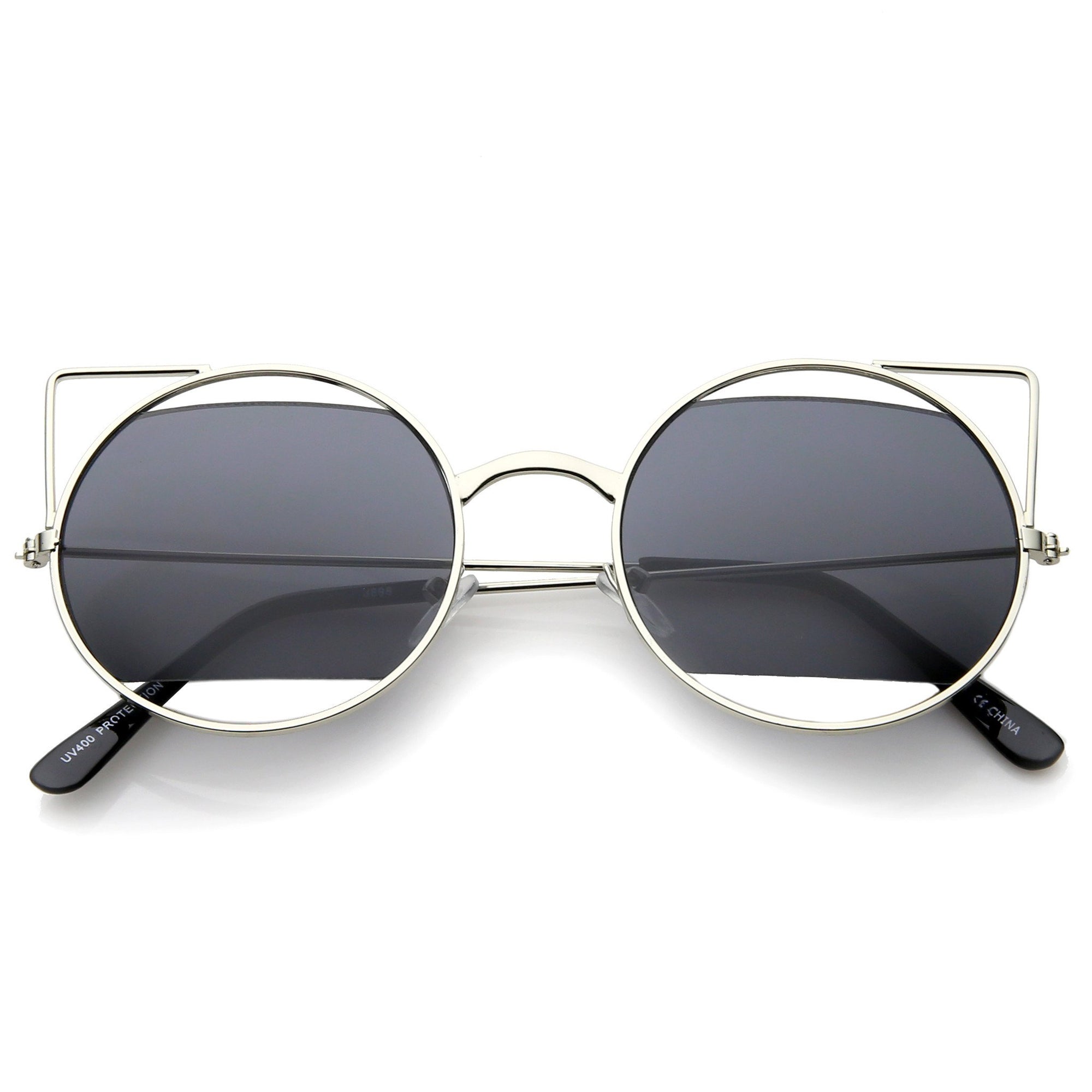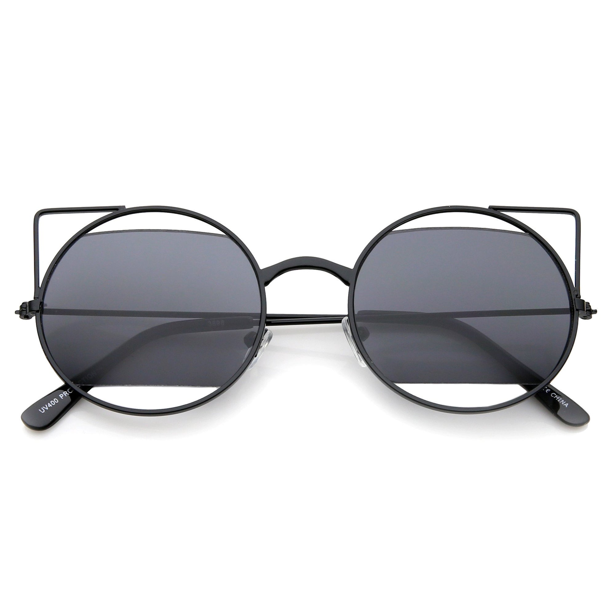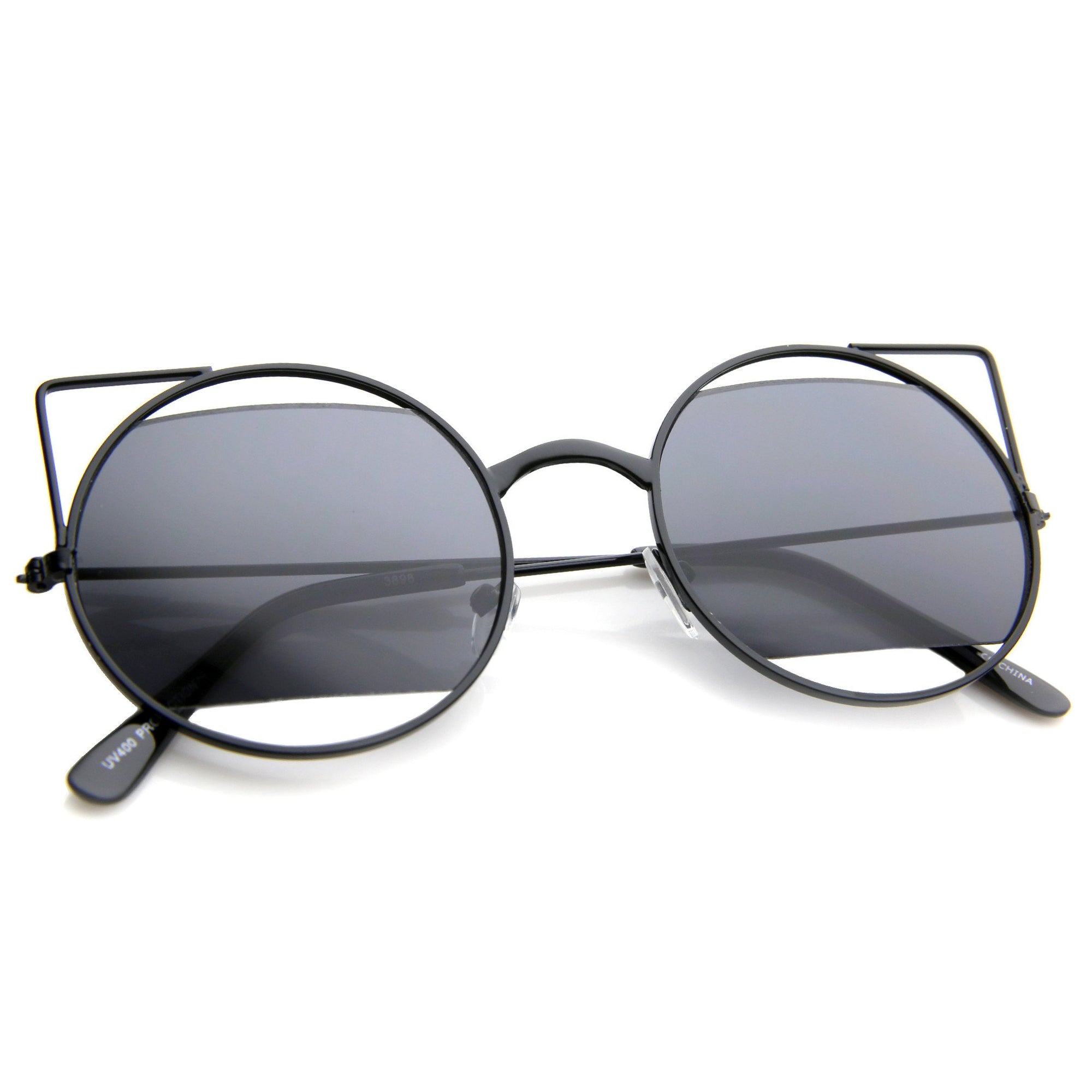 • Daring and chic, these round cat eye sunglasses are crafted with a full metal open frame design for a lightweight and sleek look. Stylish neutral-colored lenses add to it's wearable appeal, while its exaggerated cat eye silhouette give it a feminine touch. Style these cat eye sunglasses with your favorite looks for an outfit worthy of a double take. Made with a metal based frame, English style nose pieces, metal hinges, and reflective UV400 polycarbonate lenses.