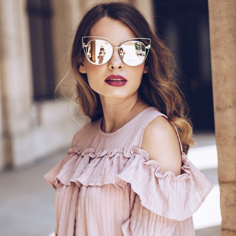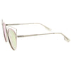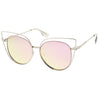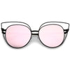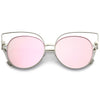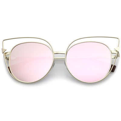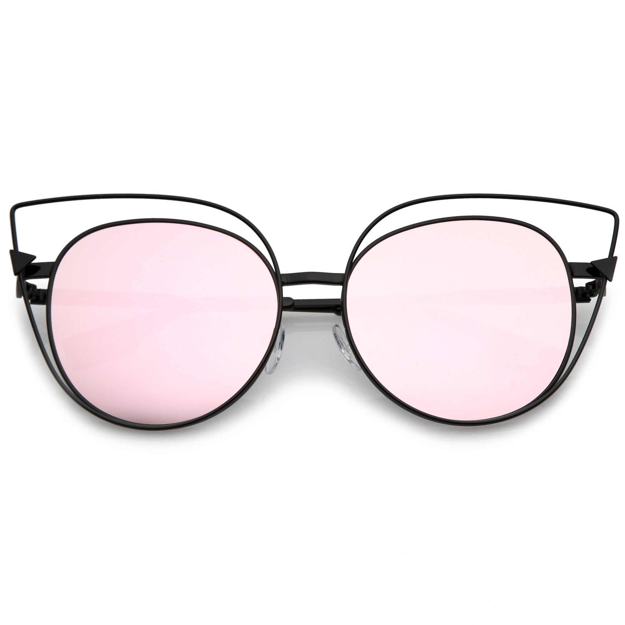 Chic and effortless, these metal cat eye sunglasses are designed with an oversized high point silhouette and unique cutout details. Complete with arrow accents at the sides and pink colored mirror flat lenses, these sophisticated cat eye sunglasses are sure to make a fashion statement. Style it with your favorite outfits for an added touch of luxe. Made with a metal based frame, English style nose pieces, metal hinges, and reflective UV400 protected lenses.