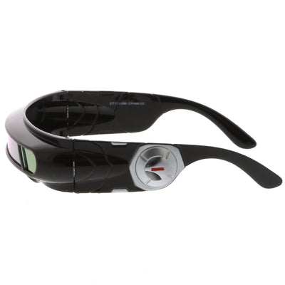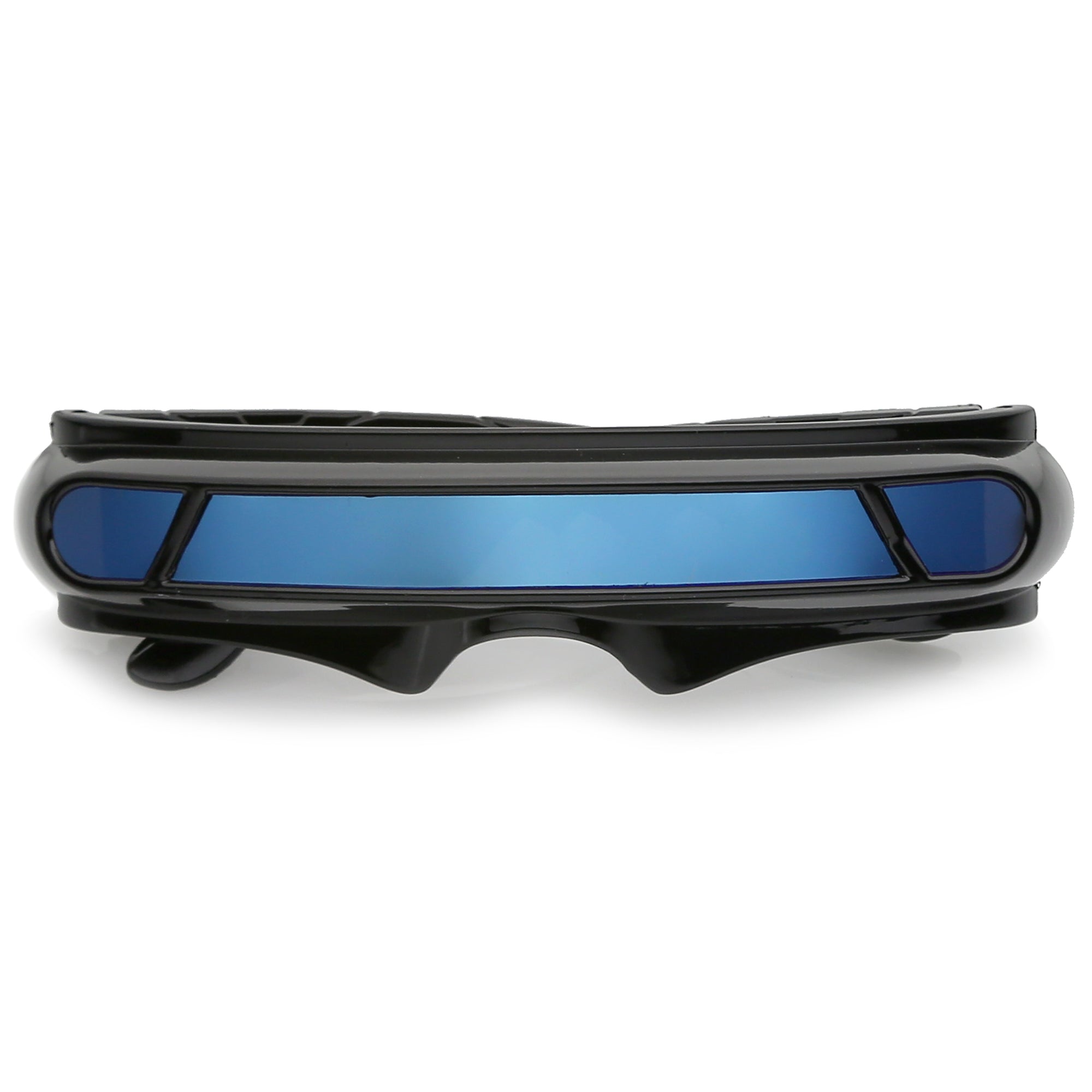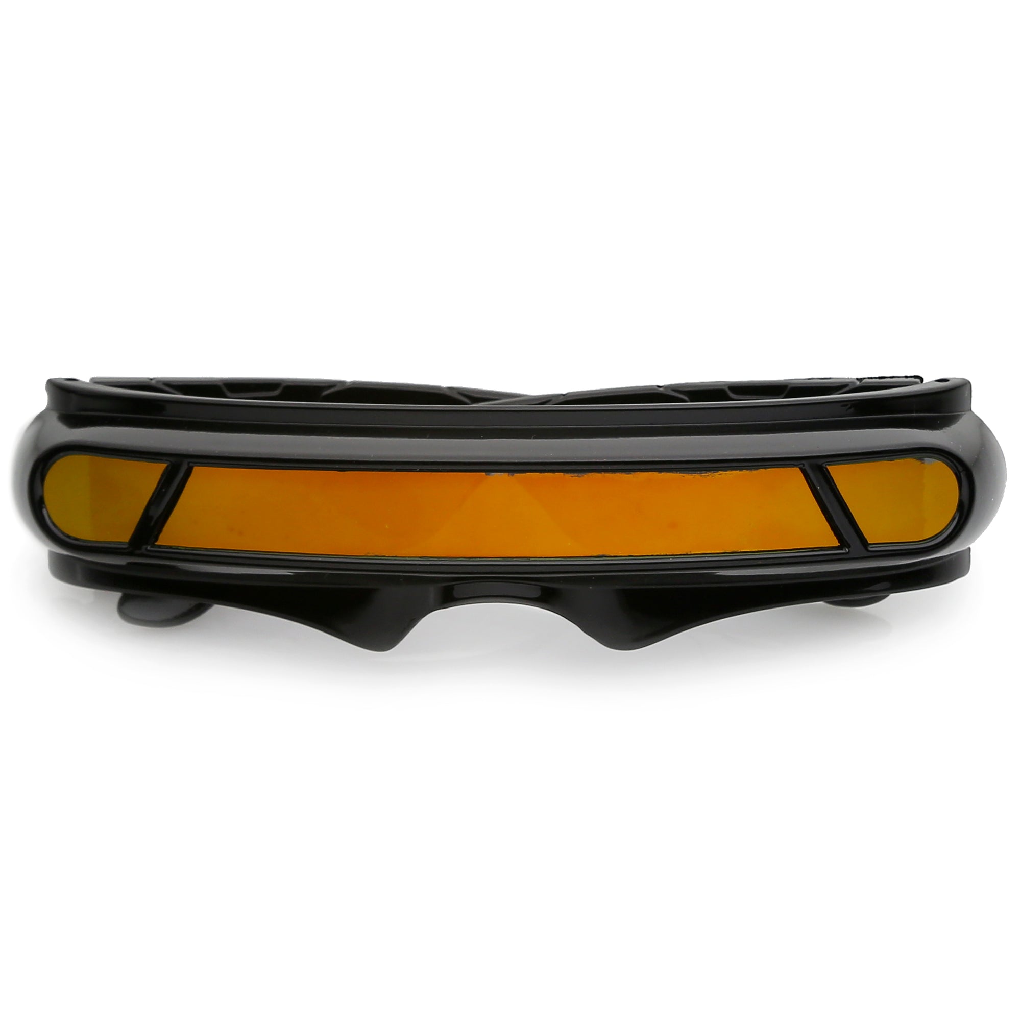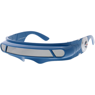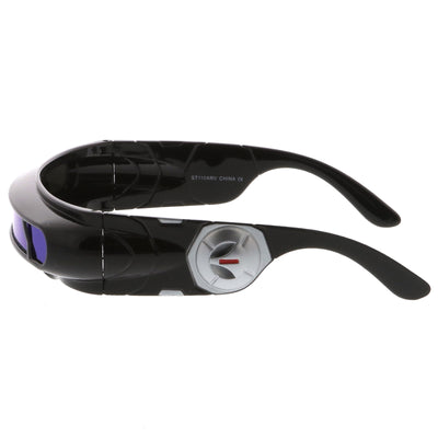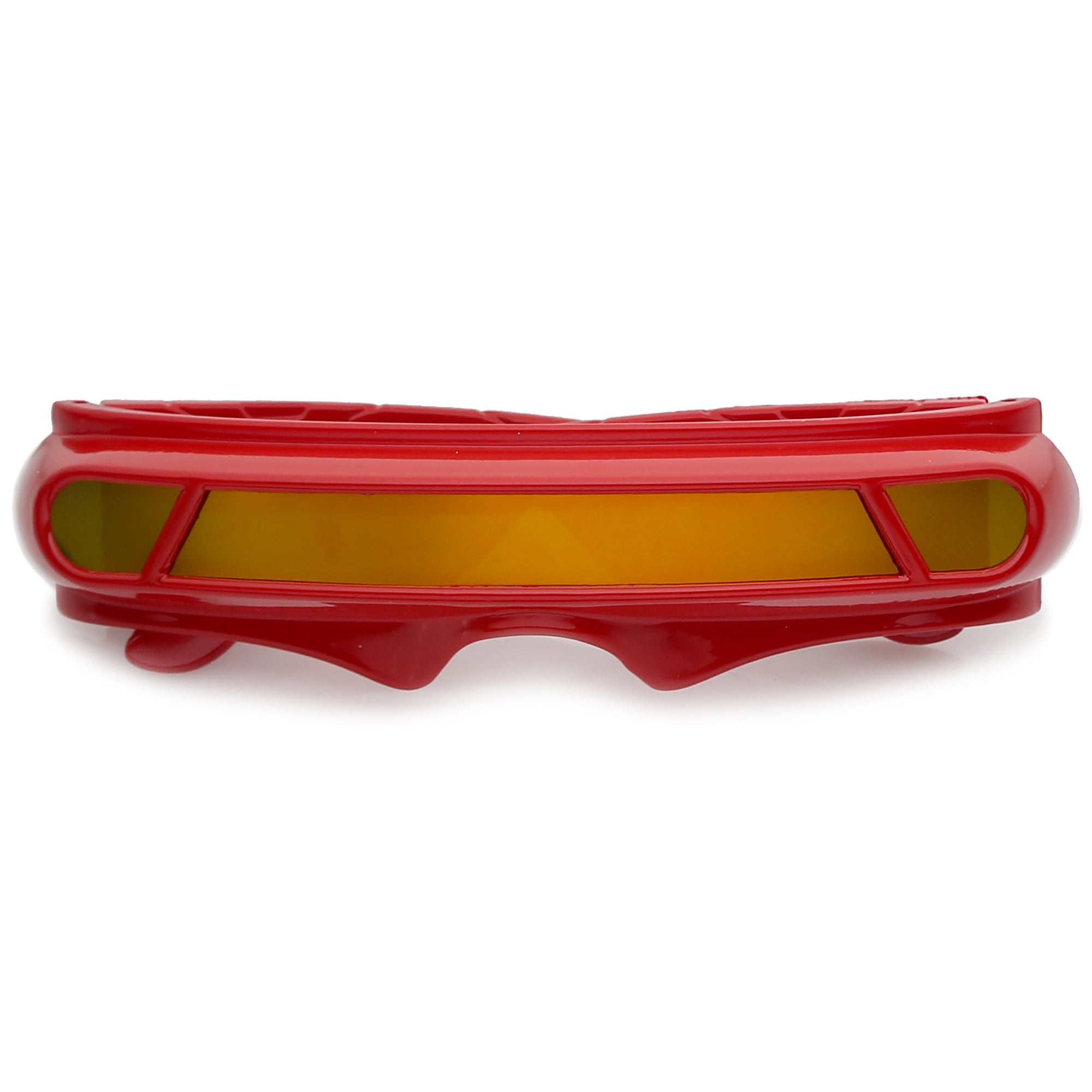The finishing accessory to a futuristic costume or party, these wrap sunglasses are designed with a colored mirror mono lens for a bold effect. Accented with novelty details at the wide temples, these shield wrap sunglasses will surely complement any unique look. Made with a plastic based frame, metal hinges, and reflective UV400 protected lenses.