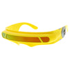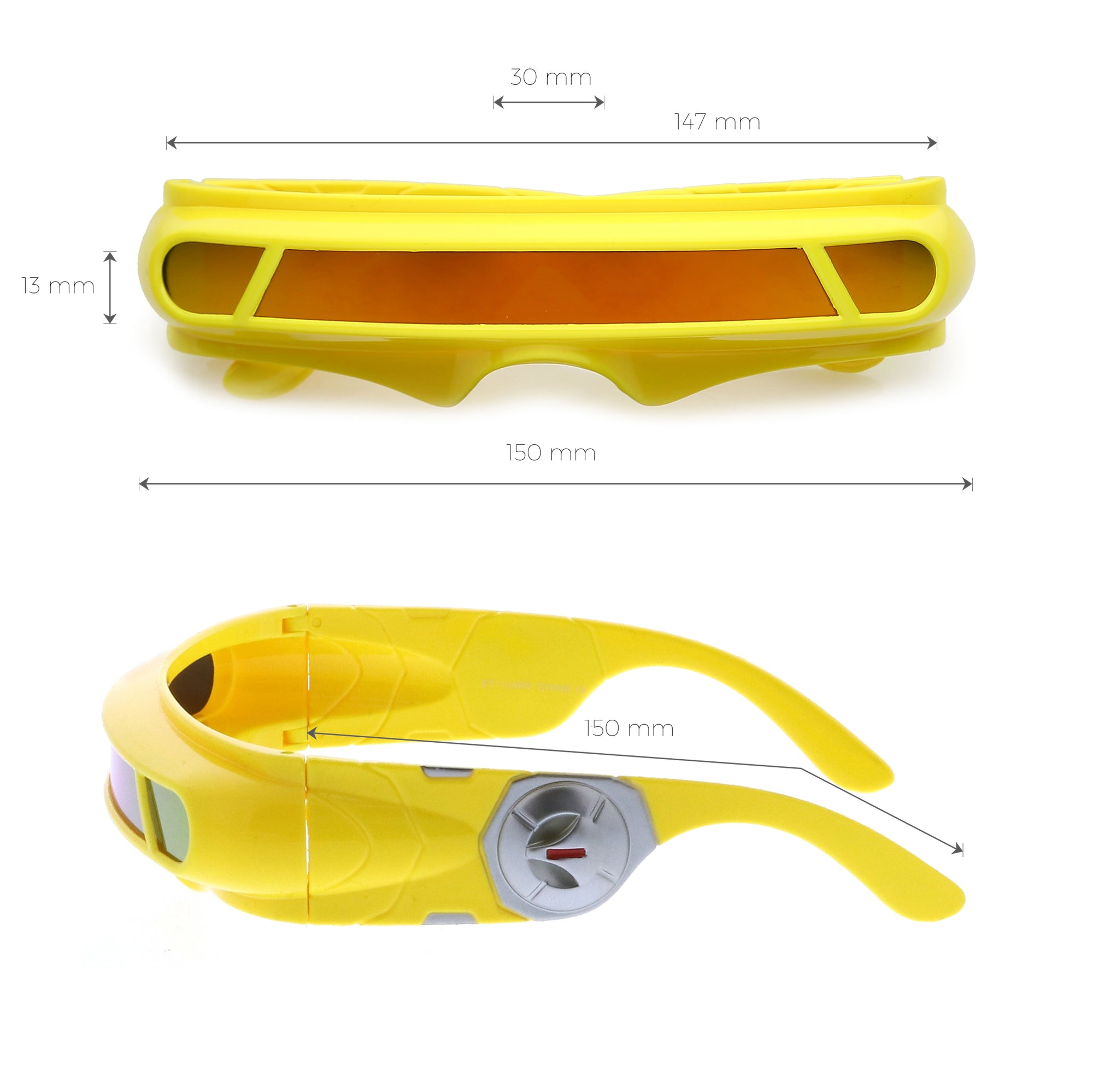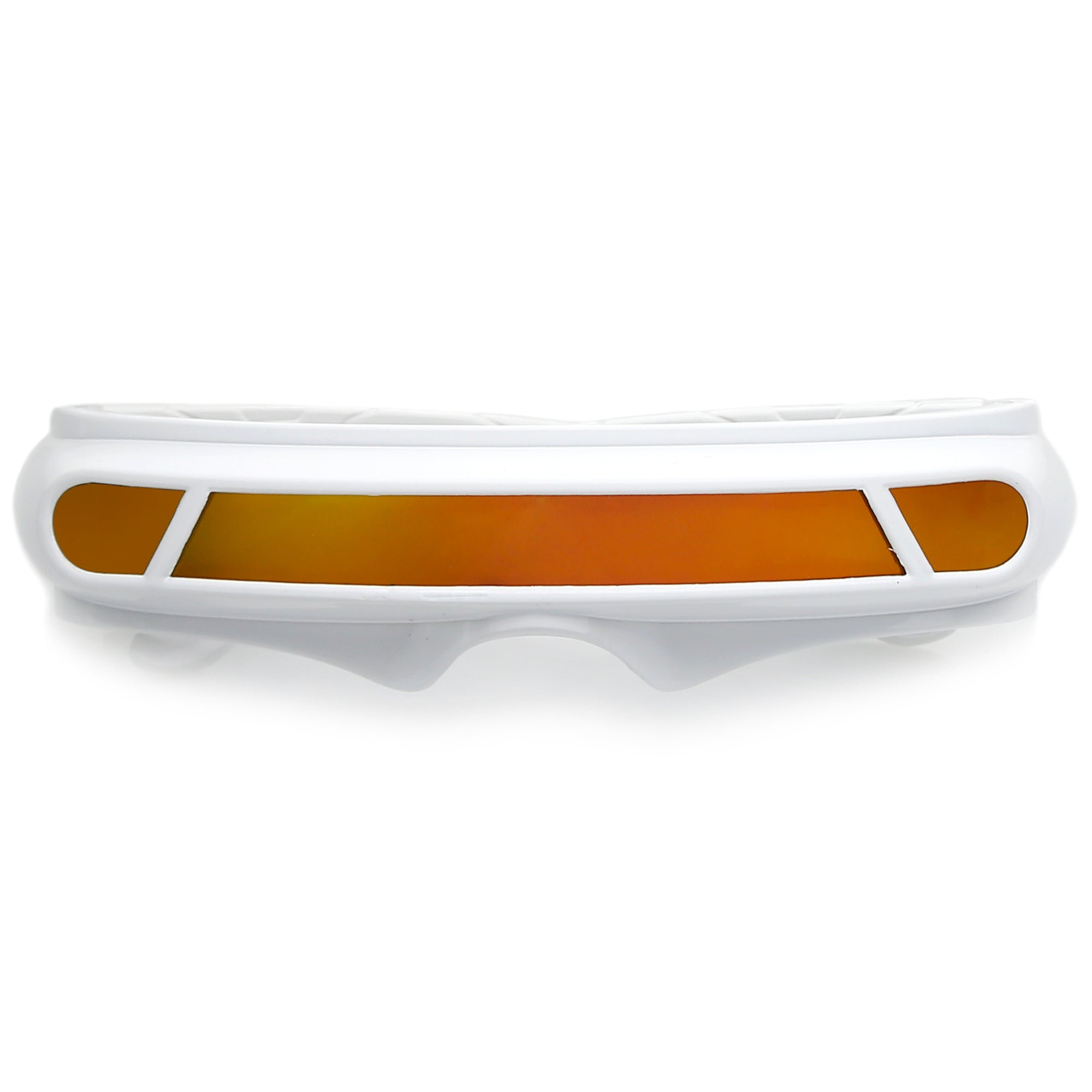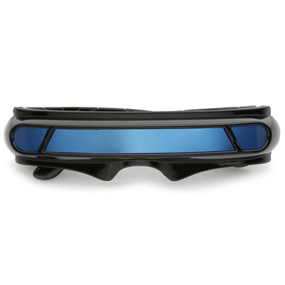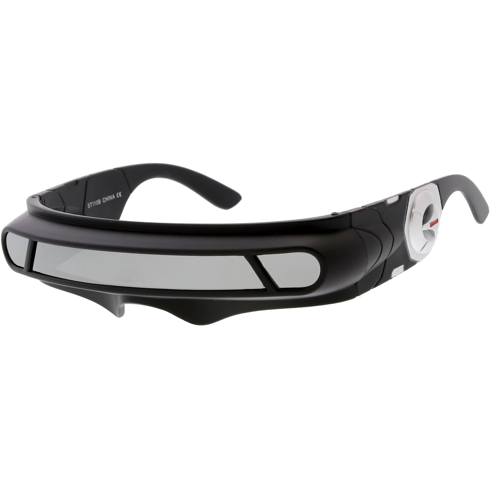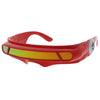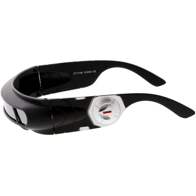The finishing accessory to a futuristic costume or party, these wrap sunglasses are designed with a colored mirror mono lens for a bold effect. Accented with novelty details at the wide temples, these shield wrap sunglasses will surely complement any unique look. Made with a plastic based frame, metal hinges, and reflective UV400 protected lenses.