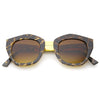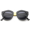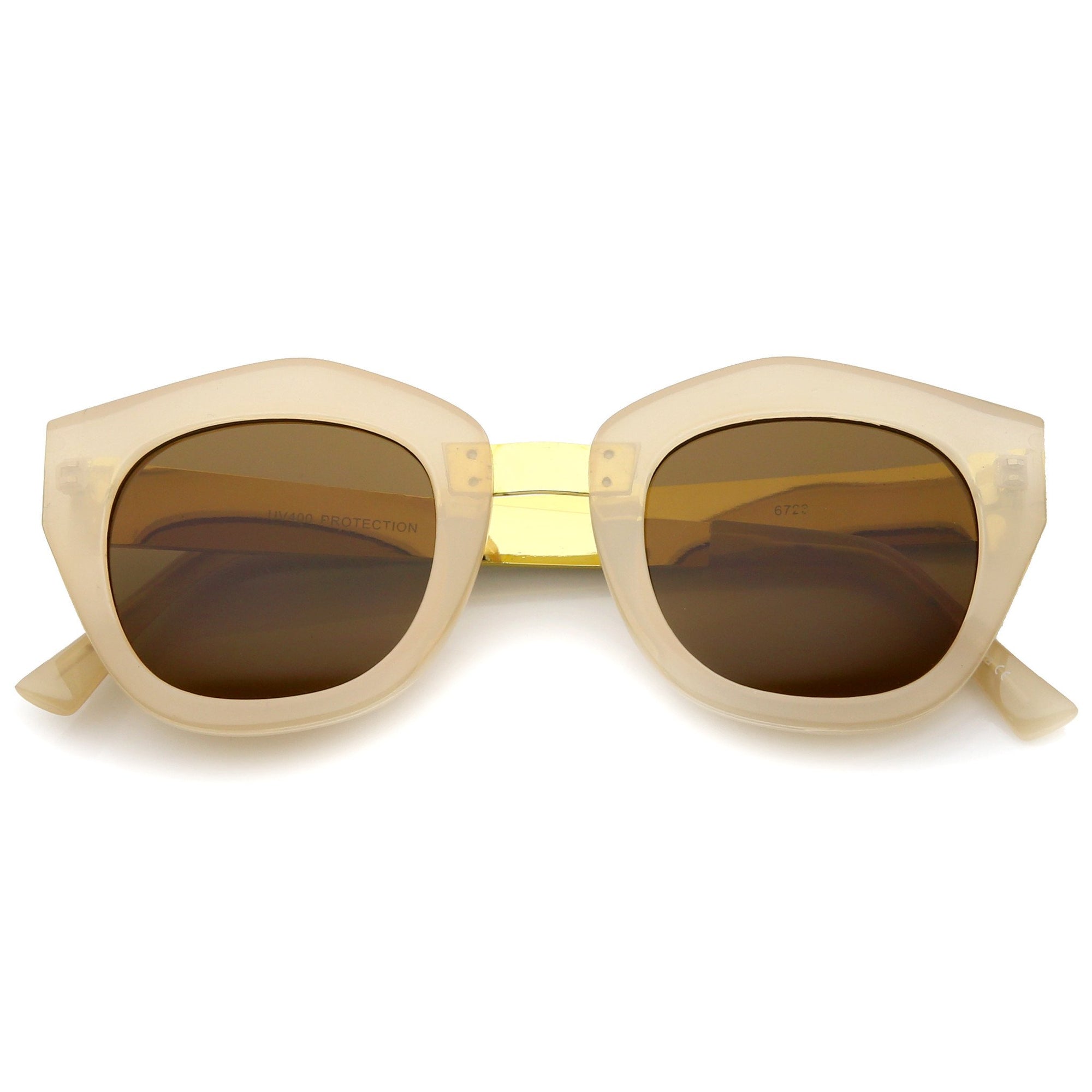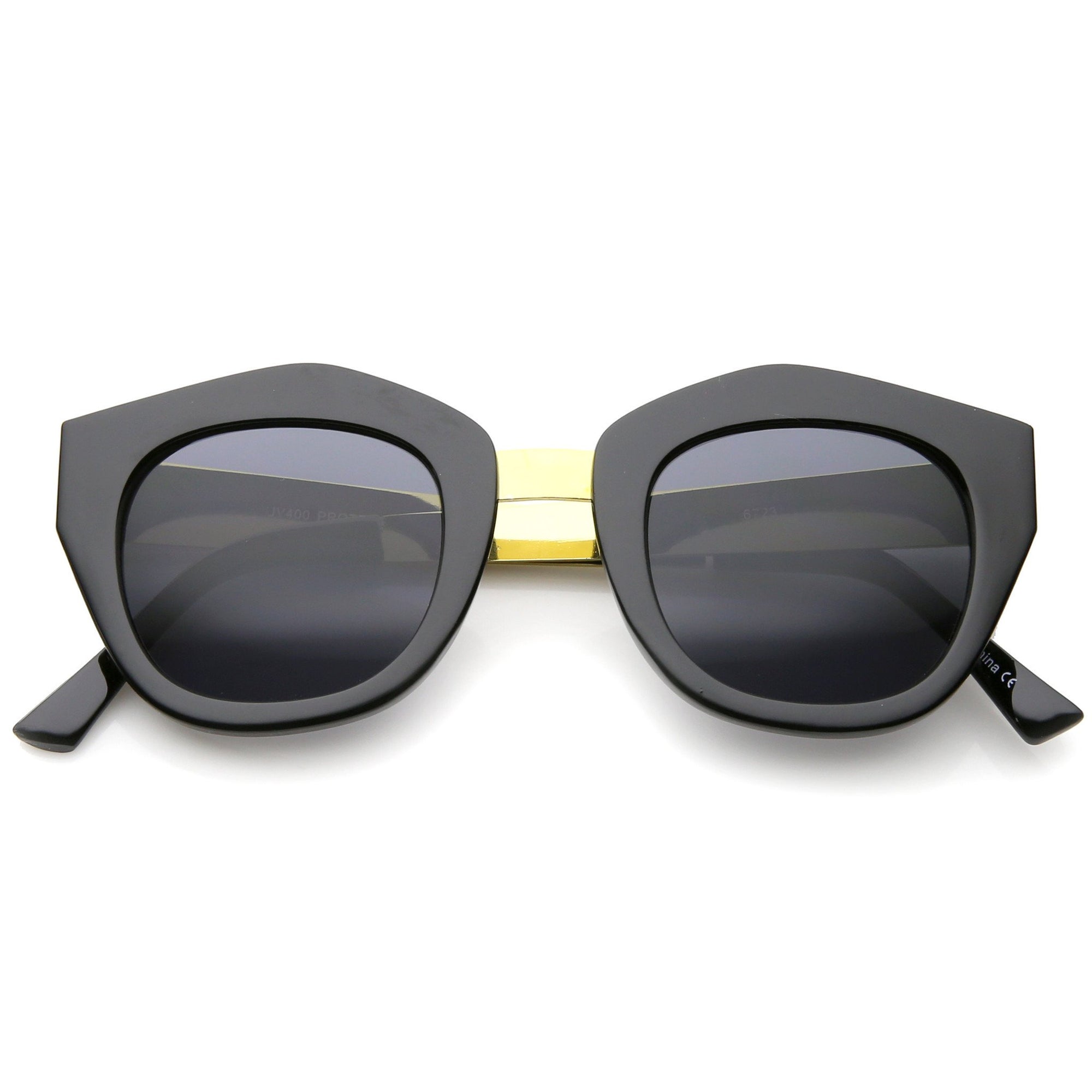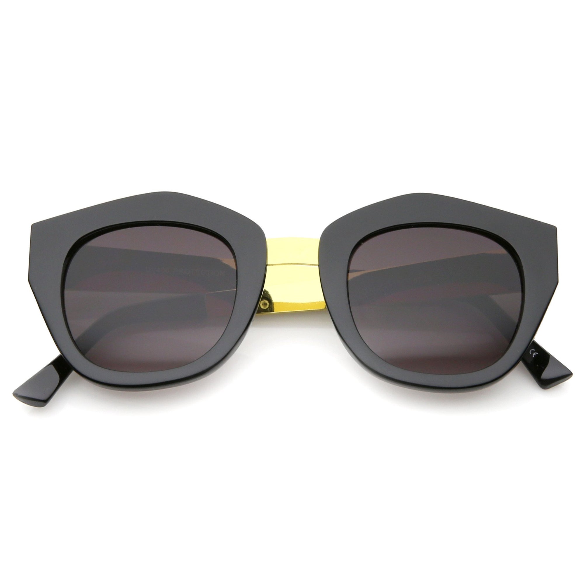 • A modern take on the classic cat eye silhouette, these chic sunglasses feature a geometric cat eye shape with square lenses in neutral hues. A gold nose bridge and stylishly wide gold and black temples give these sunglasses an elegant and luxurious feel. Style these angular-shaped sunglasses with your favorite outfits for added sophistication. Made with a plastic and metal based frame, reinforced metal hinges, and polycarbonate UV400 lenses.