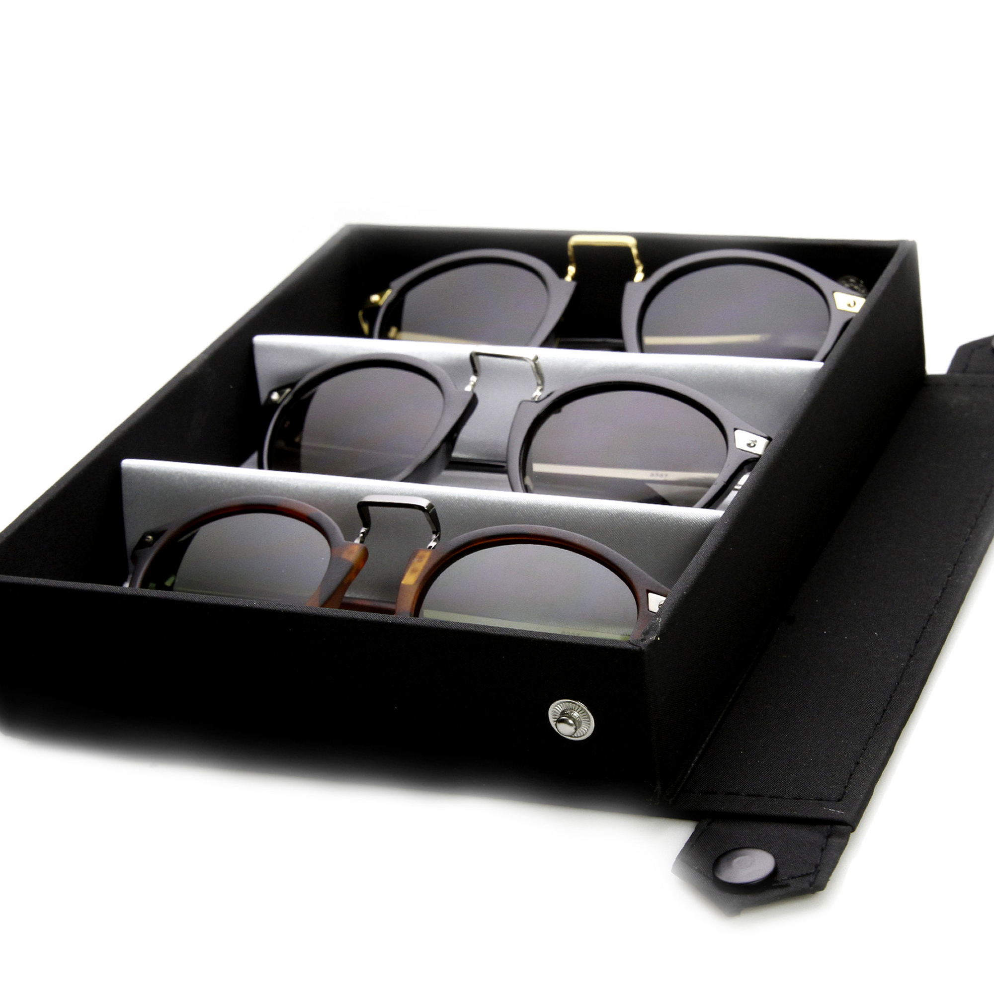 • Limited edition travel case set. Classy round p-3 horned rim shaped frame made from black acetate with a prominent metal nose bridge that projects in front of the frame. Features metal arms and metal hinges. Made with an acetate and polycarbonate UV protected lenses.