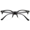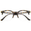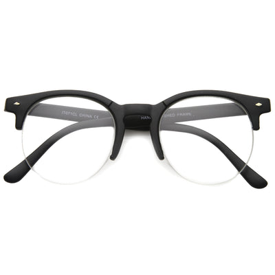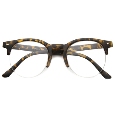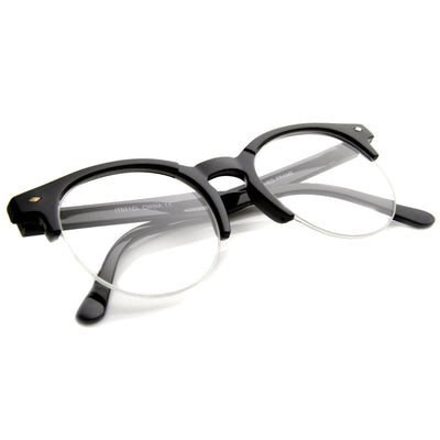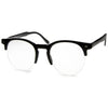 Unique round half frame that features high pointed temples creating an elegant cat eye silhouette. Frame is made with a plastic brow and arms, metal wire lens lining and metal nose bridge. Features metal hinges, keyhole nose bridge, and clear UV protected lenses.