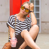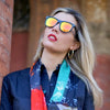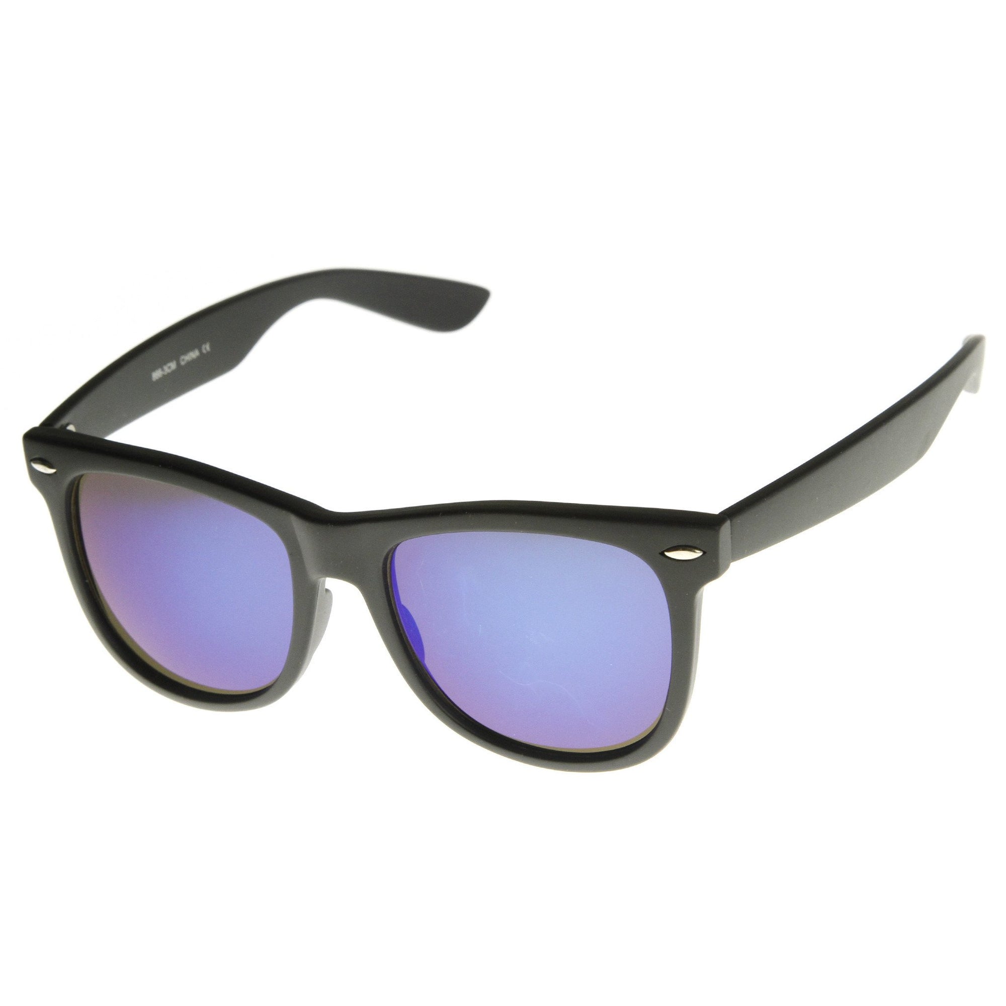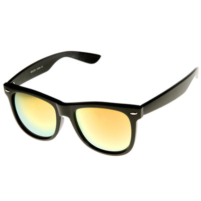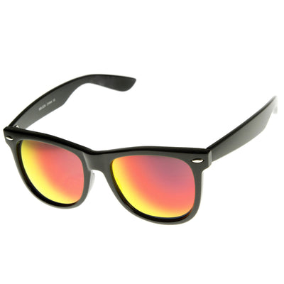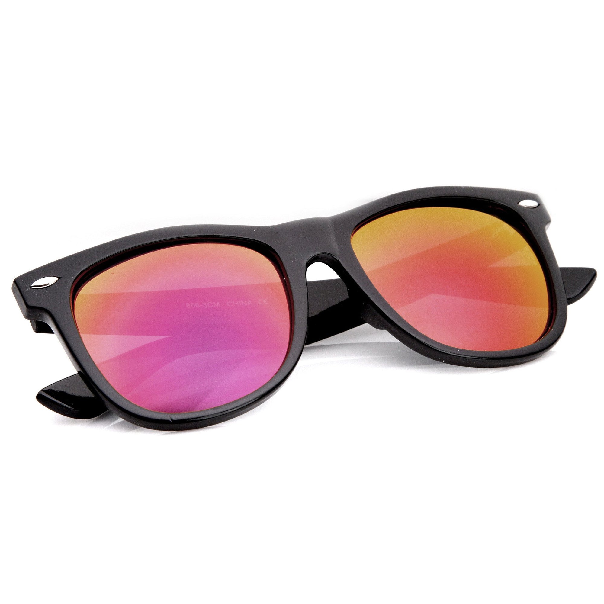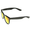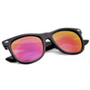 Slightly larger modified horned rim frame that features a colorful eye-catching mirrored lens. Bring on the sunny season in fun colorful fashion with these color flash lens horned rim sunglasses! Made with an plastic based frame, metal hinges and mirrored polycarbonate UV protected lenses.