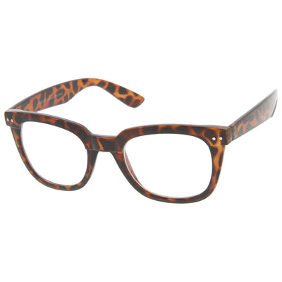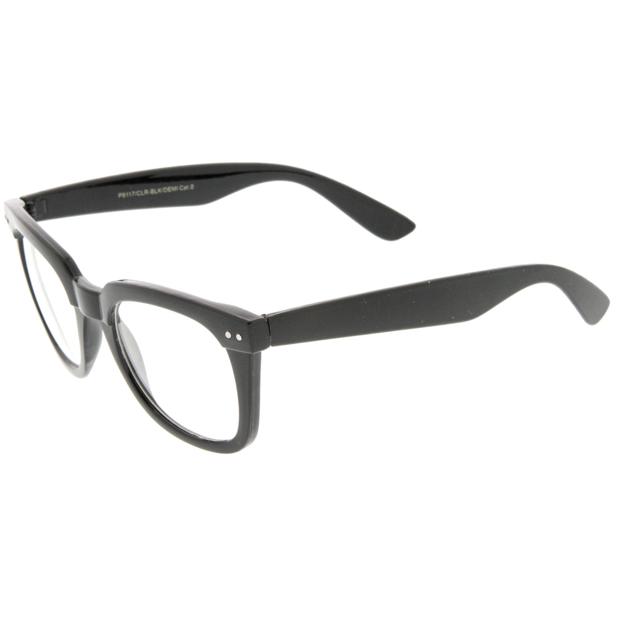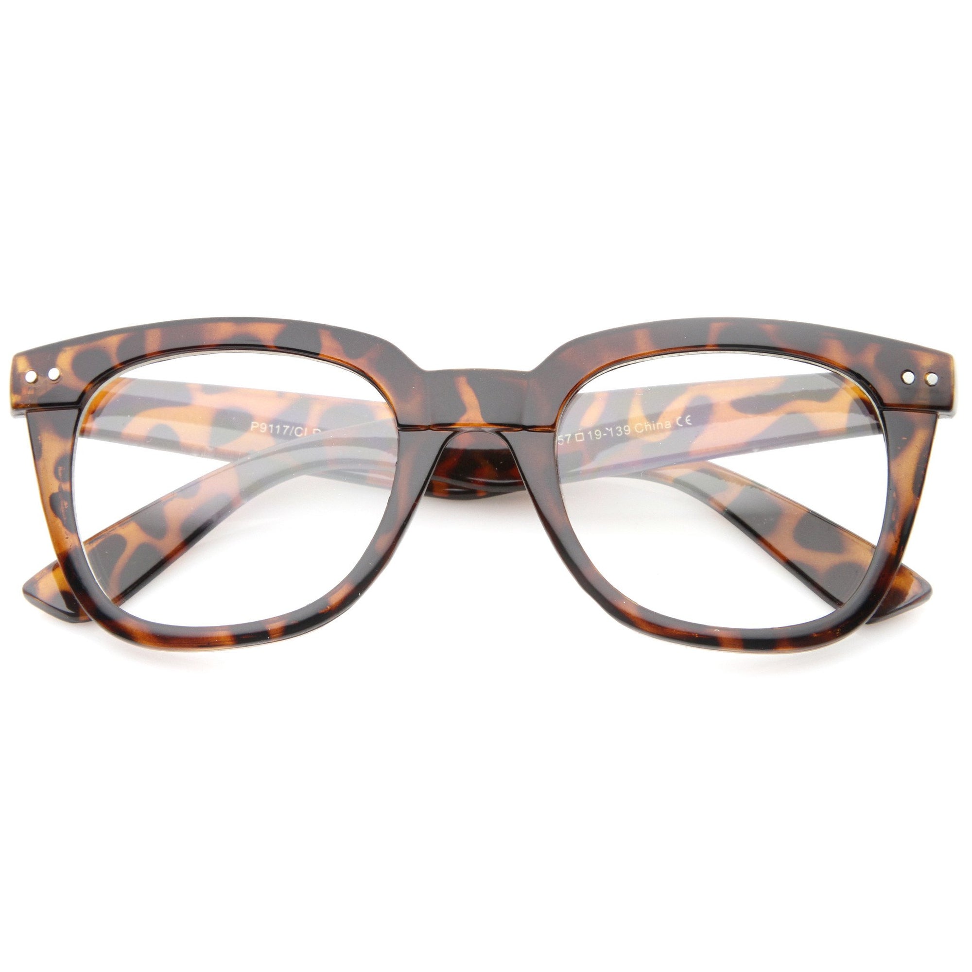• A classic style frame with a modern twist, these horn rimmed glasses are exquisitely crafted with a thick chunky frame for contemporary appeal and square clear lenses for a scholarly touch. Metal rivets at the temples and stylishly wide temples that sit high on the front frame complete this sophisticated style. A versatile look that can be worn everyday, these must-have horn rimmed glasses will become your go-to accessory. Made with a plastic based frame, metal hinges, and polycarbonate UV400 clear lenses.