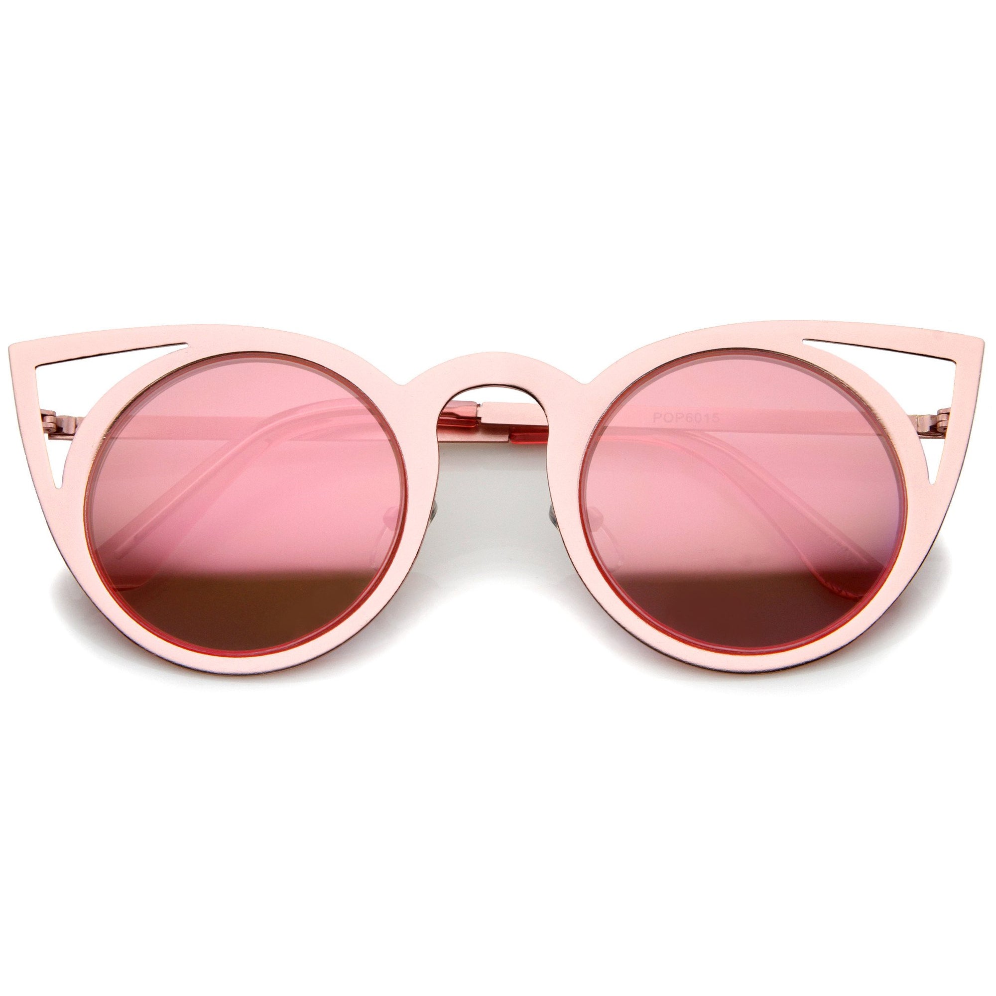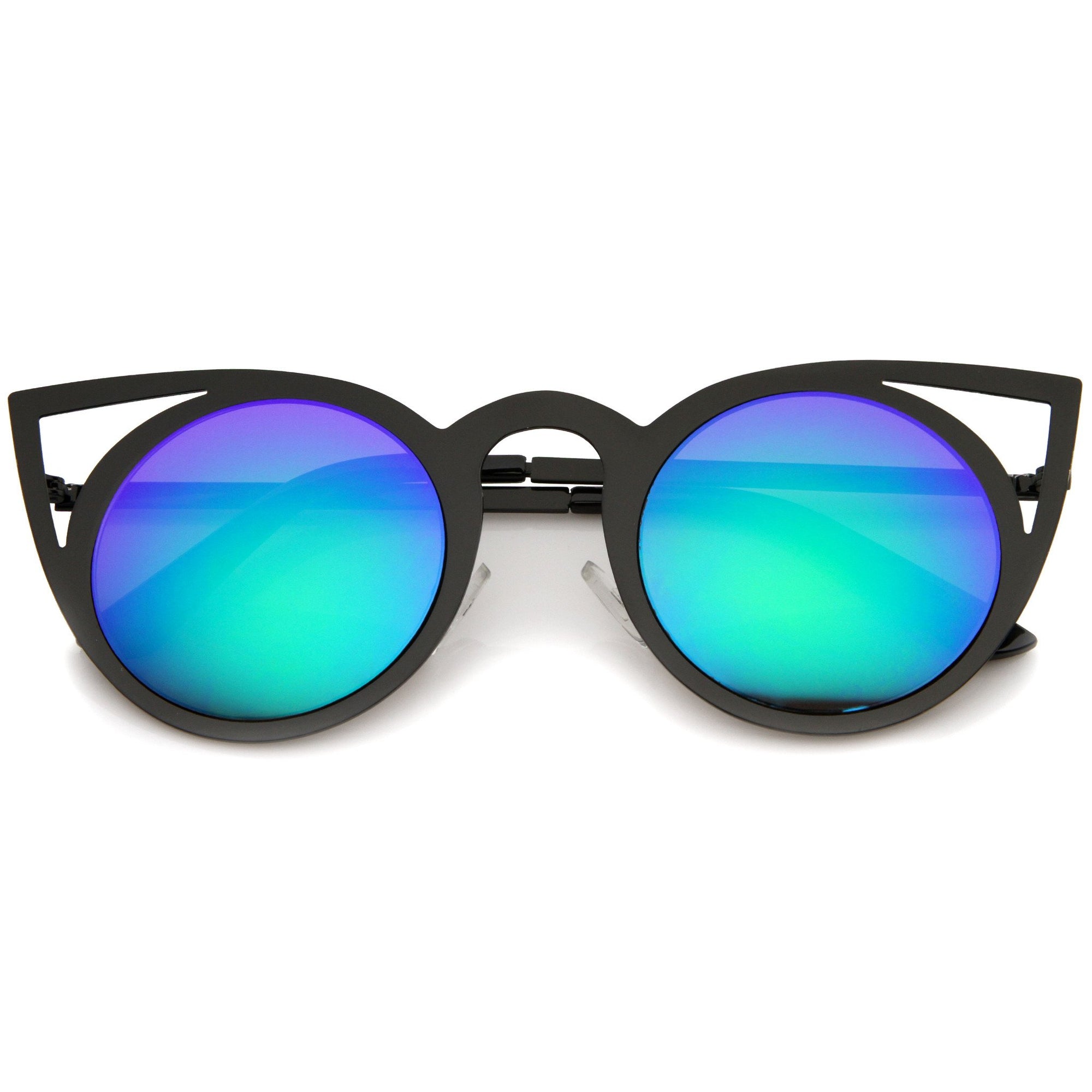 • Express your cattiness with these super adorable cutout metal accent cat-eye sunglasses featuring a thin metal frame and round lenses. The open metal frame and modern angles offer a very chic look to this season's collection. Made with a metal based frame, metal hinges, English style nose pieces and polycarbonate UV400 protected lenses.