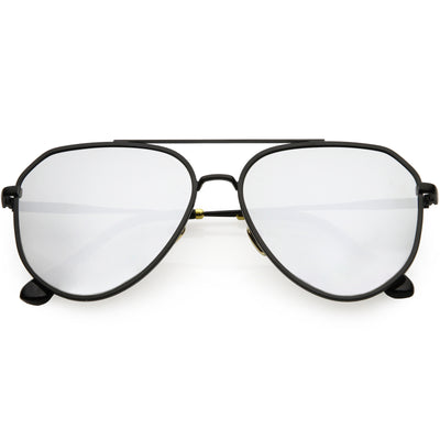 Make a bold statement in these metal aviator sunglasses crafted with an oversize frame and adjustable metal nose pieces for a luxurious look. Slim metal arms and crossbar add to it's minimal look, while colored mirror flat lenses give it it's pop of color. Great for everyday wear, these oversize aviator sunglasses truly elevate any outfit. Made with a metal based frame, metal hinges, and 100% UV protected lenses.