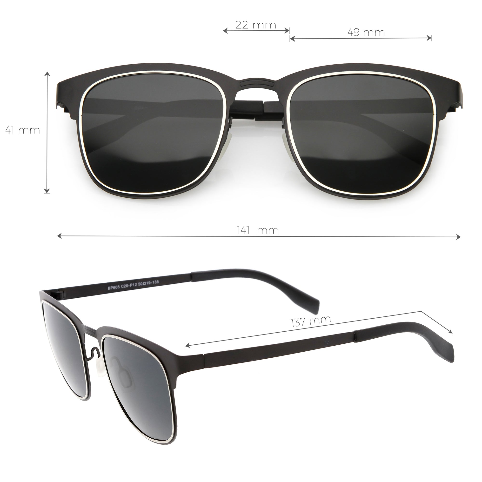 Lens Width: 49mm Nose Bridge: 22mm Lens Height: 41mm Total Width: 141mm