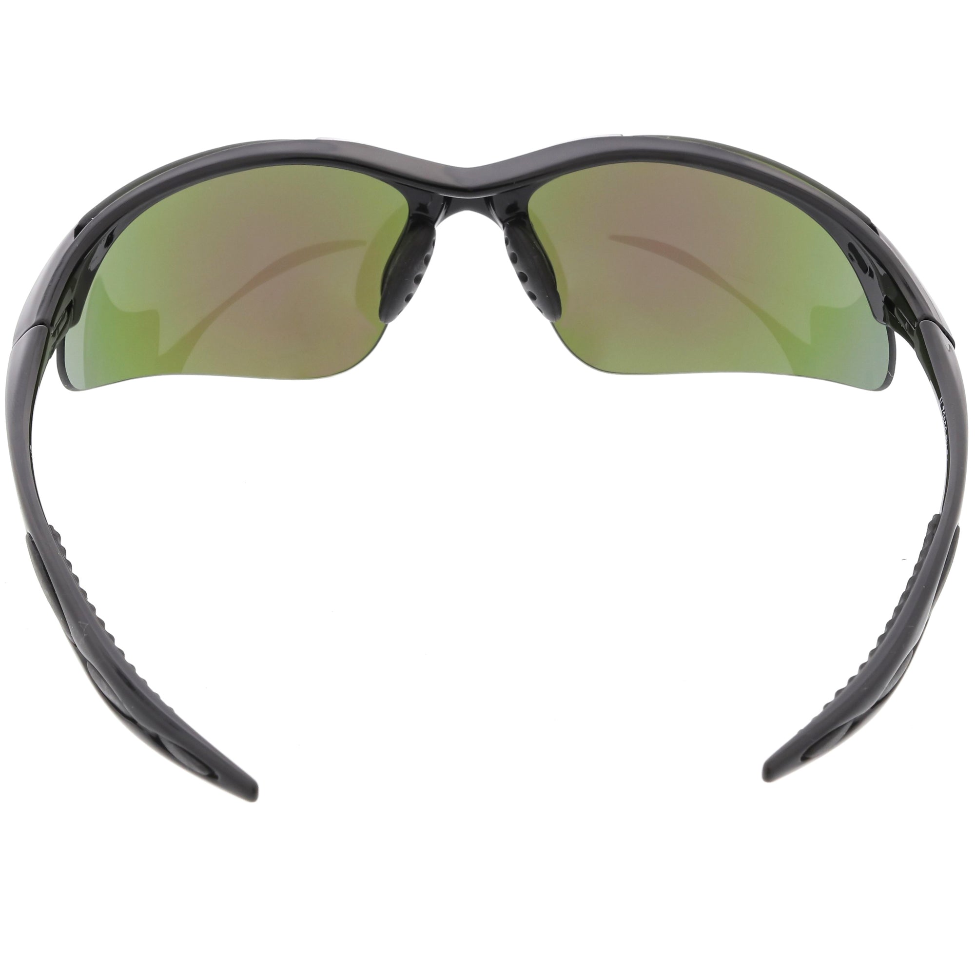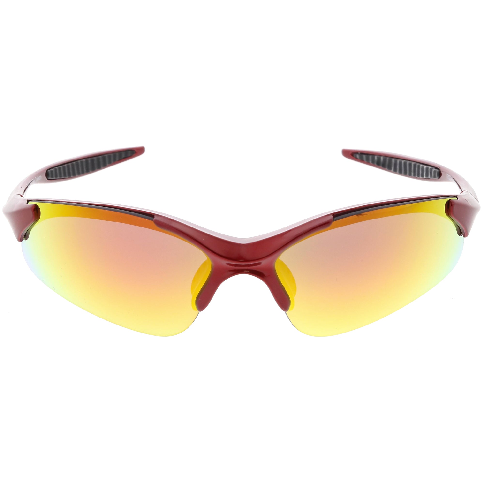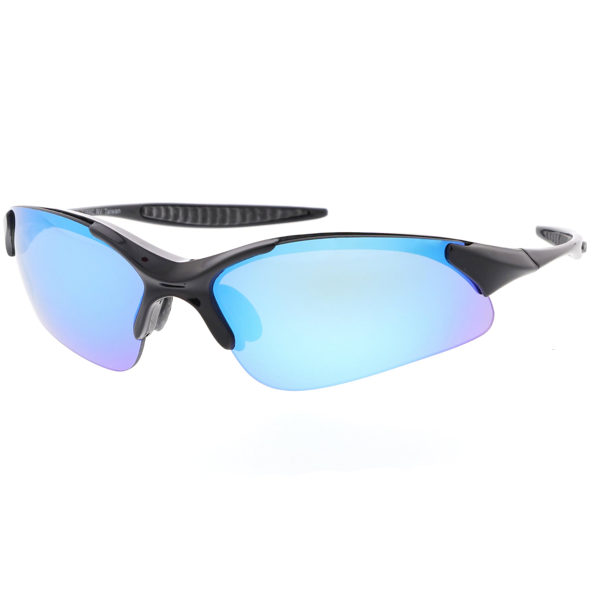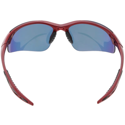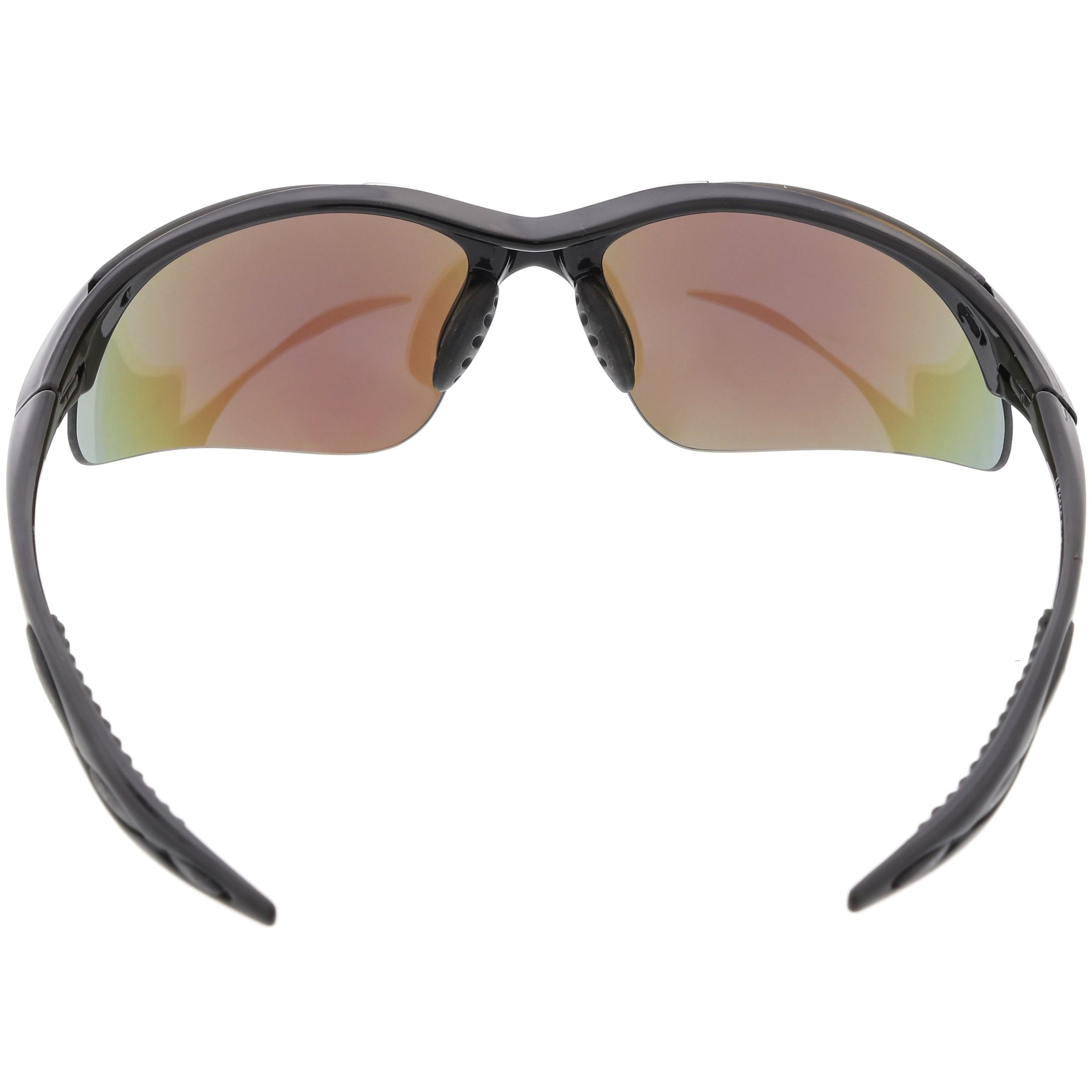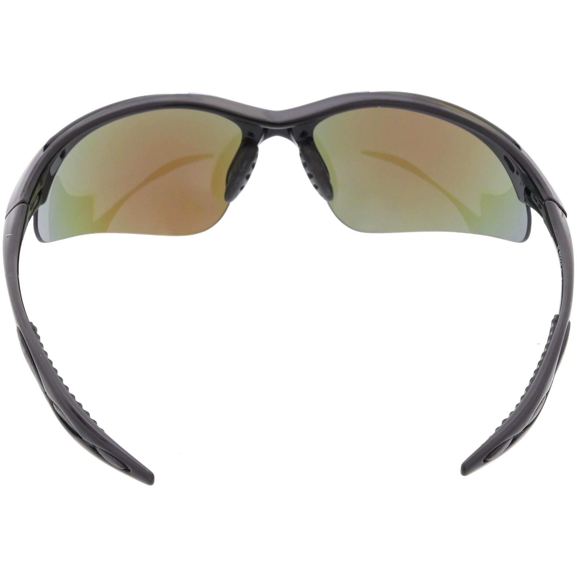 Keep up with the competition in these sports wrap sunglasses exquisitely crafted with TR-90 plastic for a lightweight and durable frame. A curved colored mirror lens gives it it's eye-catching look, while ventilated non-slip nose pads and injected mold temples keep them on and comfortable during perspiration. A great sport sunglasses that is ideal for multiple sports, these wrap sunglasses were built to perform. With pin hinges, and 100% UV protected lenses.