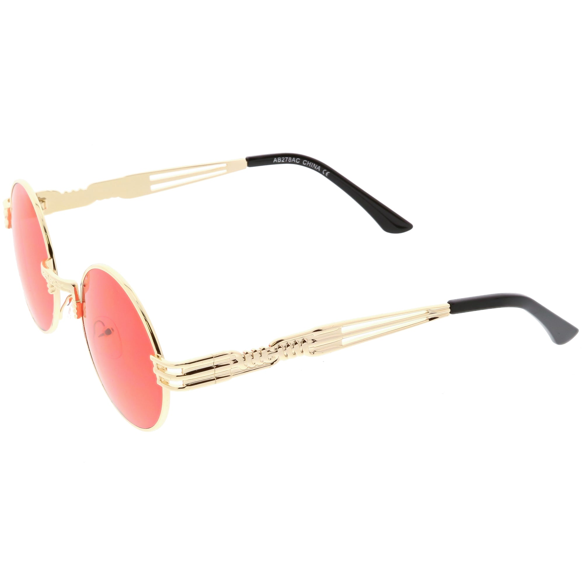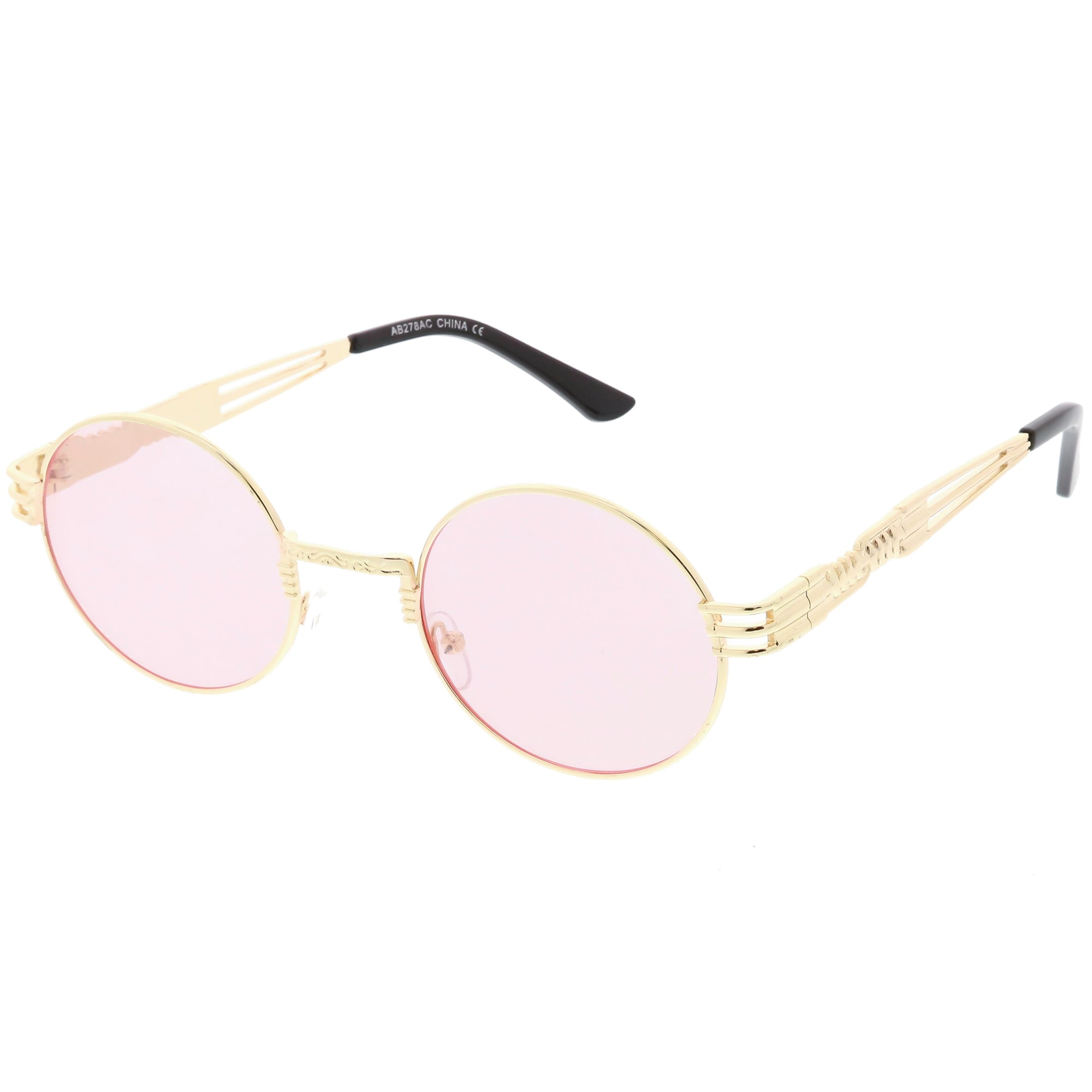 • The unique metal detail on the arms and nose piece create a one of a kind steampunk inspired design. The color tinted oval lenses complete this retro look. Finished with a metal based frame, adjustable English style nose pieces, metal hinges, and 100% UV protected lenses.