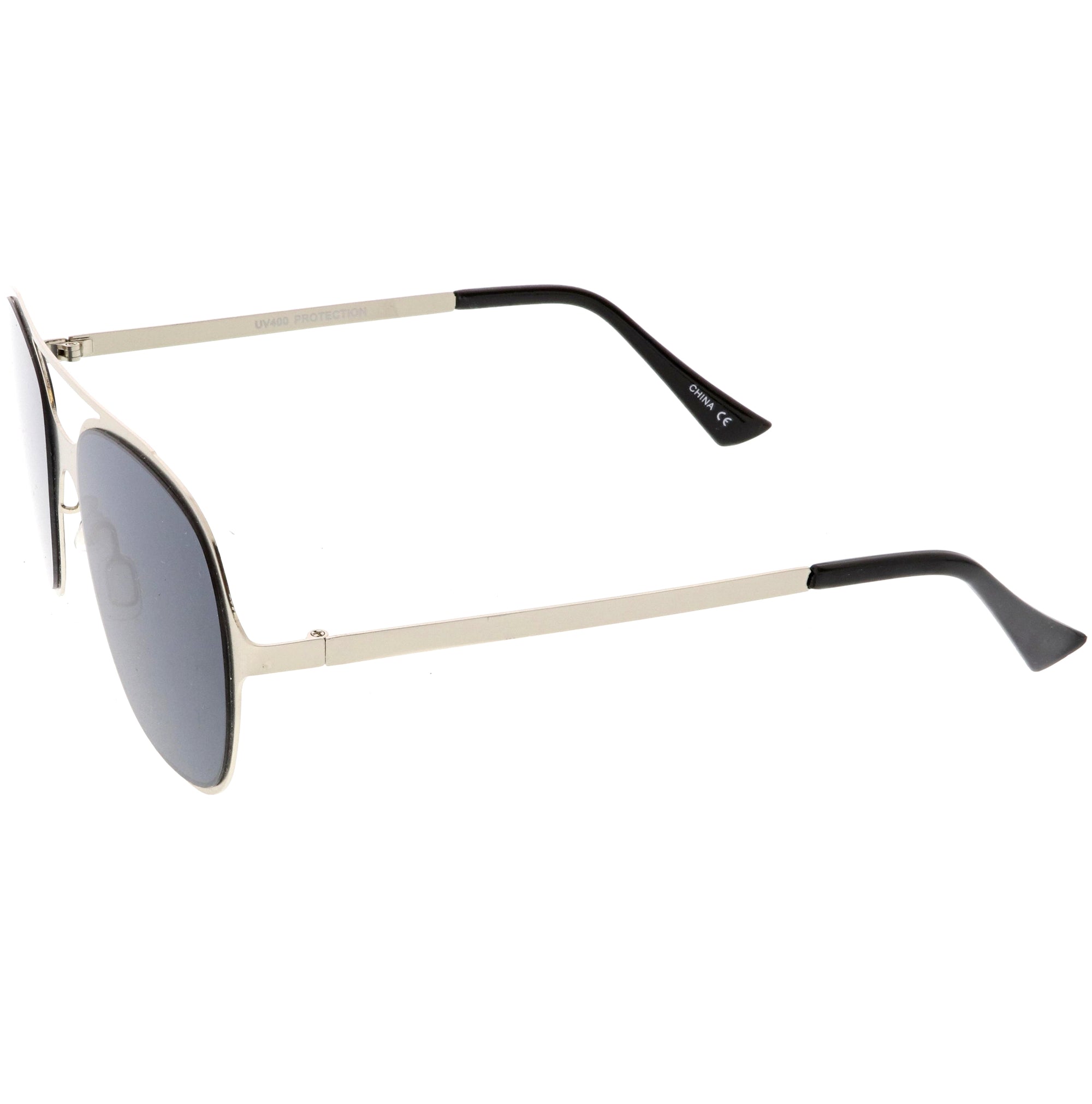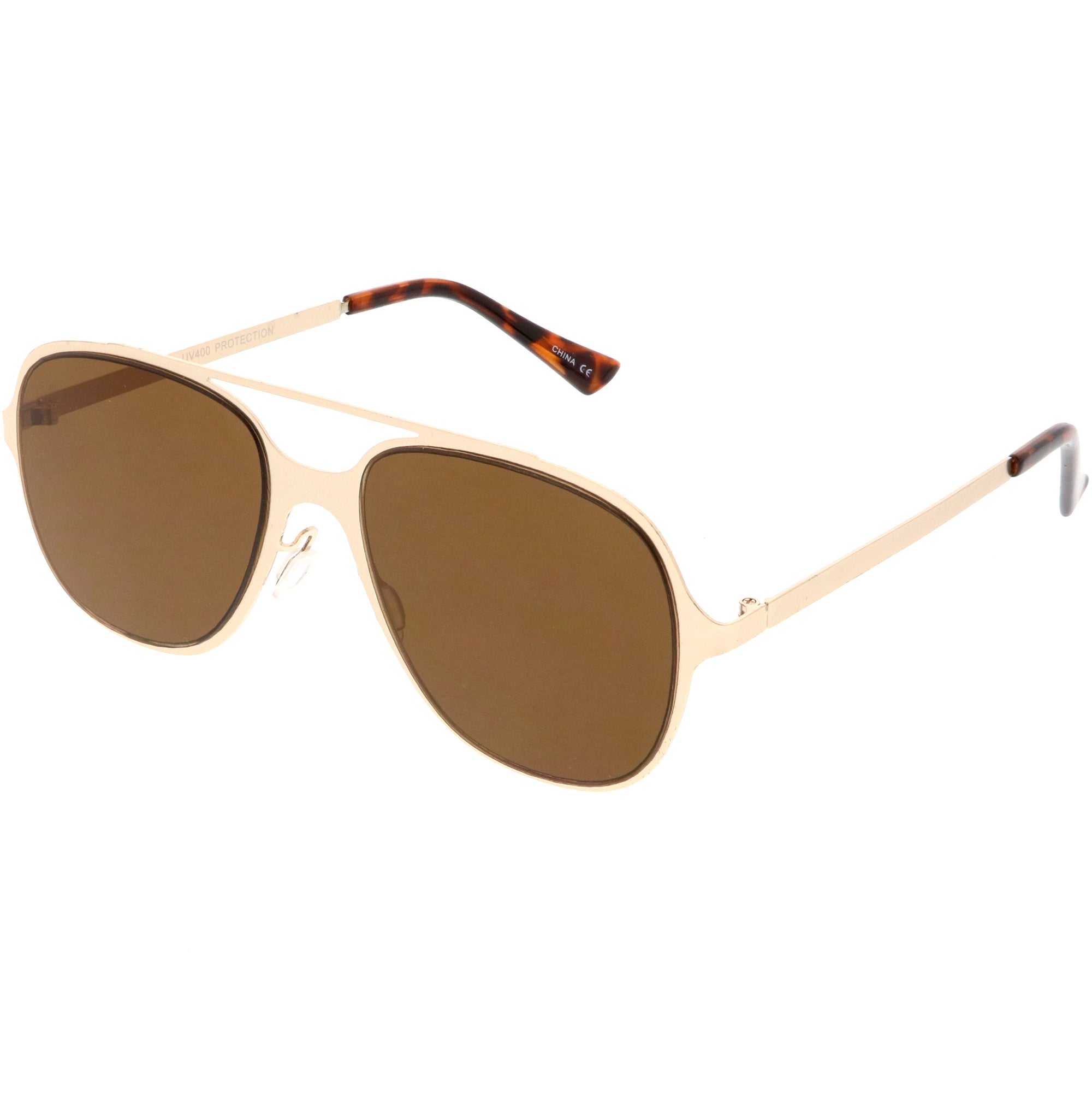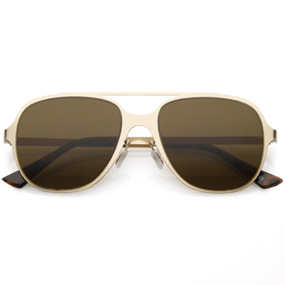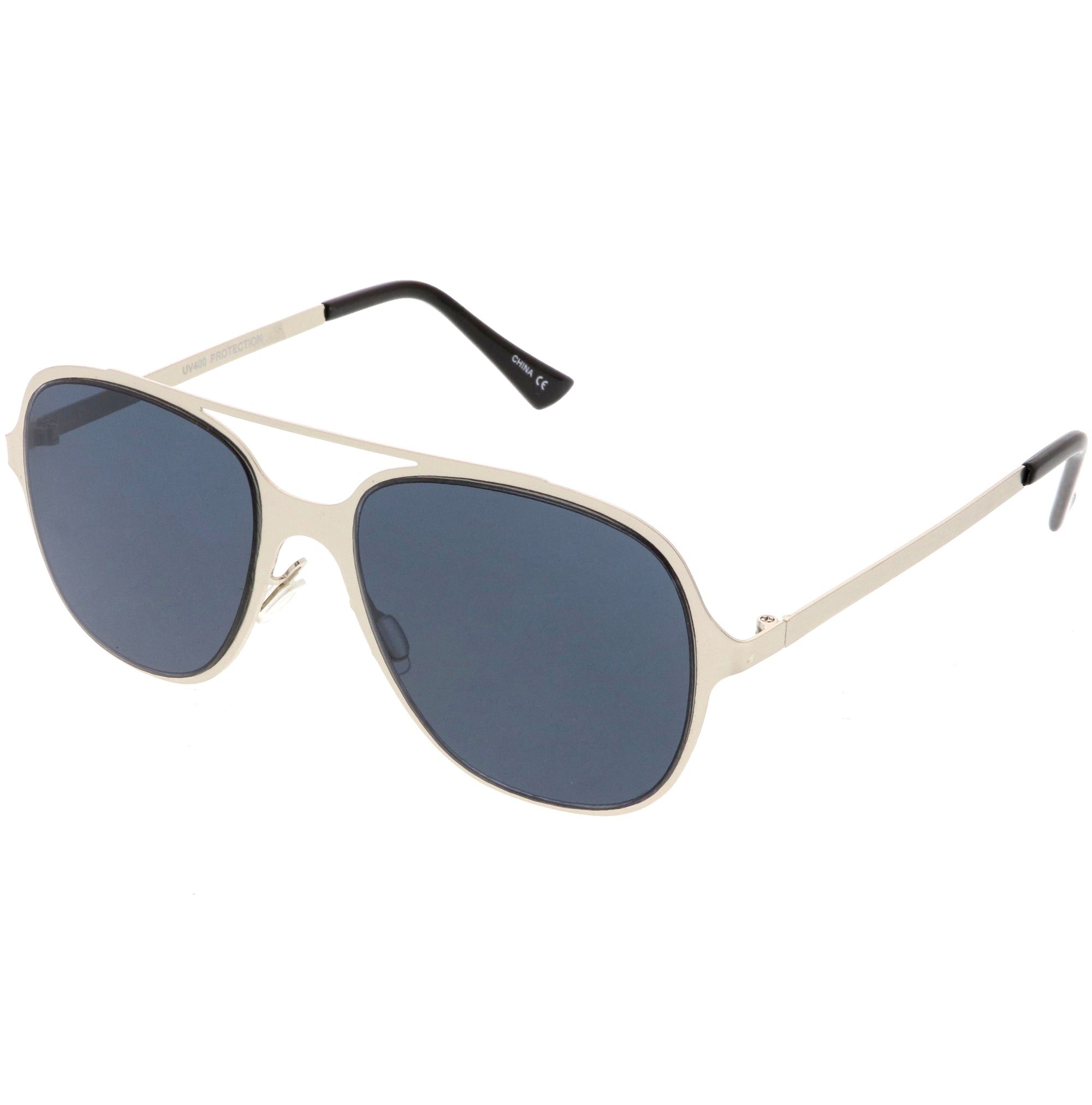 This aviator sunglass style is the perfect addition to your everyday wear. Designed with a sleek metal frame and double crossbar, these sunglasses are a must. Choose between four different neutral colored flat lens to be your go-to pair. Finished with adjustable English style nose pieces, metal hinges, and 100% UV protected lenses.