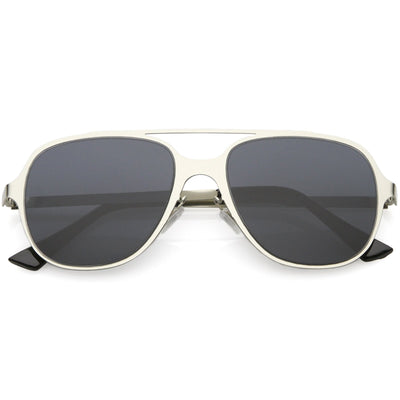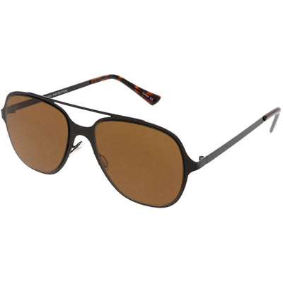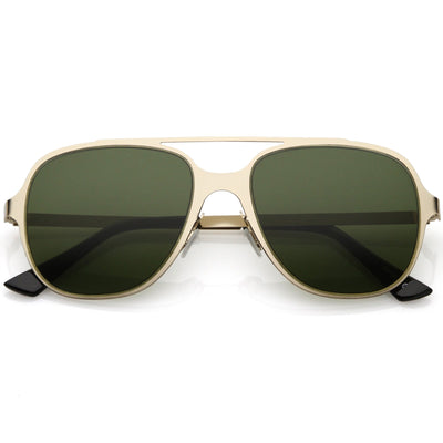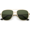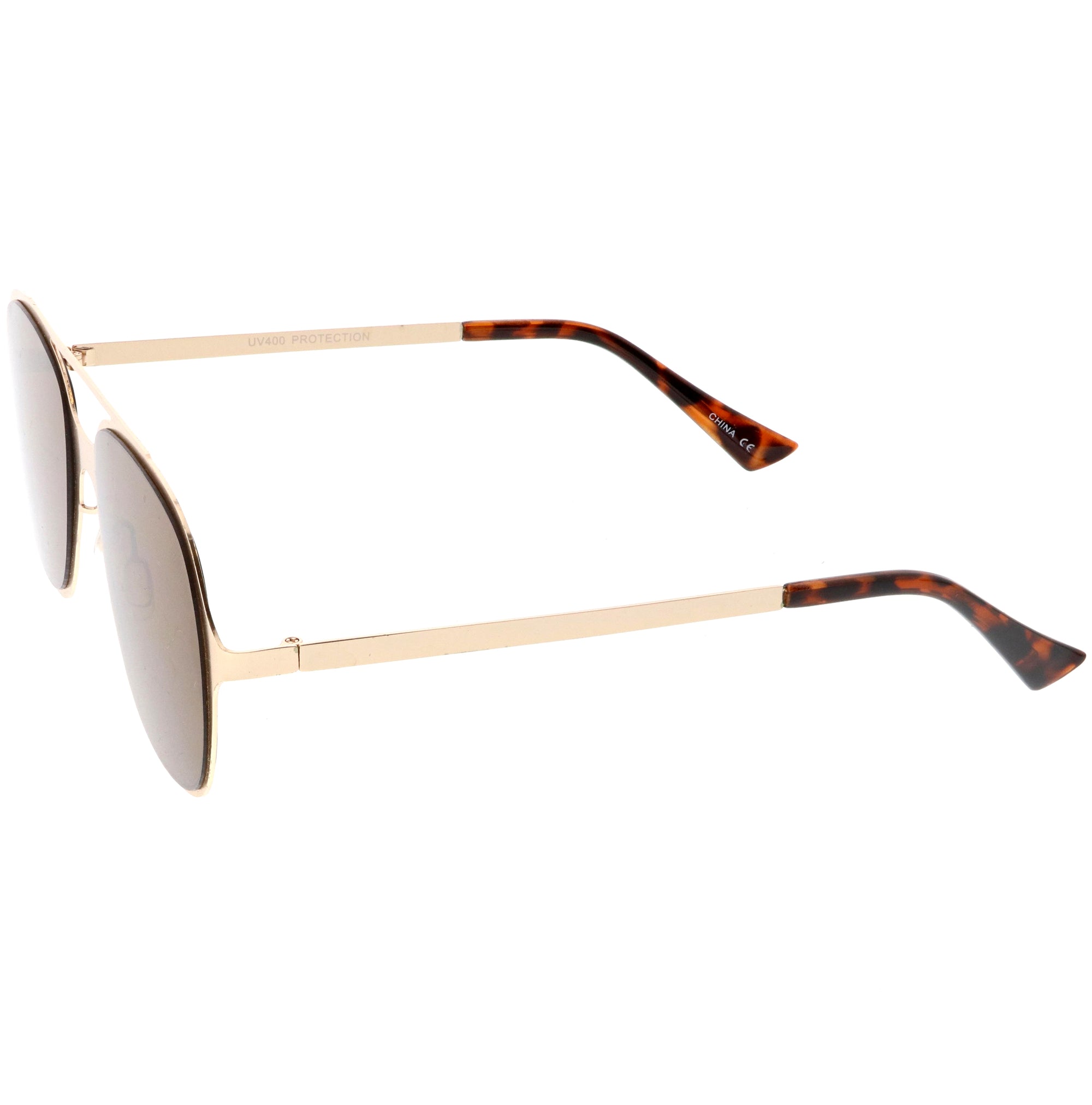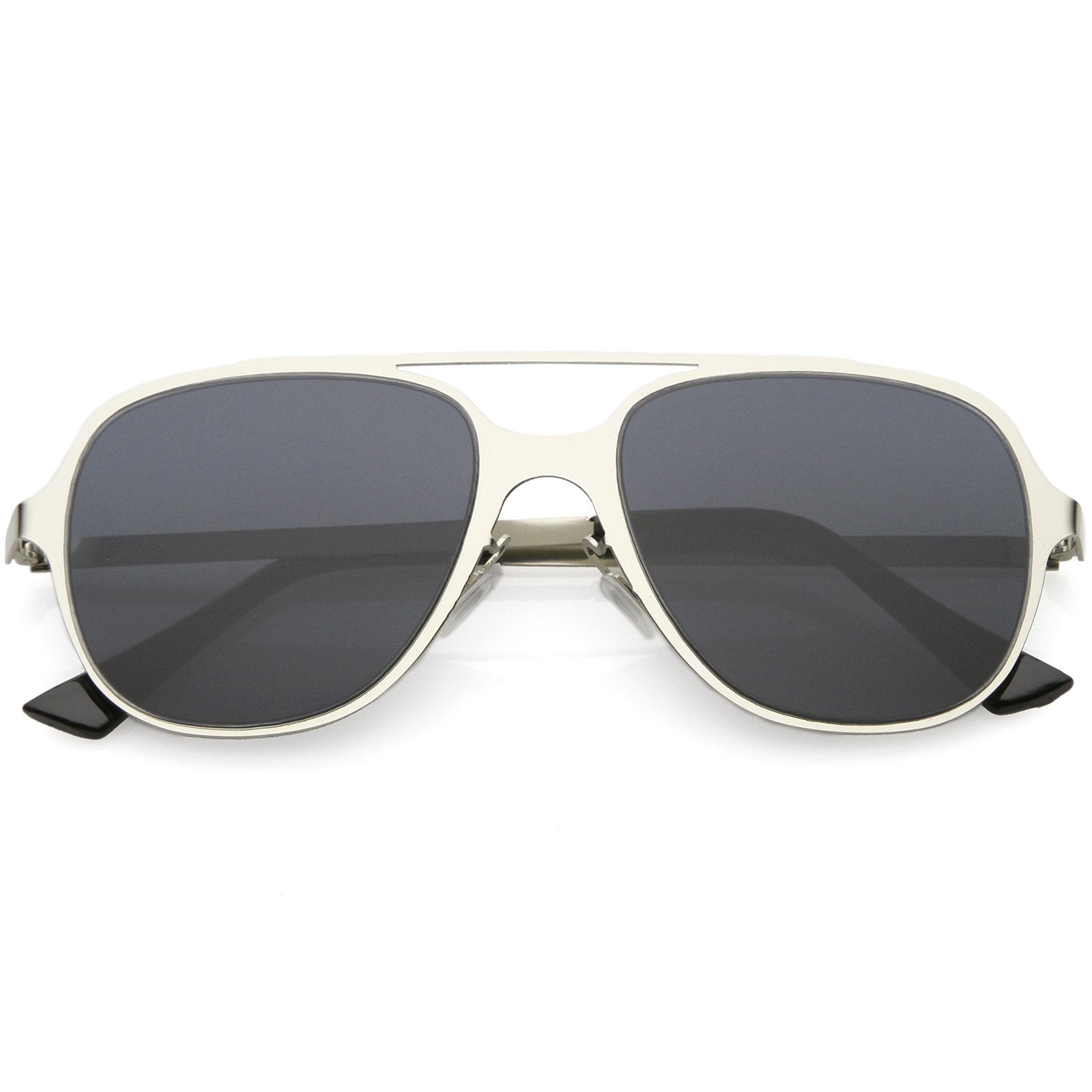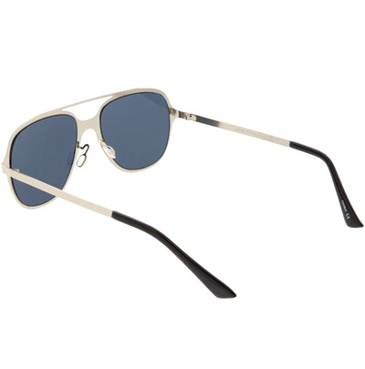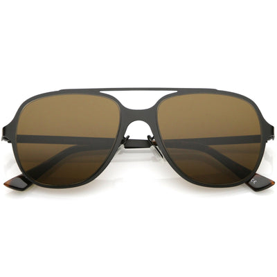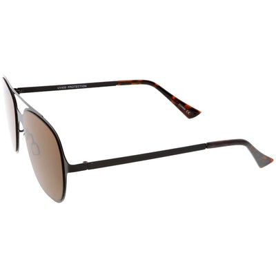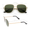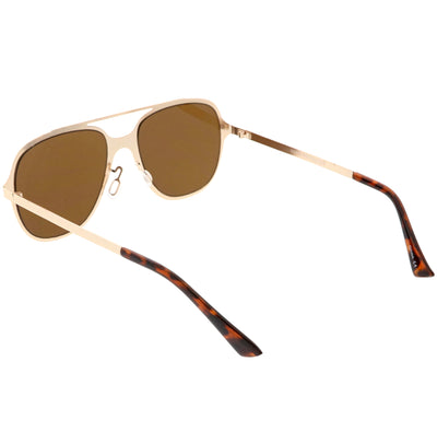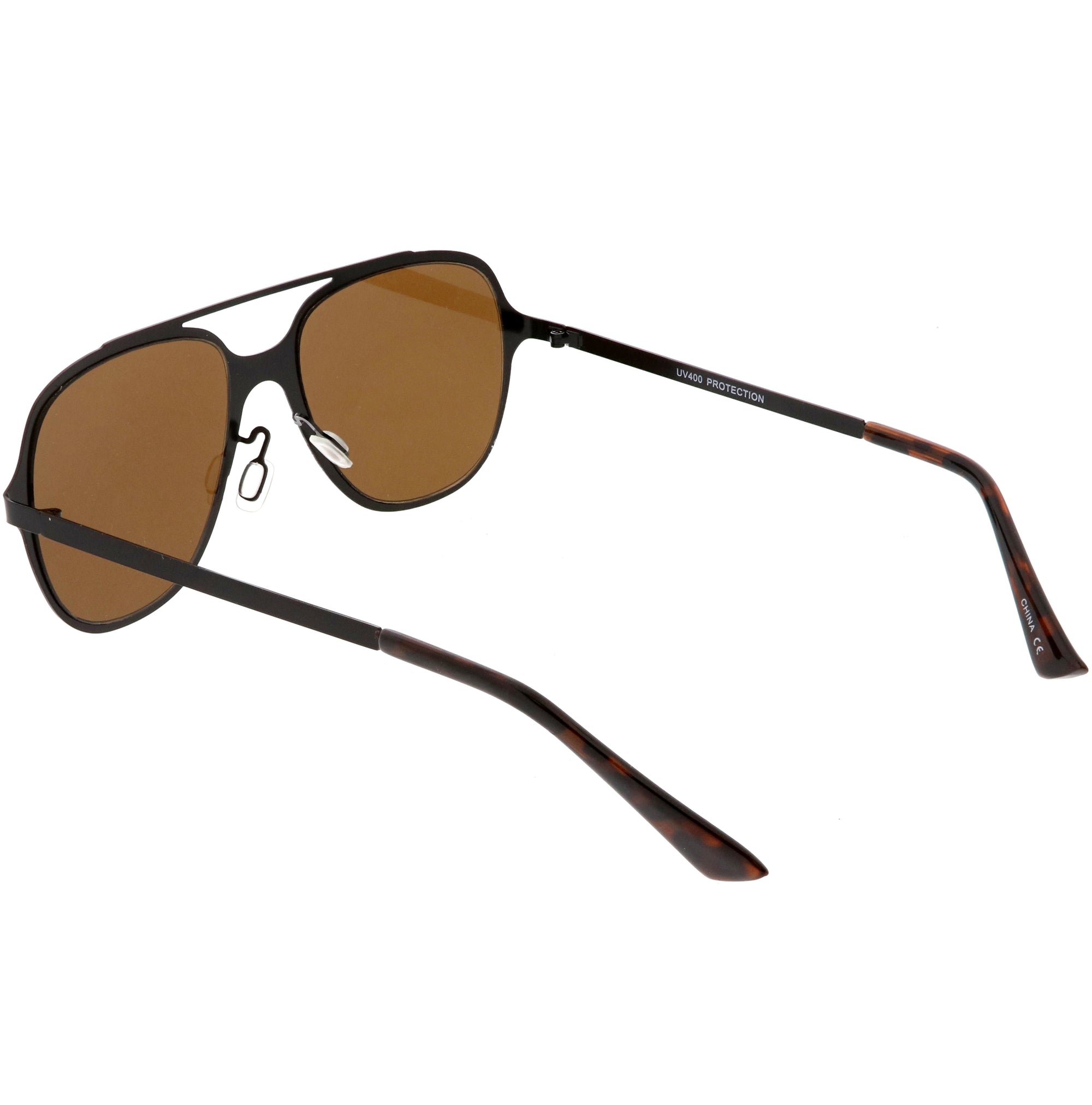 This aviator sunglass style is the perfect addition to your everyday wear. Designed with a sleek metal frame and double crossbar, these sunglasses are a must. Choose between four different neutral colored flat lens to be your go-to pair. Finished with adjustable English style nose pieces, metal hinges, and 100% UV protected lenses.