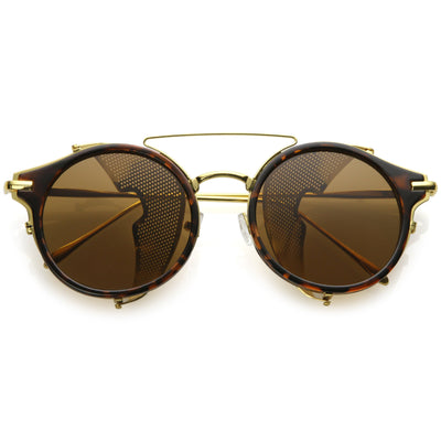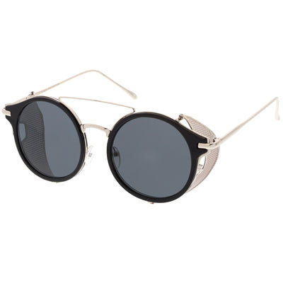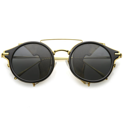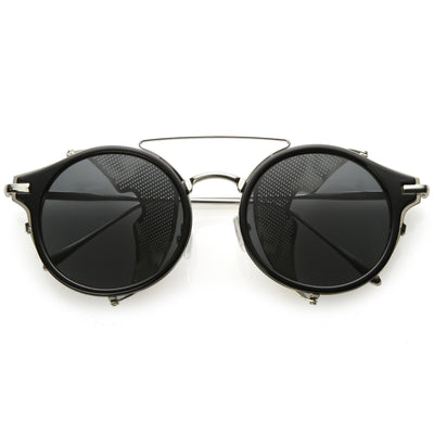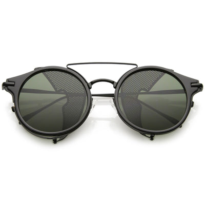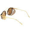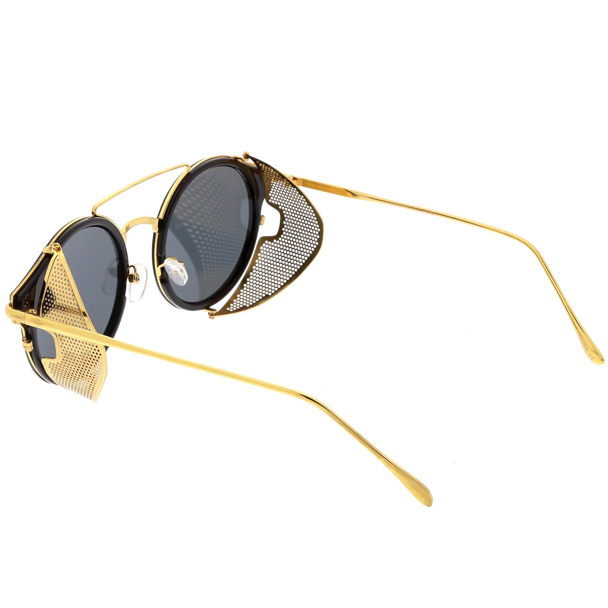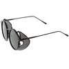 This unique pair of sunglasses is a design unlike no other. The steampunk inspired style is spiced up with a double crossbar and detailed metal side covers that are uniquely crafted to fold in. This industrial design features a P3 round horn rimmed shape with neutral colored flat lenese, making them easy to pair with a basic toned down outfit to give it that extra zing! Complete with a metal and plastic based frame, adjustable English style nose pieces, metal hinges, and 100% UV protected lenses.
