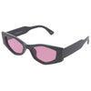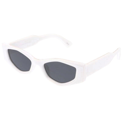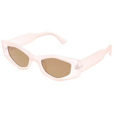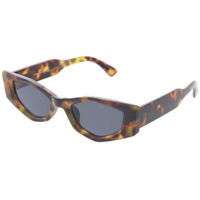 The frame stands out with its thick and bold construction, exuding a sense of strength and confidence. The geometric aspects of the design suggest sharp angles or straight lines, contributing to a contemporary and edgy appearance. The cateye influence is evident in the upward sweep of the frame's upper edges, reminiscent of the timeless and feminine cateye shape. This fusion of chunky frame, geometric details, and cateye style results in an eye-catching and fashion-forward look. The lenses, proportionate to the frame, offer both style and sun protection.