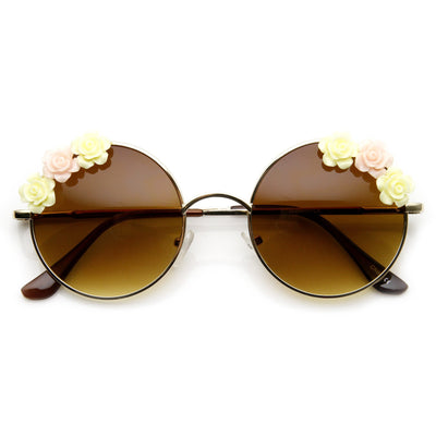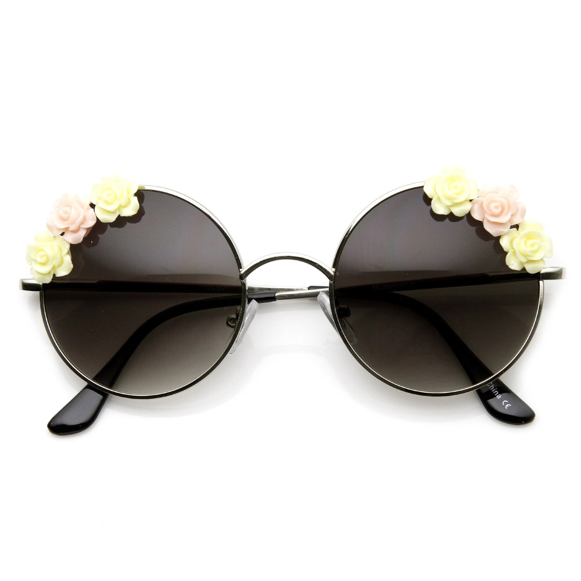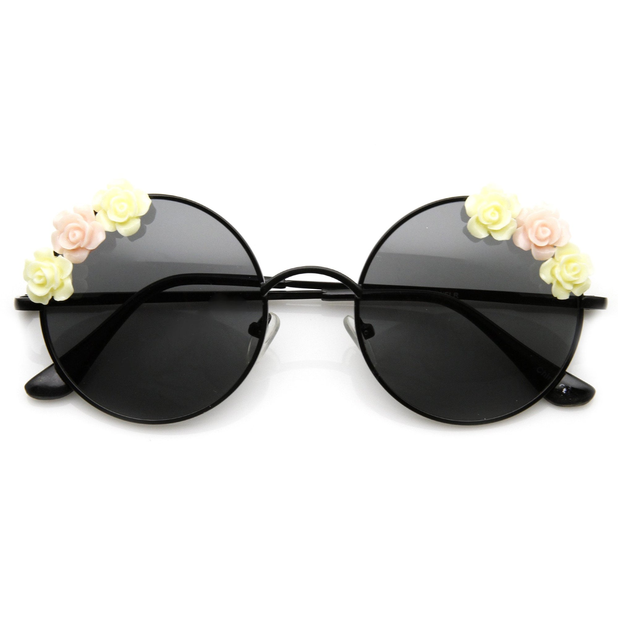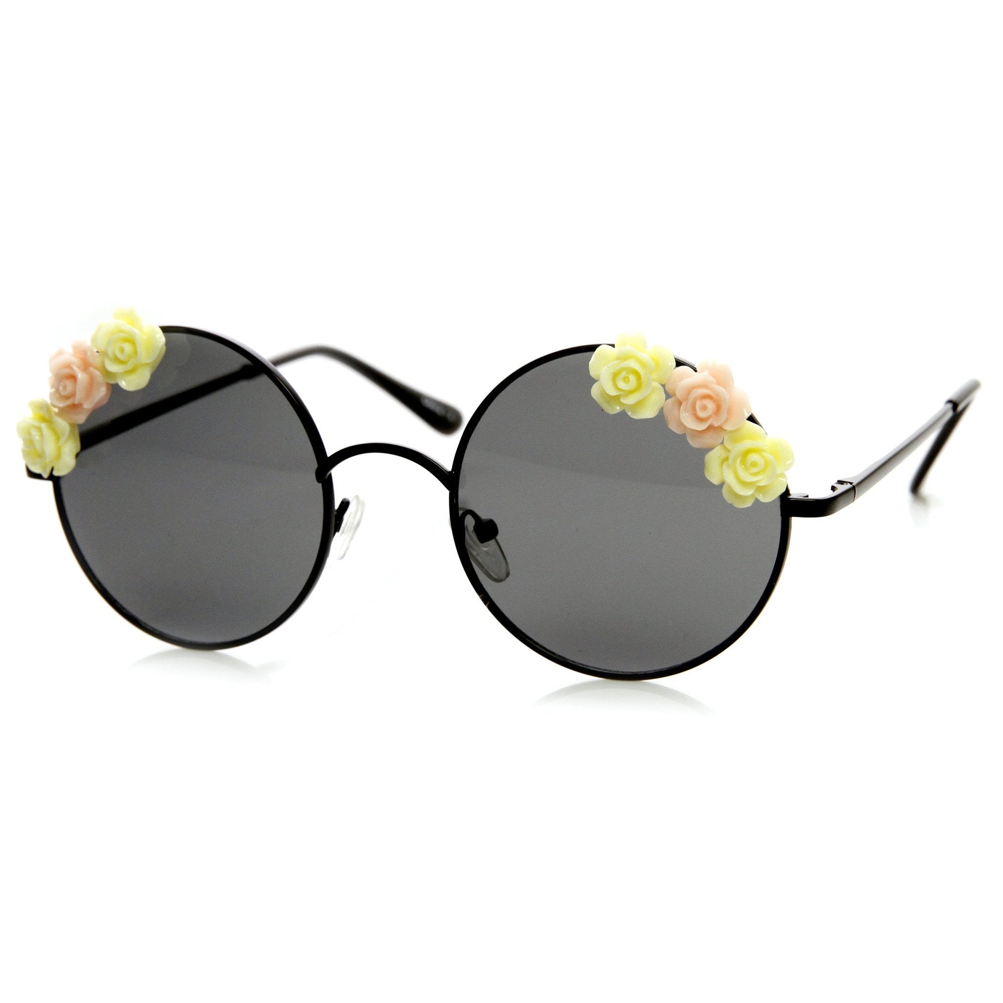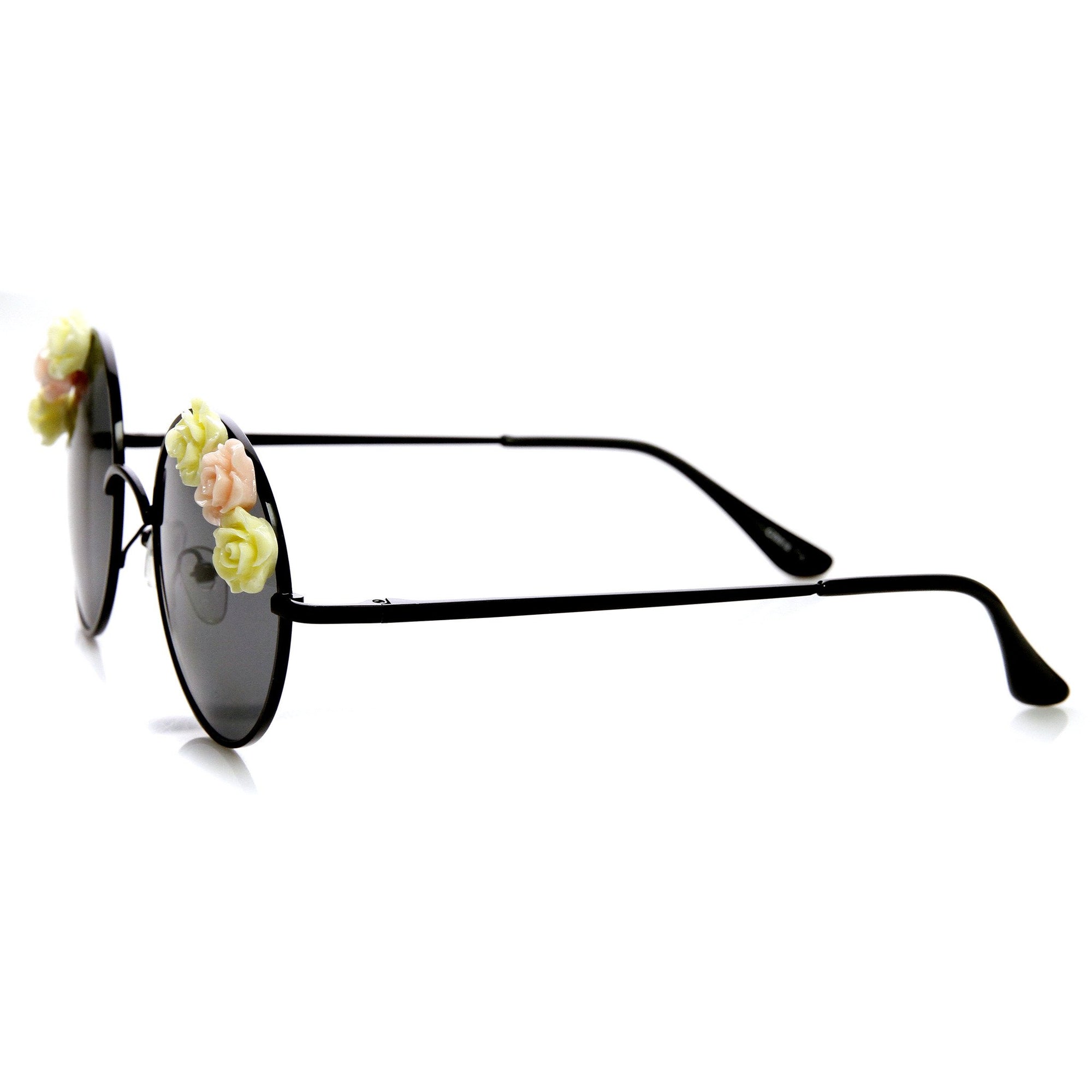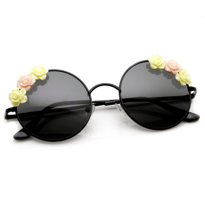 Womens Lennon style round metal frame that features adorable hand-painted ceramic adorned flowers that are fastened with tiny metal screws. With all the lovely flowers and classic Lennon inspired frame, these are sure to be a huge hit this season! Made from a metal based frame, metal hinges and polycarbonate UV400 protected lenses.