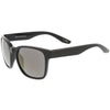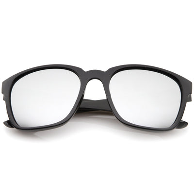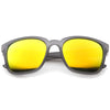 A refreshing take on the iconic horn rimmed frame, these action sports sunglasses are designed with square color mirror lenses for a stunning effect. Stylishly wide temples that sit high on the frame complete this versatile and updated style. Wear it with your favorite outfits for an attention grabbing ensemble that's perfect for the sunny season. Made with a plastic based frame, reinforced metal hinges, and reflective UV400 polycarbonate lenses.