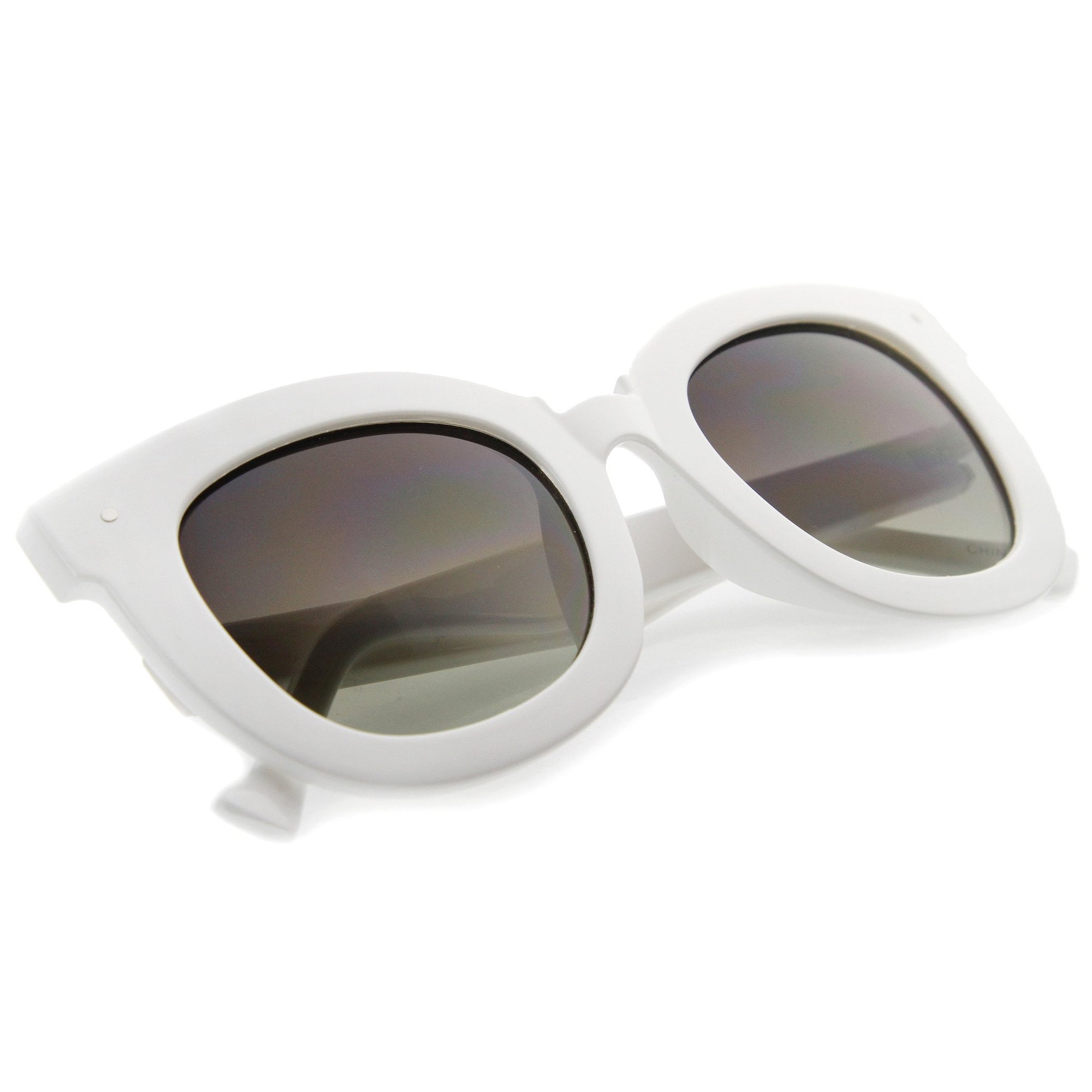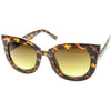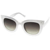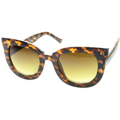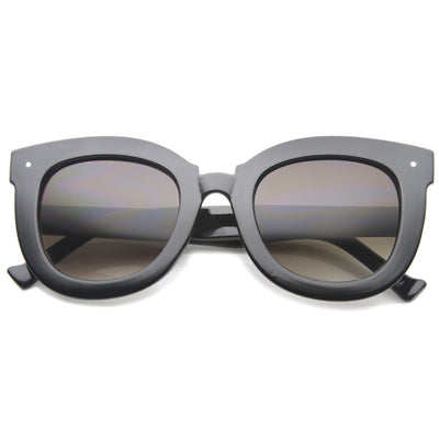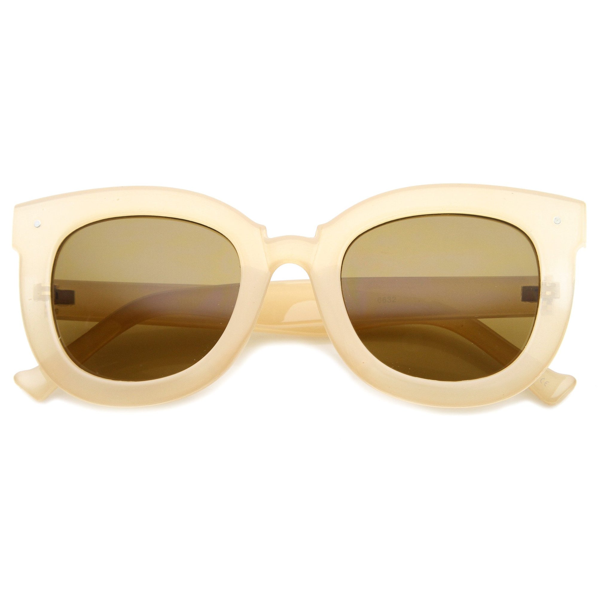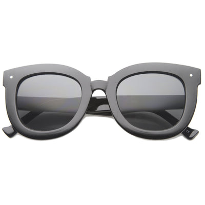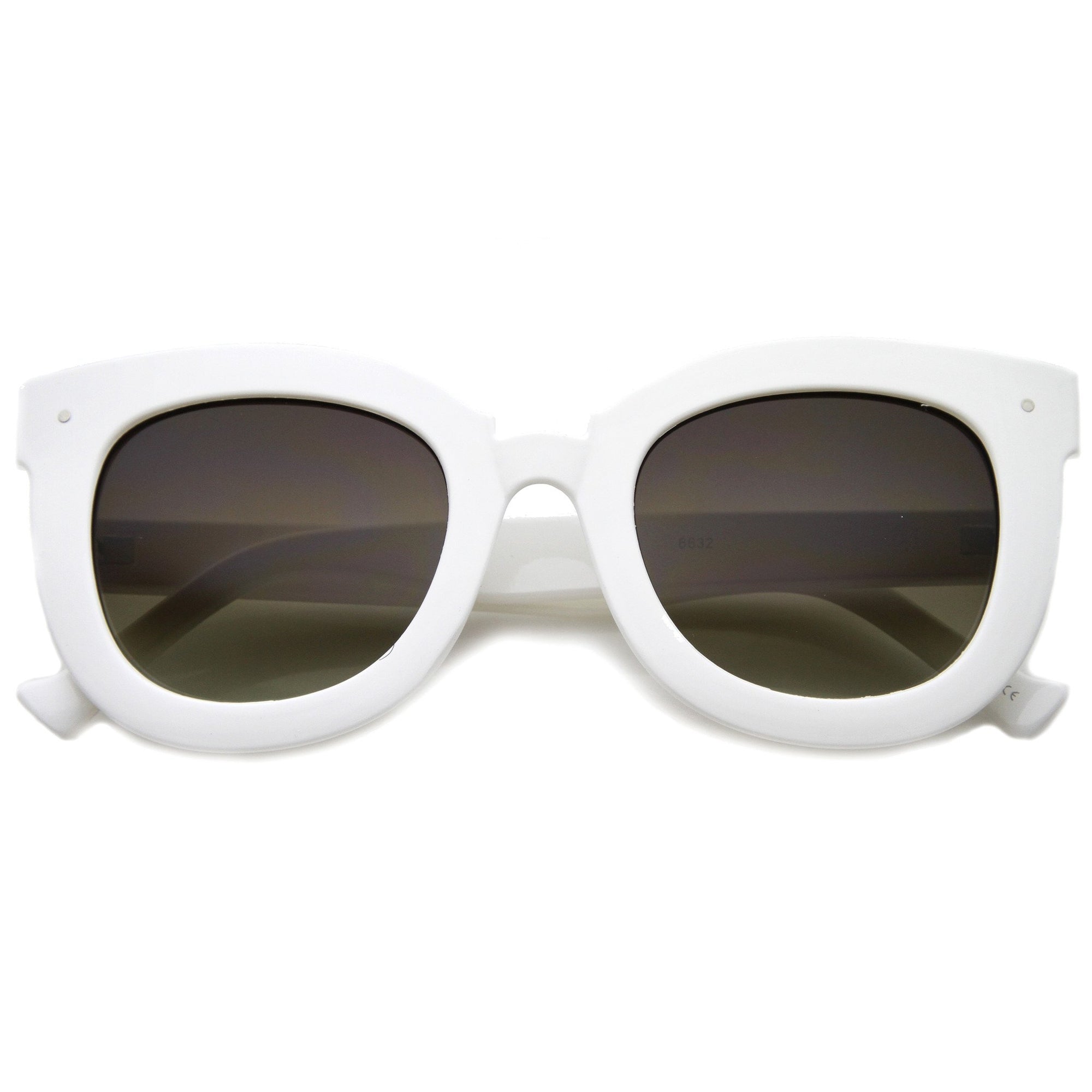 Women's oversized butterfly cat-eye silhouette that features a thick bold round frame with middle sitting temples. This pair is particularly suited to angular or square face shapes and available in a variety of colors to match your of your favorite wardrobes this season. Made with a plastic based frame, metal hinges and UV400 protected polycarbonate lenses.