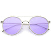 • A modern take on aviator design, these round metal aviators feature a straight crossbar and slim metal temples. Finished with round flat lenses in colorful hues, these round aviators are a must-have style. Made with a metal based frame, English style nose pieces, metal hinges, and polycarbonate UV400 protected lenses.