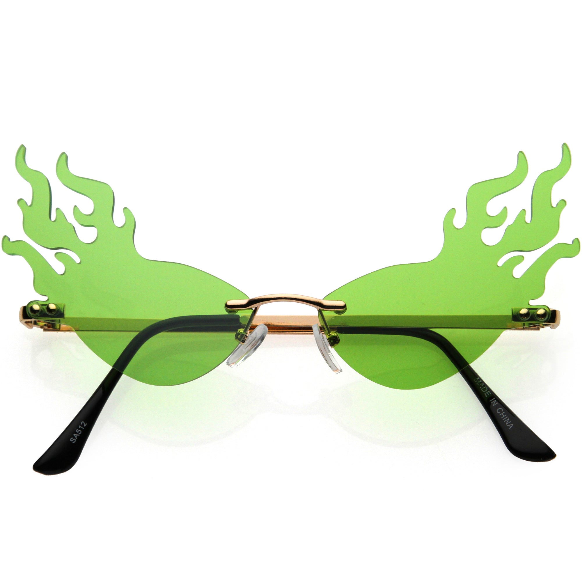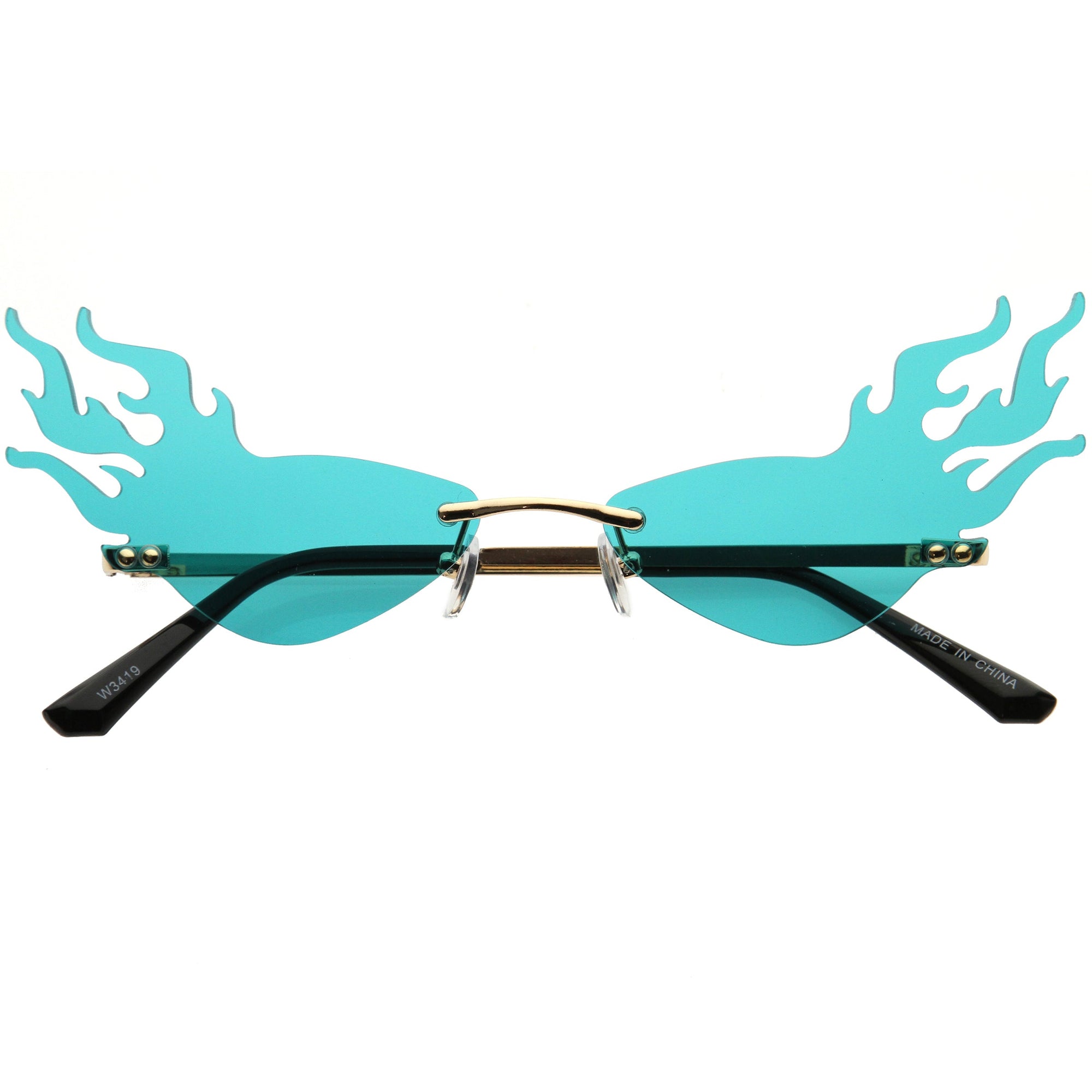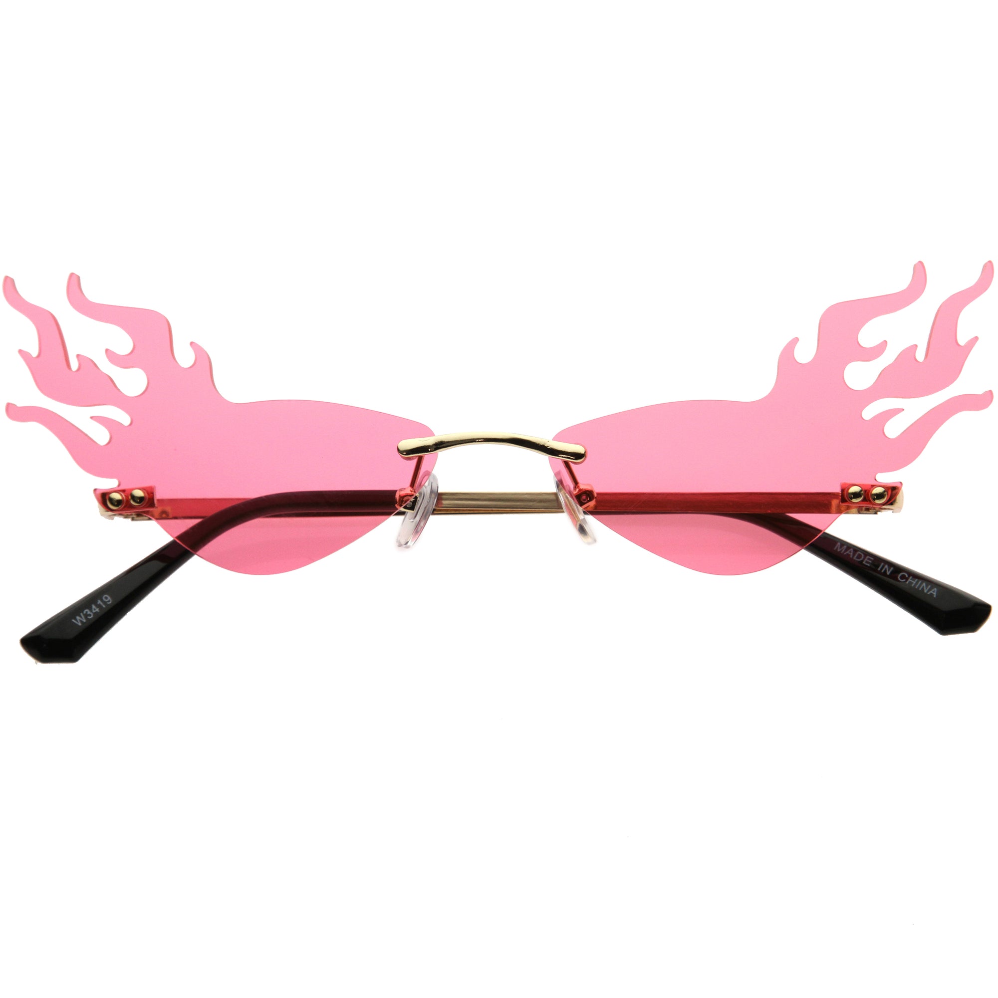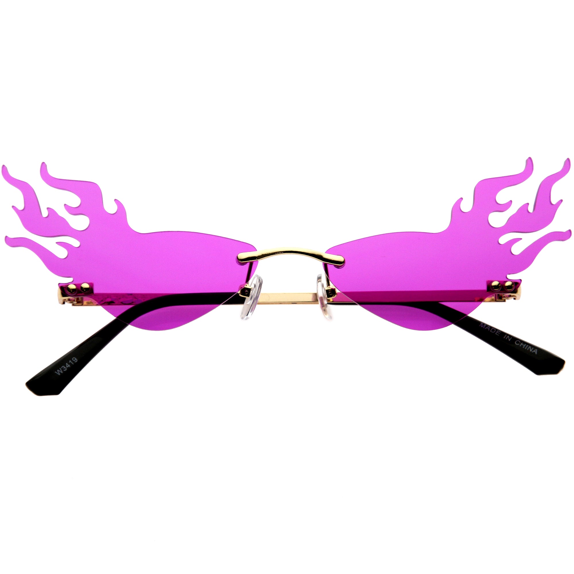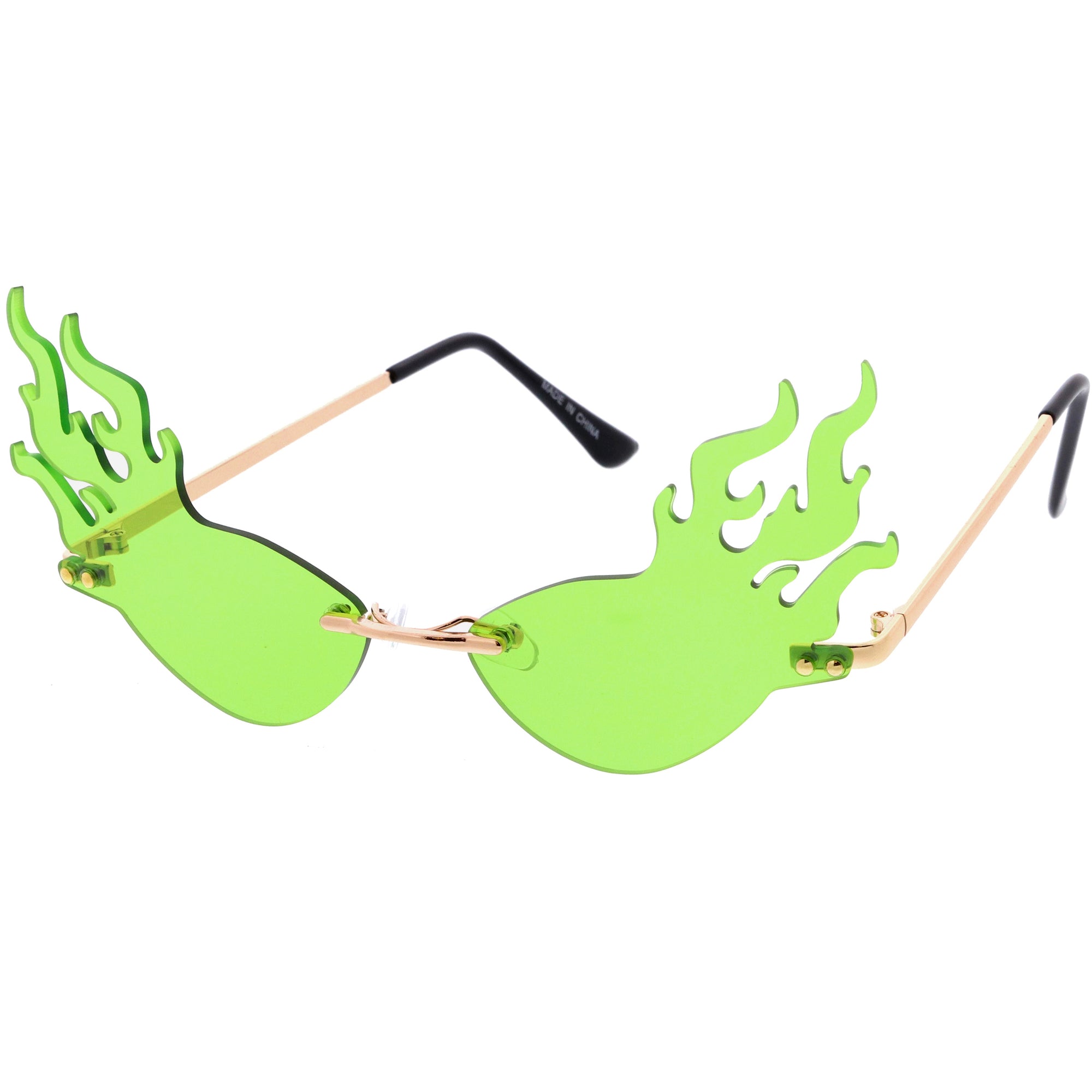 Bring on the extra heat with our vibrant color tinted lens flames sunglasses. With this one of a kind piece, it is sure to be the perfect fashion accessory for your wardrobe. The sleek metal design complementing the UV400 protected full rimless style will ensure your outfit will be fire! Made with metal hinges and 100% UV protected lenses.