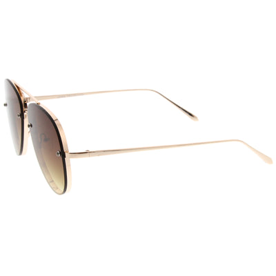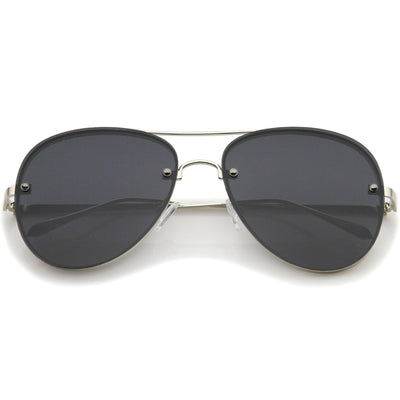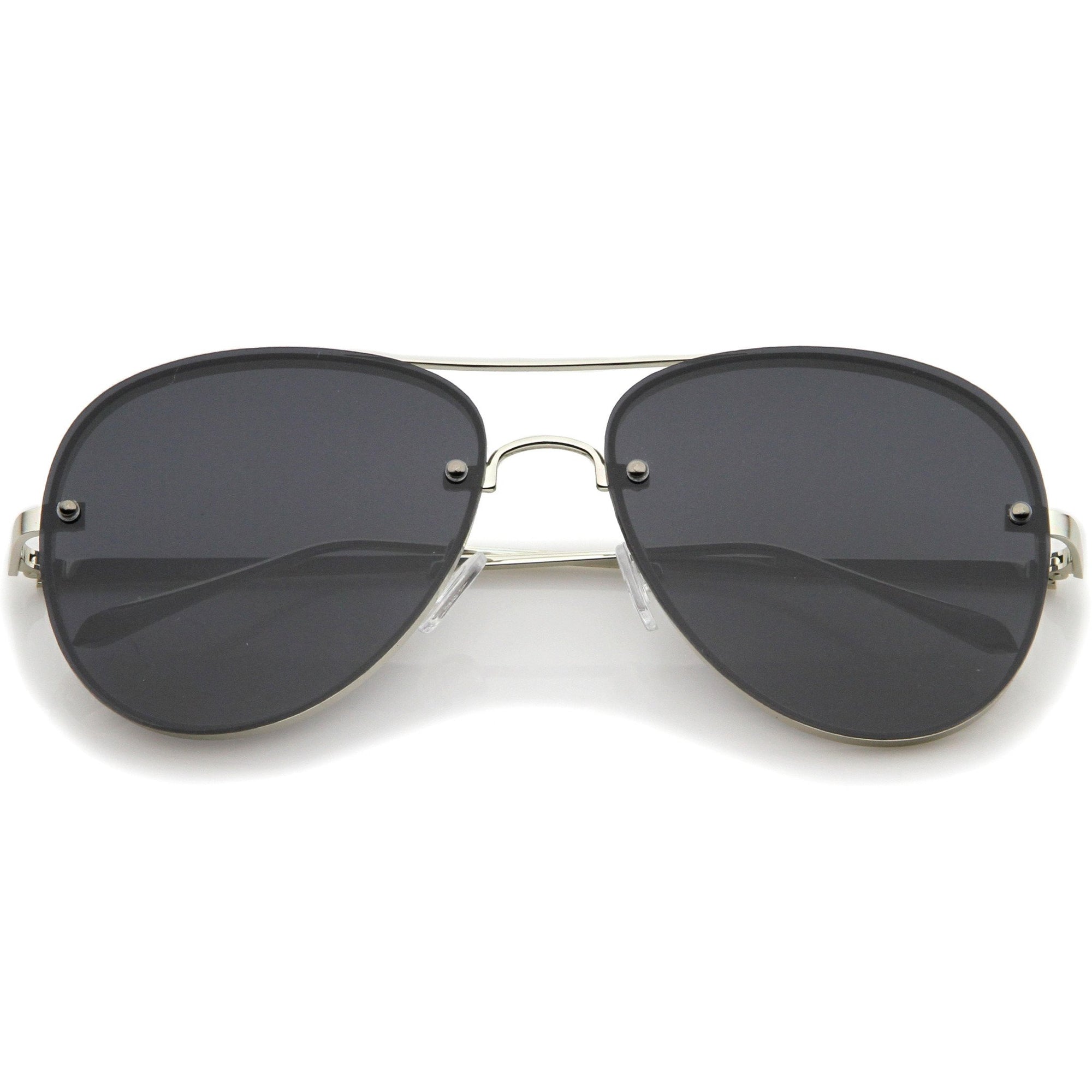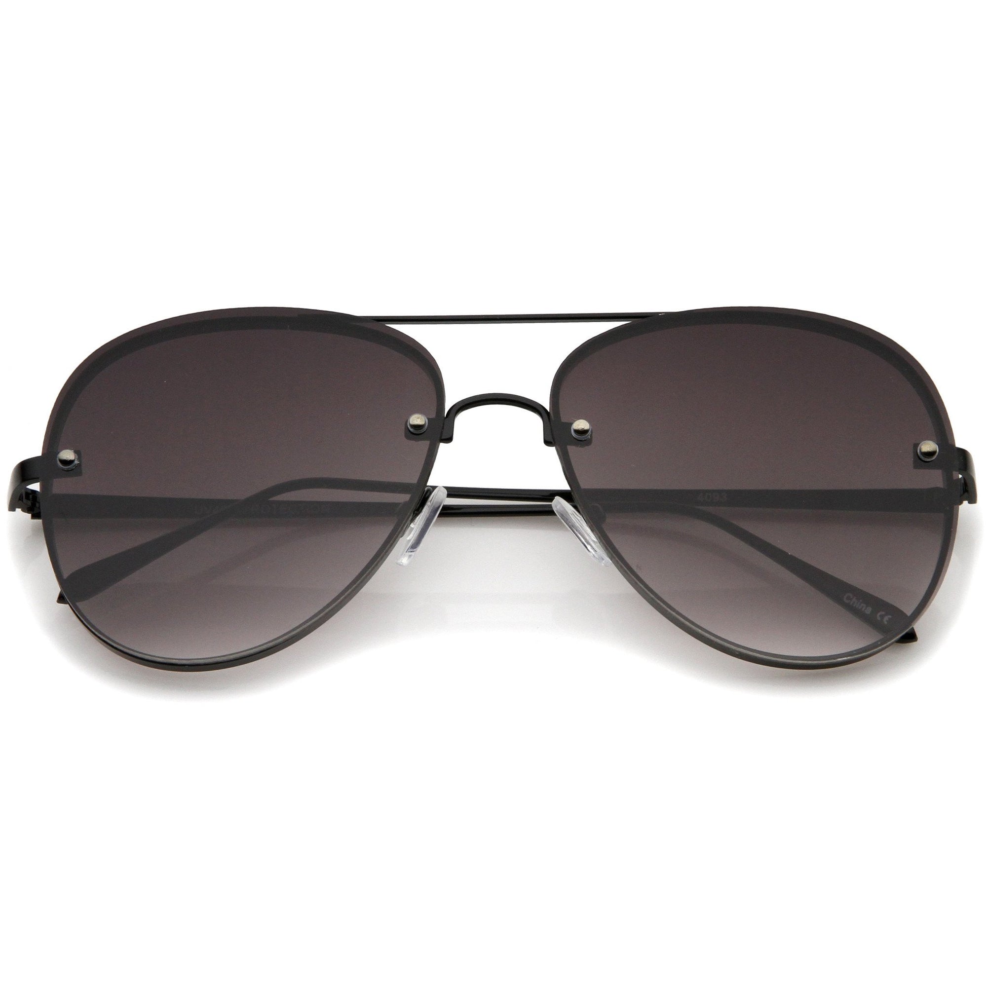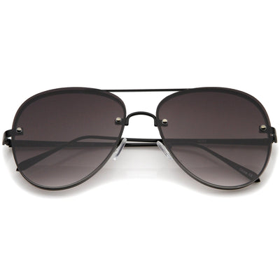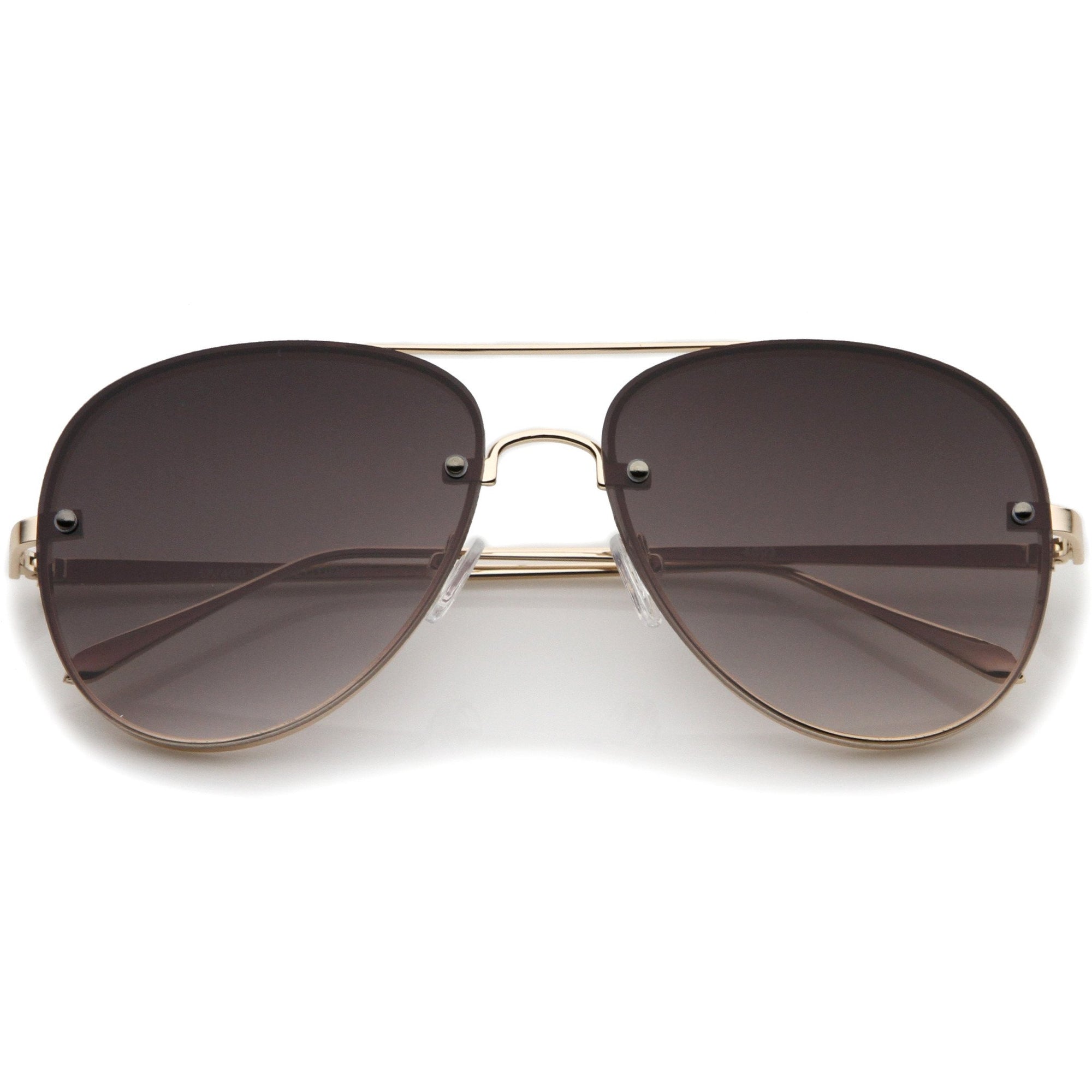 A classic shape with a modern design, these exquisitely crafted sunglasses feature a rimless aviator frame with ultra-slim metal temples and brow bar. Teardrop-shaped gradient flat lenses and rivets at the front give these sunglasses it's luxurious finish. Versatile enough to wear from season to season, these rimless aviator sunglasses can be easily paired with any look. Made with a metal based frame, English style nose pieces, metal hinges, and polycarbonate UV400 lenses.
