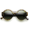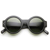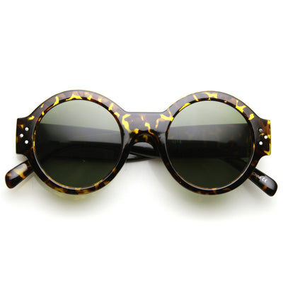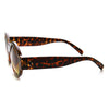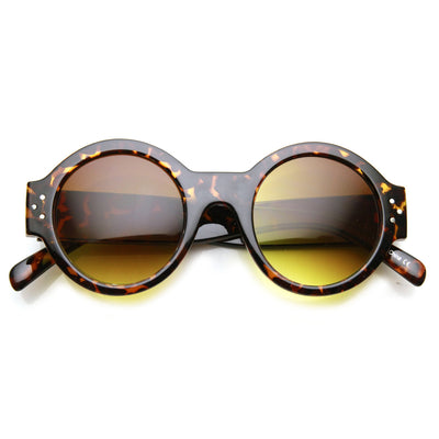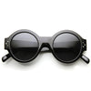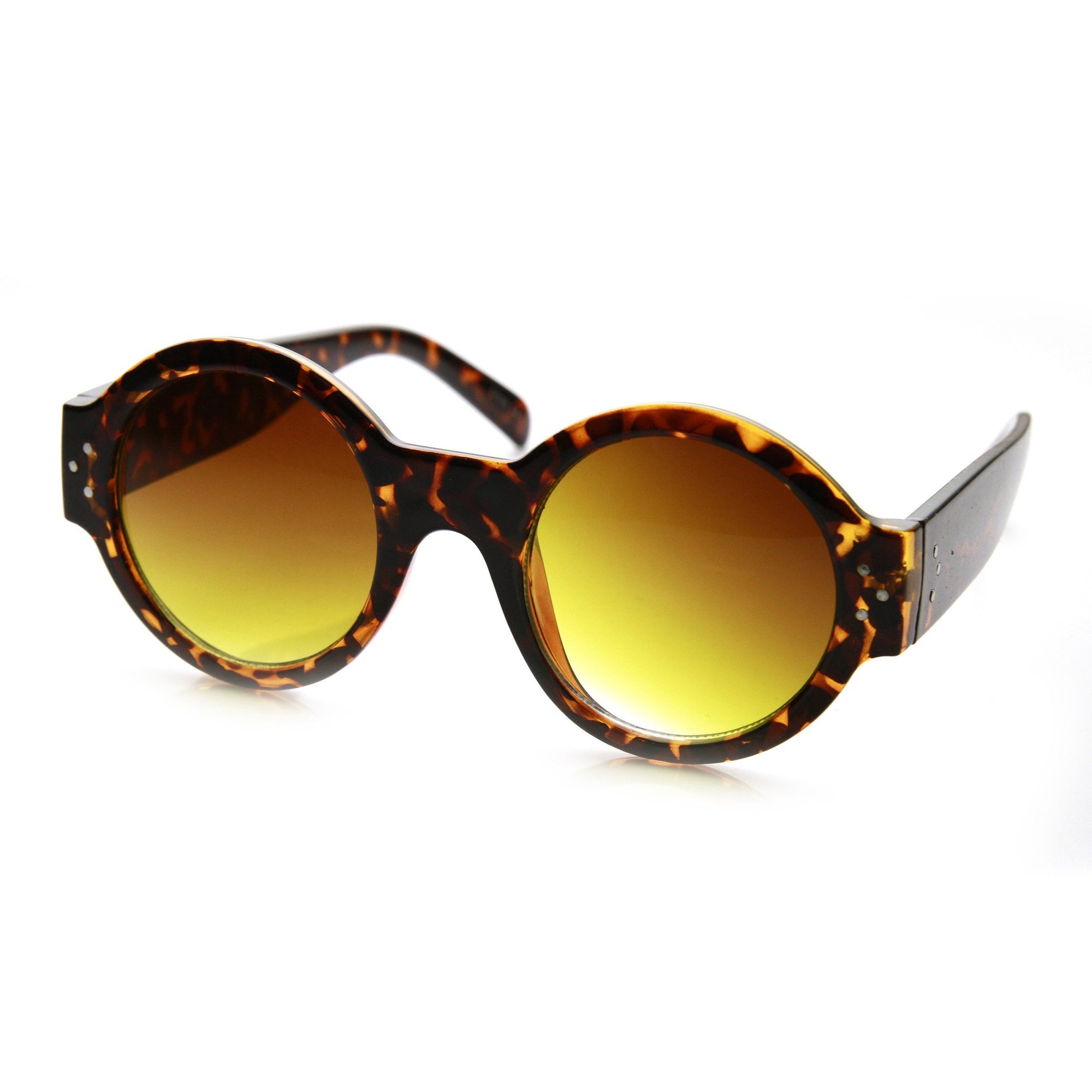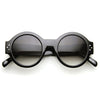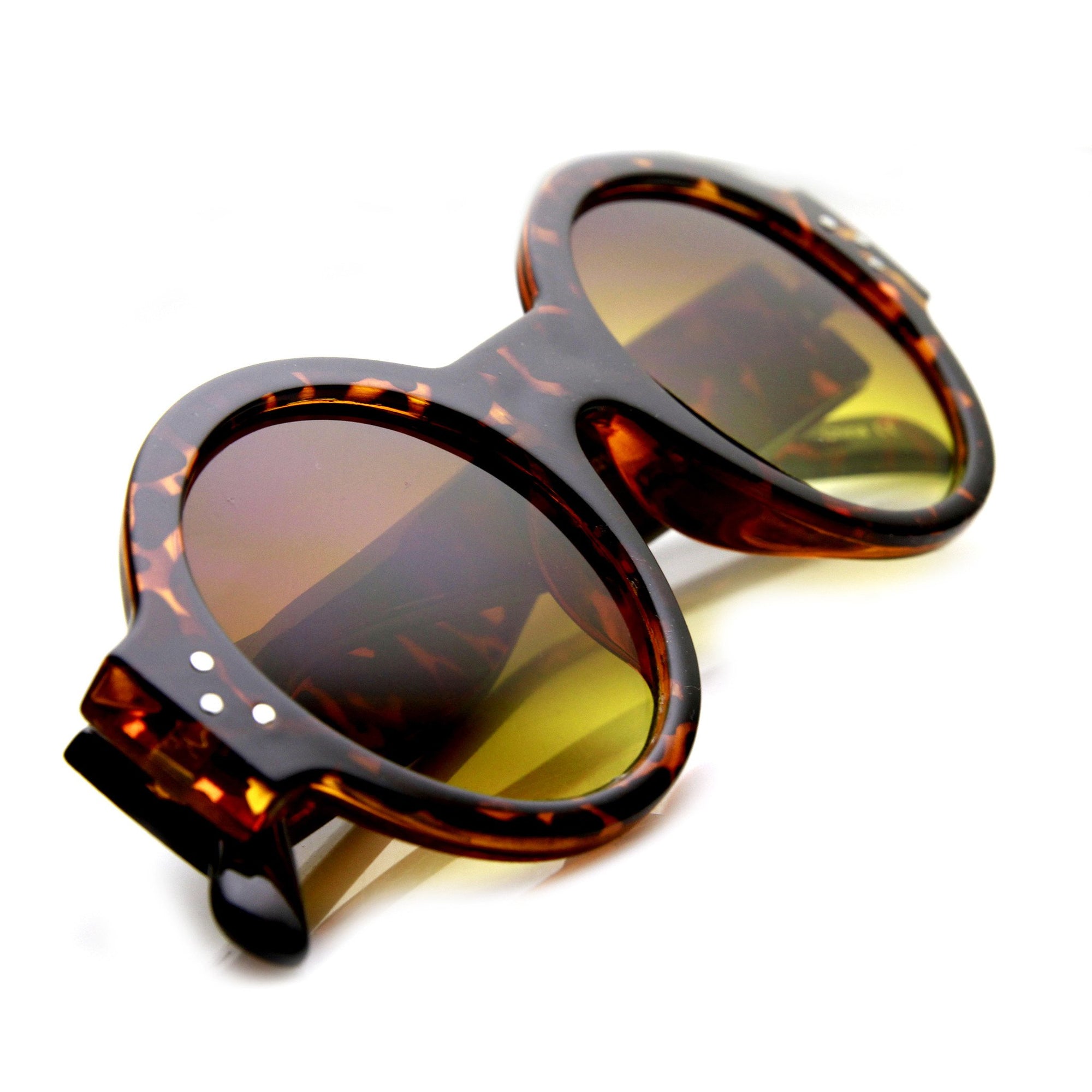 A round circular oversized sunglasses that features bold curves and elegant metal rivets at the temples. A bold rounded design that is a wonderful addition to this seasons collection. Made with a plastic based frame, metal arms, metal hinges, and polycarbonate UV protected lenses.