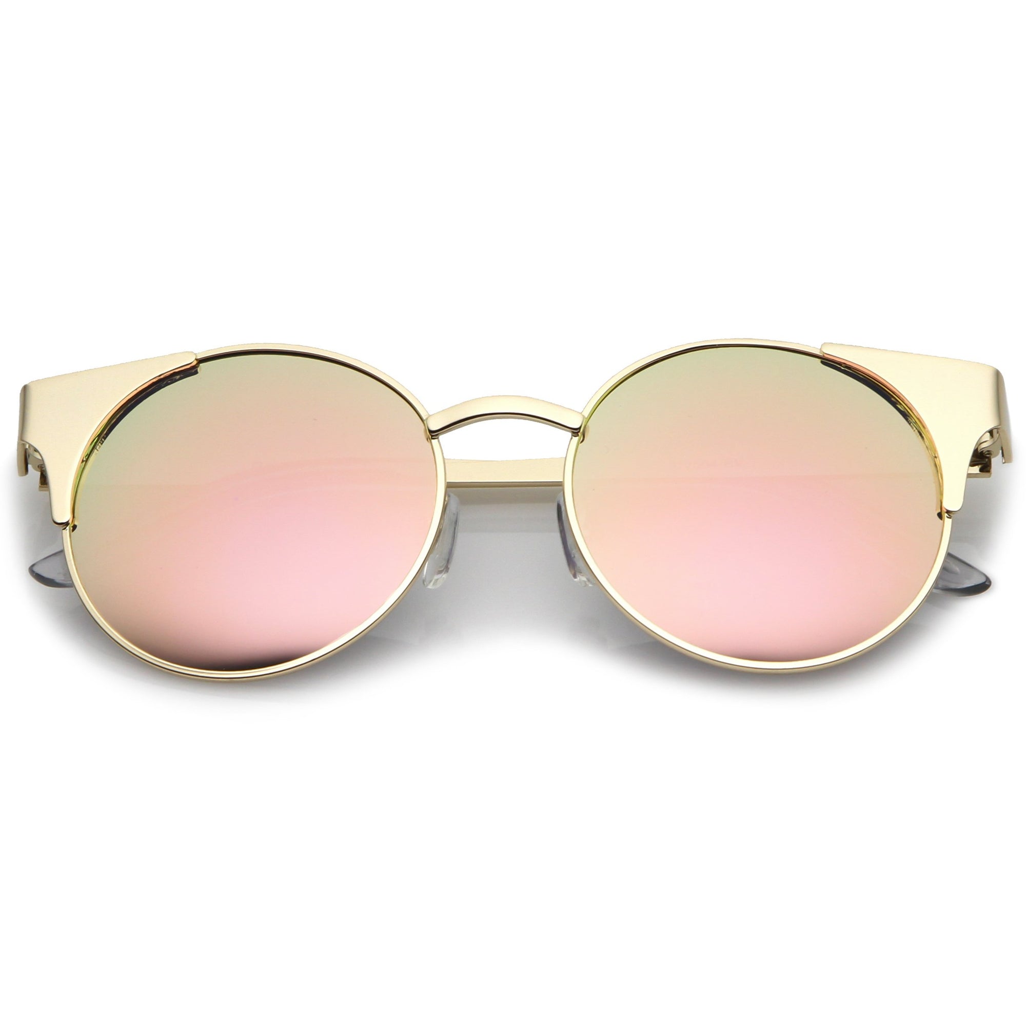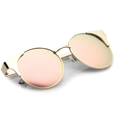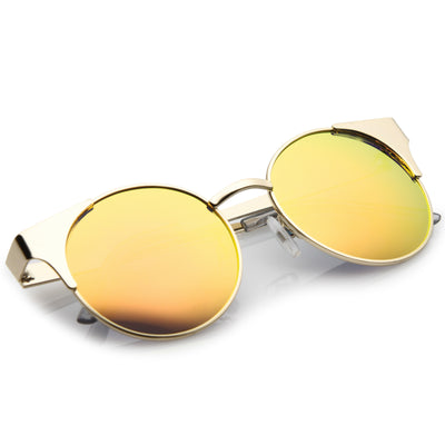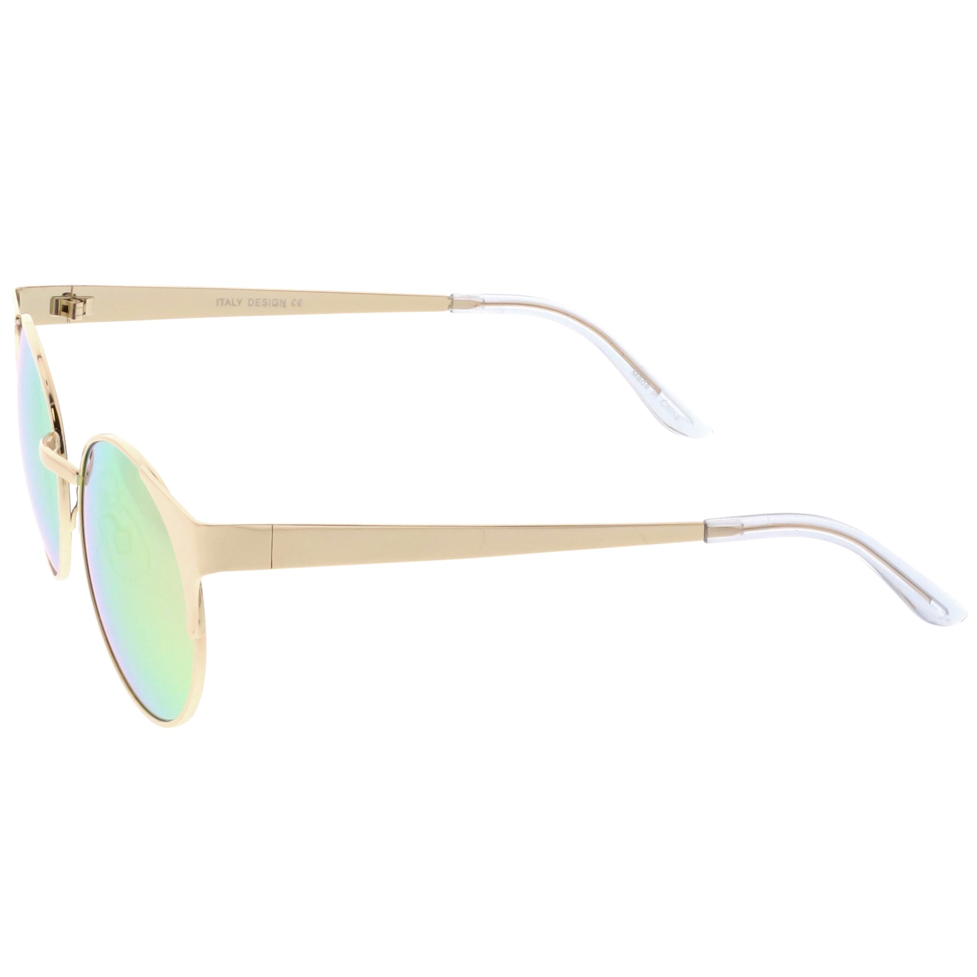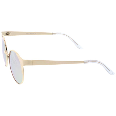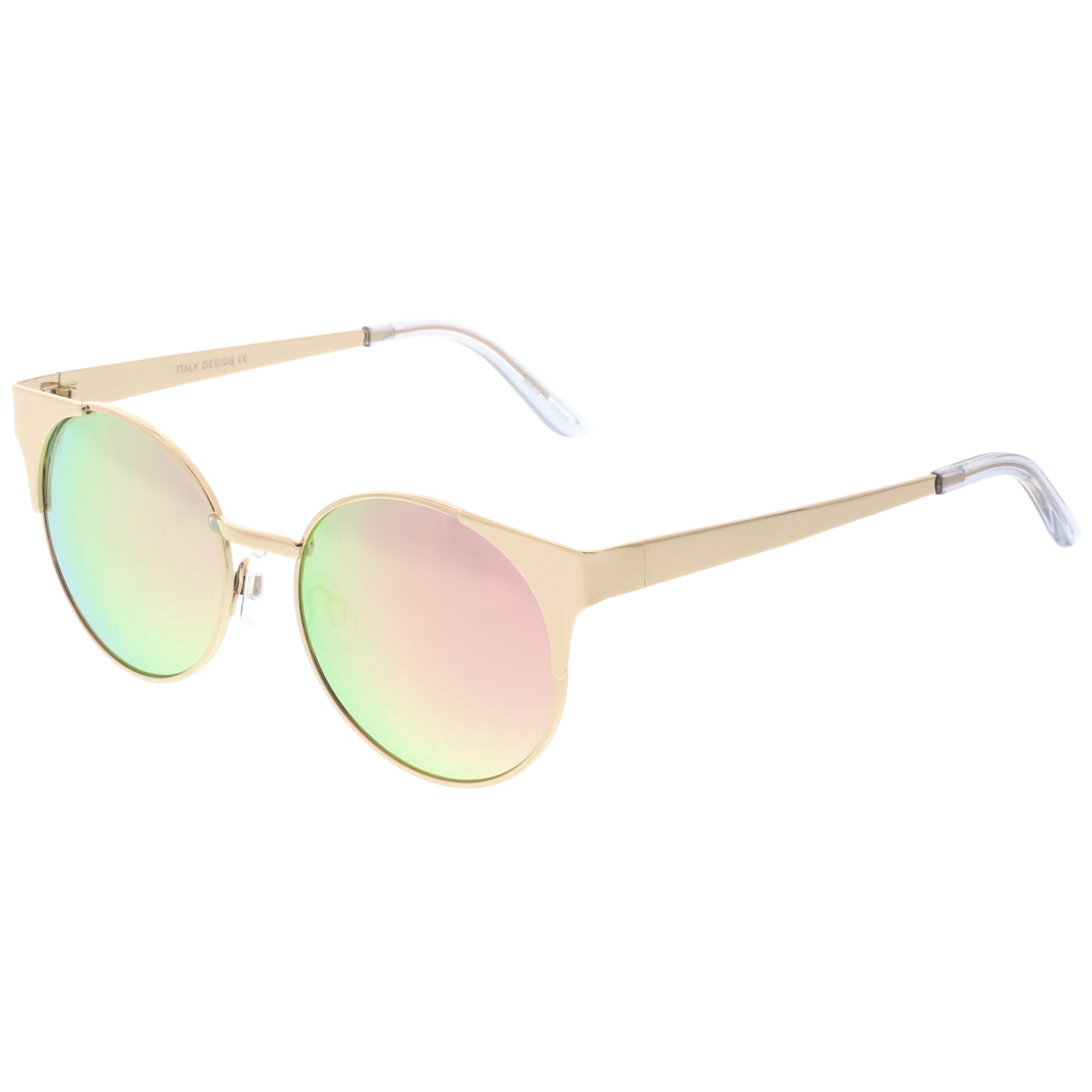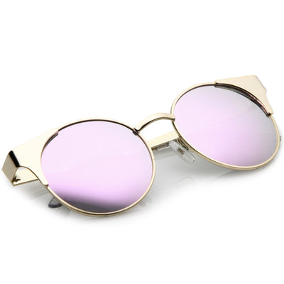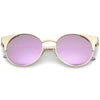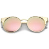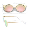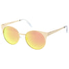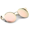 Eye-catching and cute, these metal cat eye sunglasses are exquisitely crafted with round colored mirror flat lenses for a stand out look. With it's sleek and minimal design, these sunglasses are perfect for adding a touch of luxe to your favorite outfits. Made with a metal based frame, adjustable English style nose pieces, metal hinges, and 100% UV protected lenses.