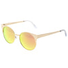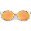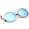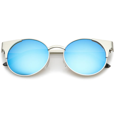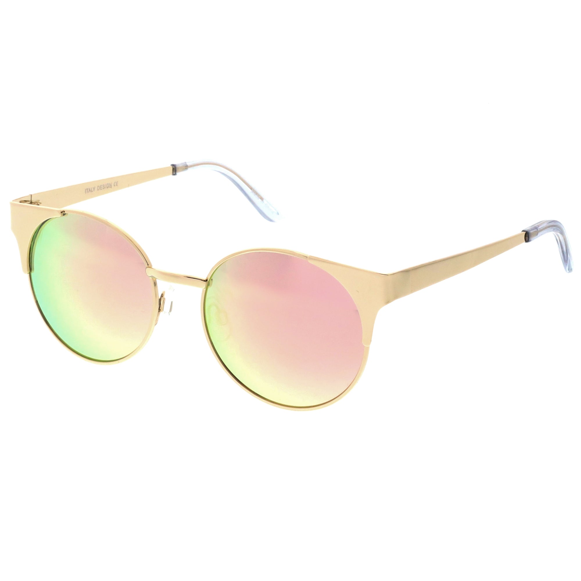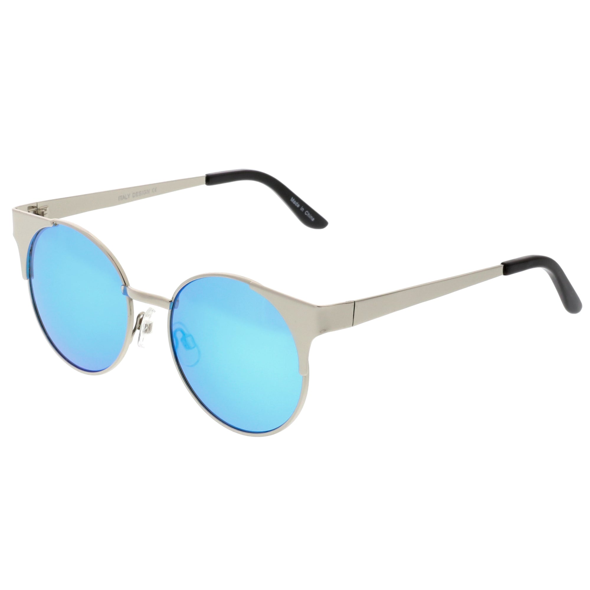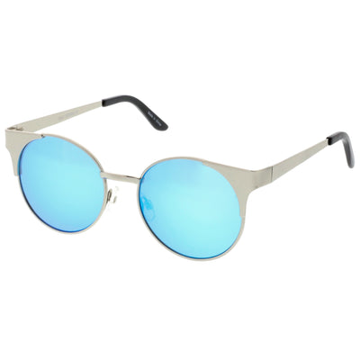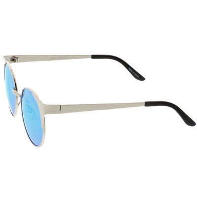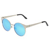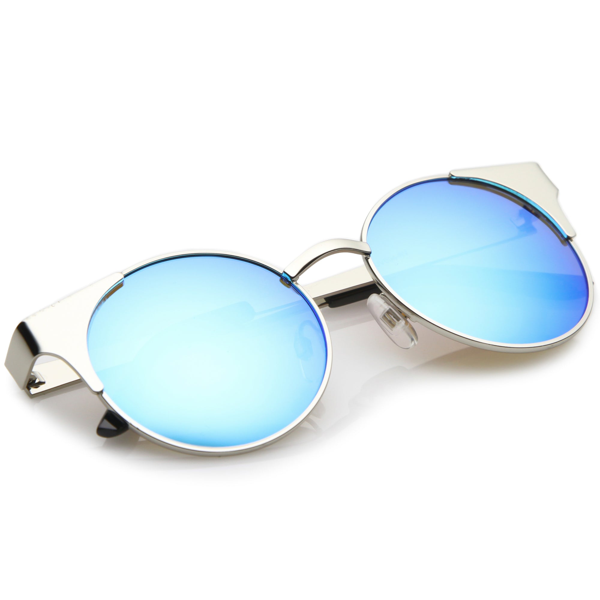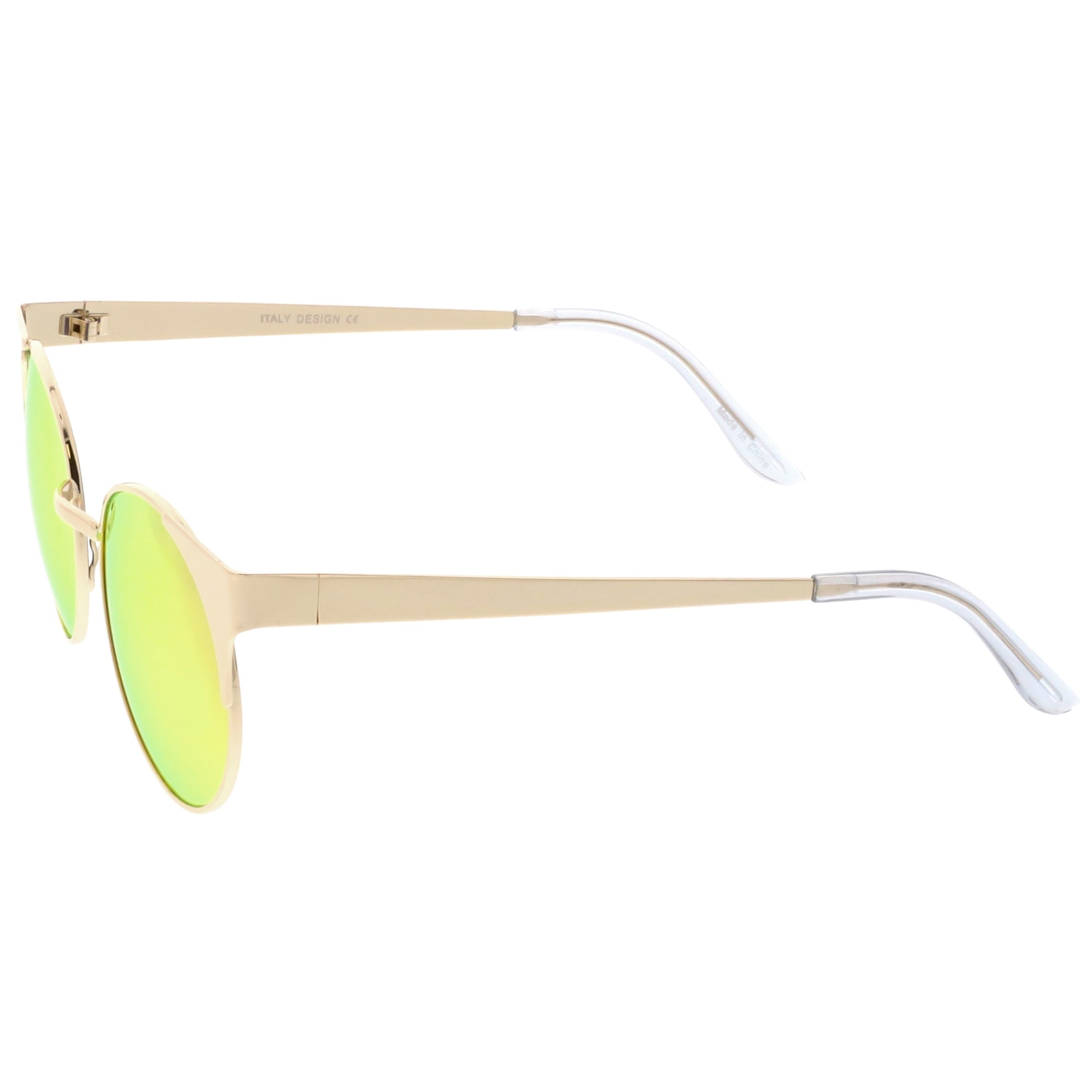 Eye-catching and cute, these metal cat eye sunglasses are exquisitely crafted with round colored mirror flat lenses for a stand out look. With it's sleek and minimal design, these sunglasses are perfect for adding a touch of luxe to your favorite outfits. Made with a metal based frame, adjustable English style nose pieces, metal hinges, and 100% UV protected lenses.