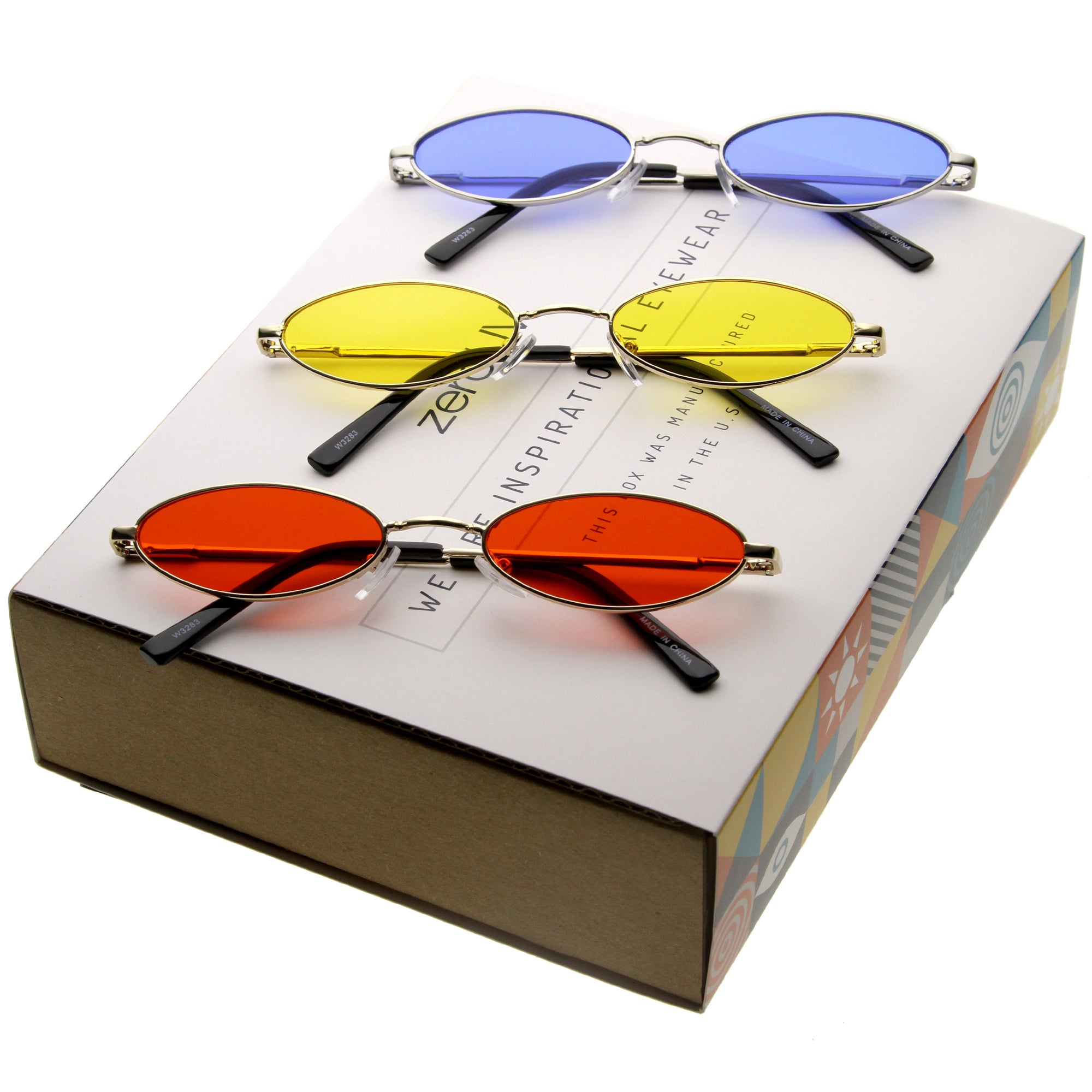 Details Includes zeroUV Gift Box - Flash back to the 90's with this classic, extremely small, oval sunglasses. Wear these celebrity must-have sunglasses with any outfit, and you'll have people doing a double take. The sleek, full metal design is made with adjustable nose pieces and color tinted flat lenses for some added edge. Finished with a metal-based frame, metal hinges, adjustable English style nose pieces, and 100% UV protected lenses.