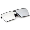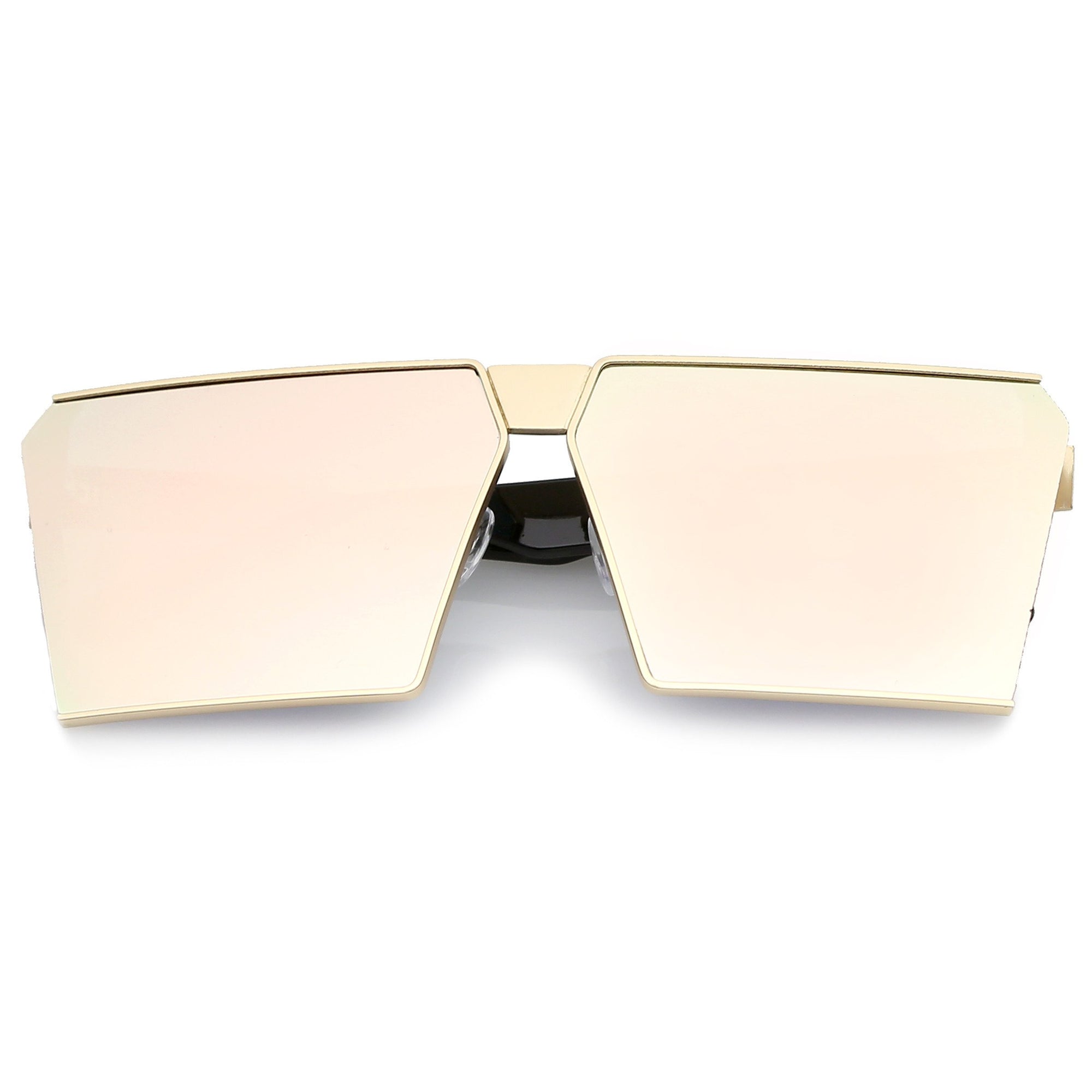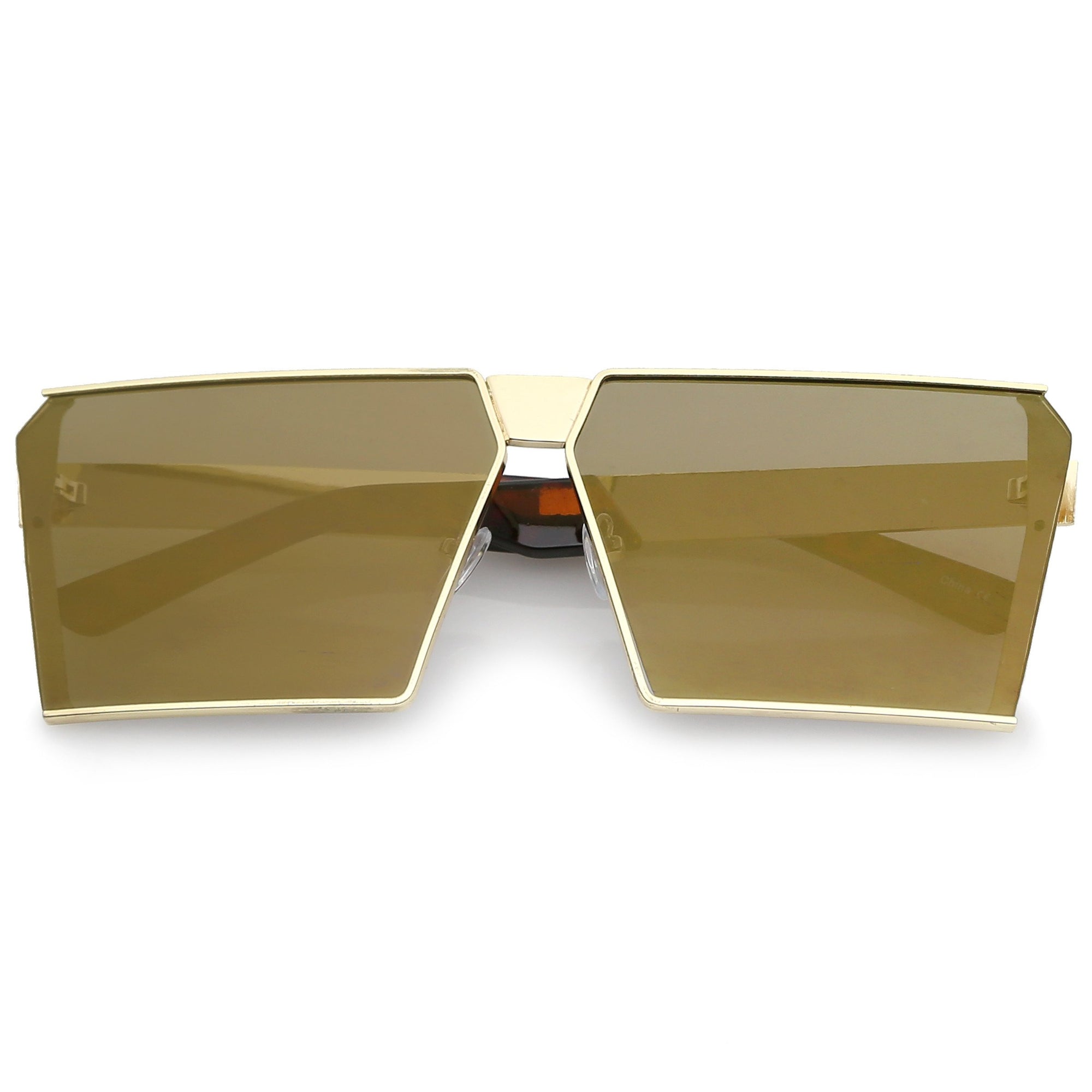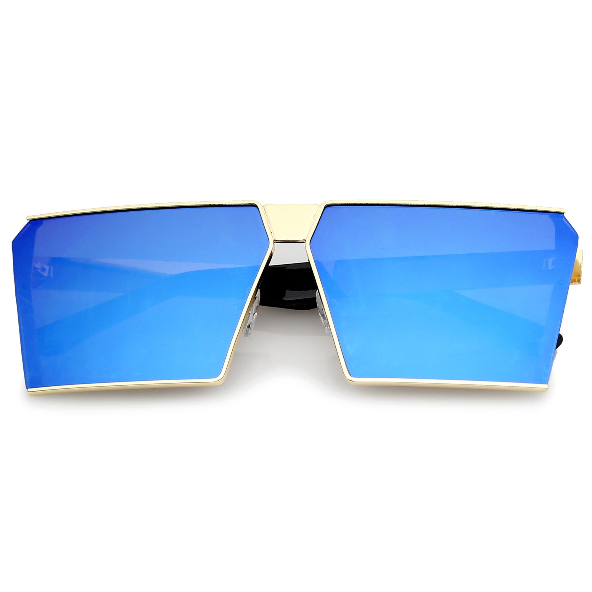 • Bold and sophisticated, these metal square sunglasses feature a semi-rimless frame with a flat top design. Accented with colored mirror flat lenses for a stunning effect and textured wide metal temples, these square sunglasses offer a sleek look with eye-catching appeal. Made with a metal and plastic based frame, English style nose pieces, metal hinges, and reflective UV400 protected lenses.