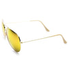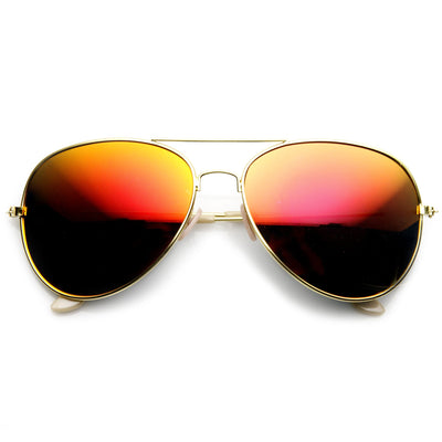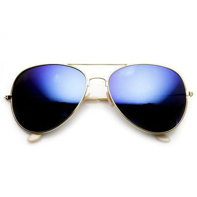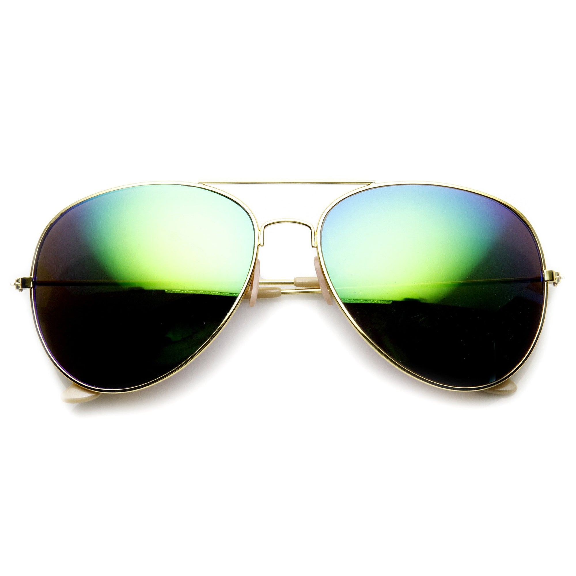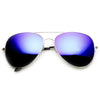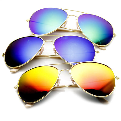 Large metal teardrop aviator frame with eye catching color mirror colors. A classic frame with a fresh color mirrored lens make these a must have for the warm and sunny season. Made with a metal based frame , English style nose pieces and flash color polycarbonate UV protected lenses.