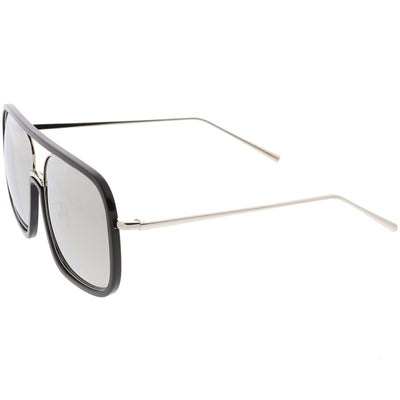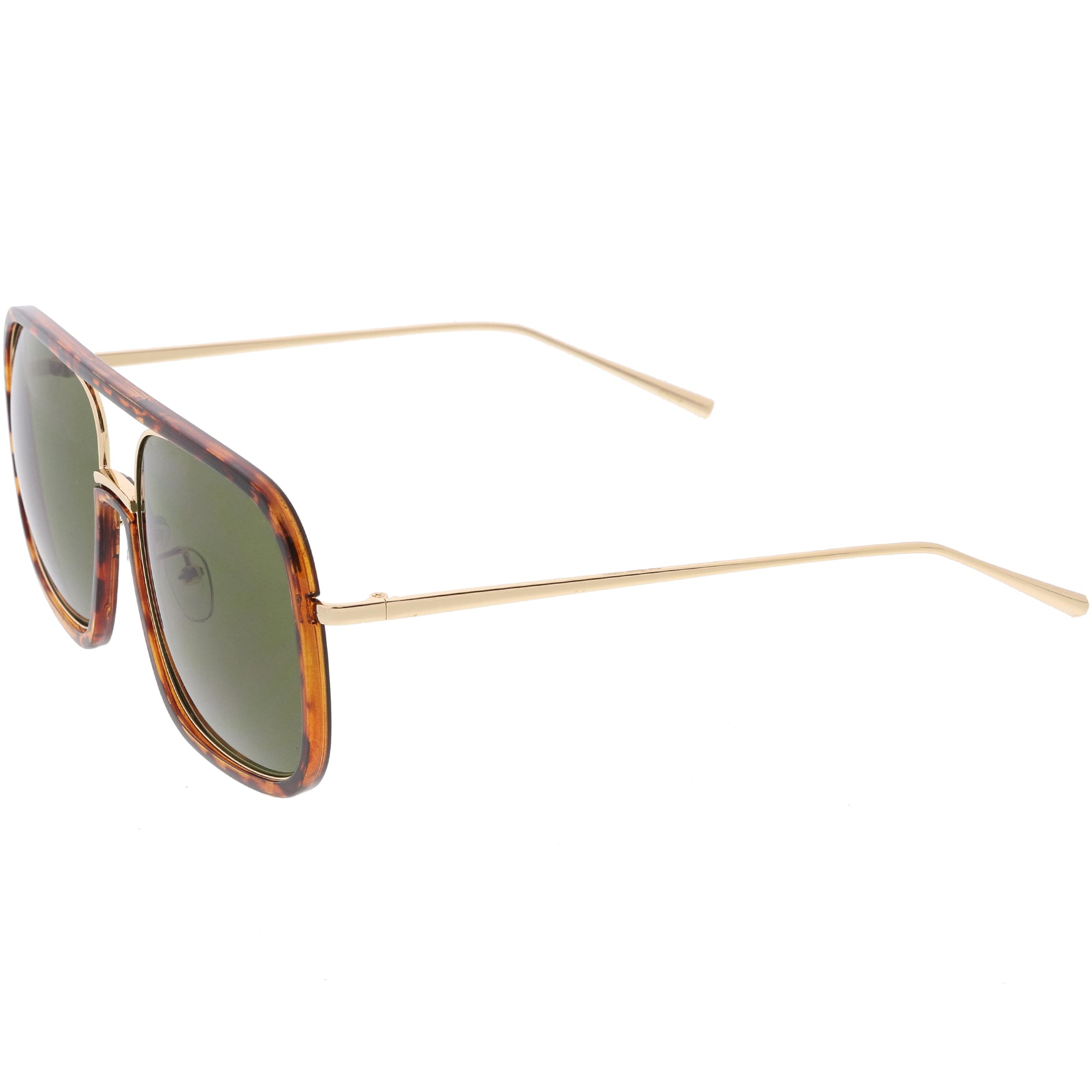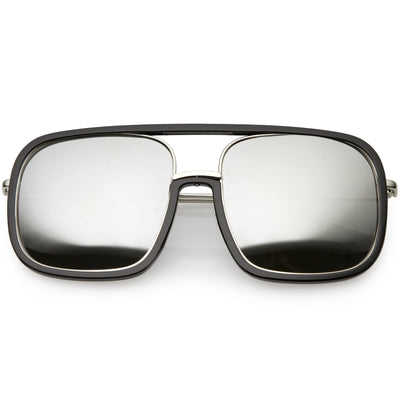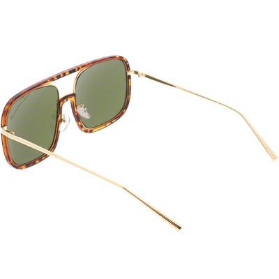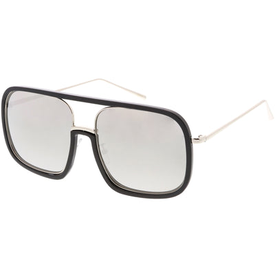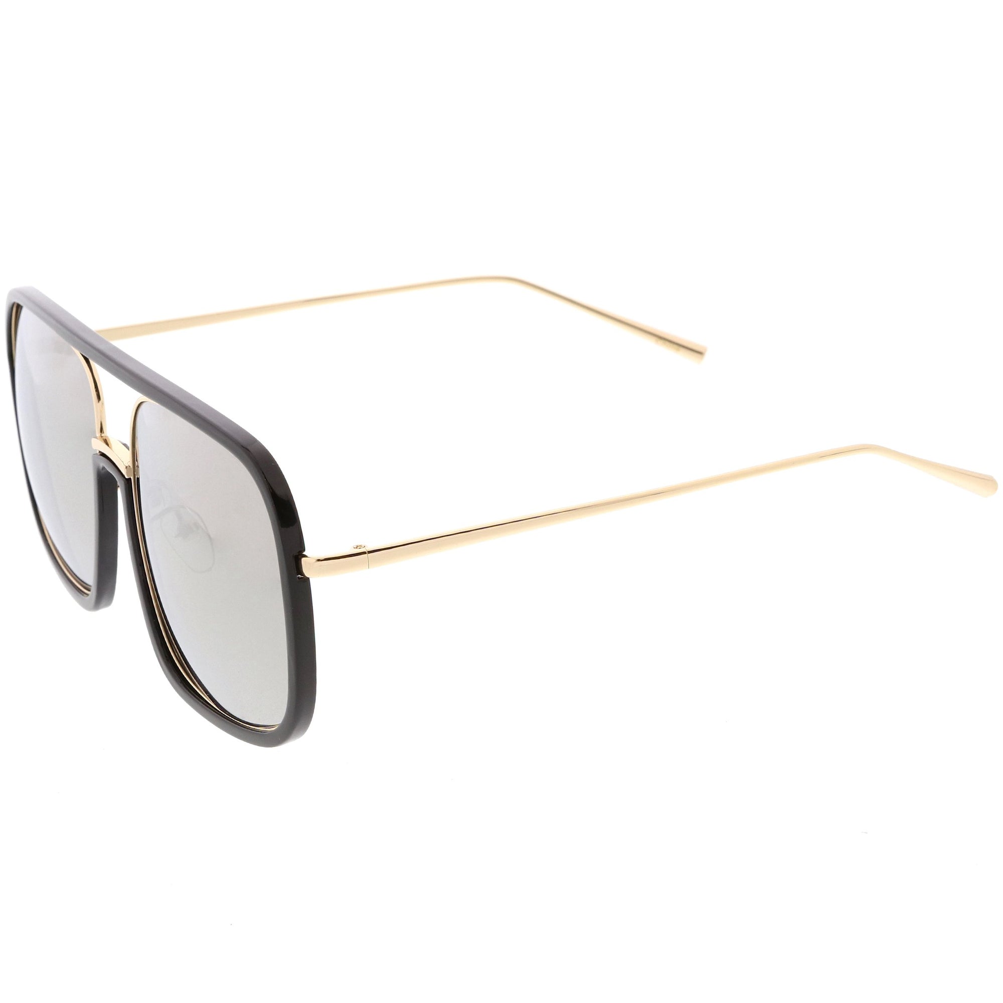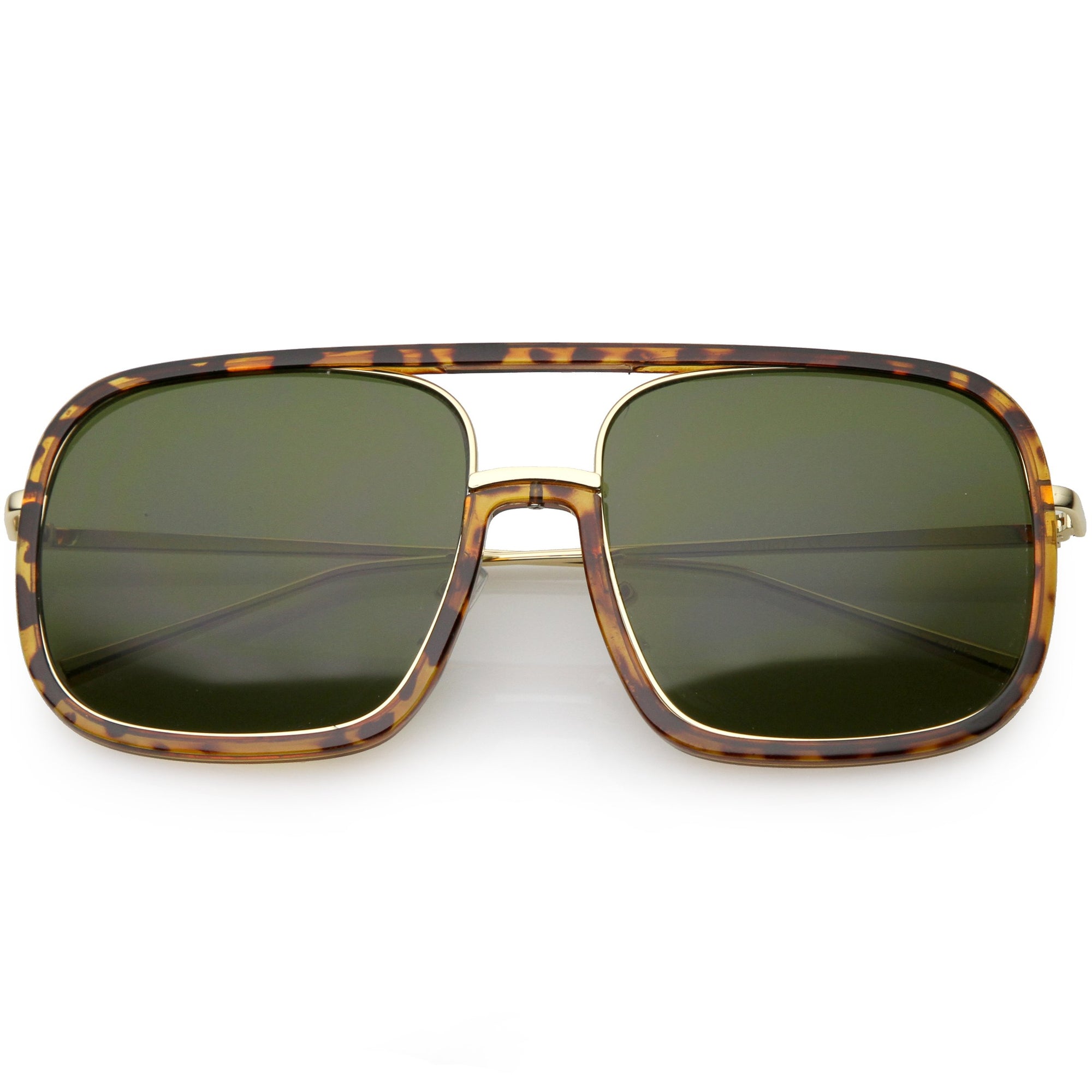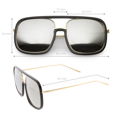 Stylishly cool and modern, these oversize aviator sunglasses are exquisitely design with a flat top and metal trim for a luxurious effect. Square lenses in neutral colored and colored mirrored hues give it it's stand-out look, while thin metal arms finishes it with a sleek touch. Rock it for a beach or pool party this summer season! Made with a plastic and metal based frame, adjustable English style nose pieces, metal hinges, and 100% UV protected lenses.