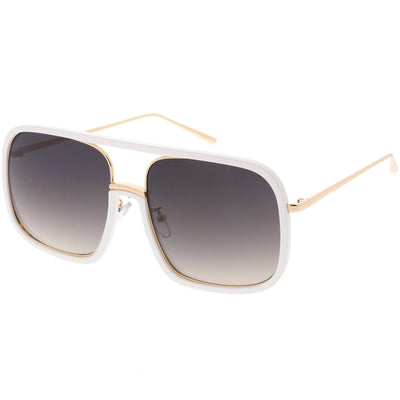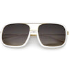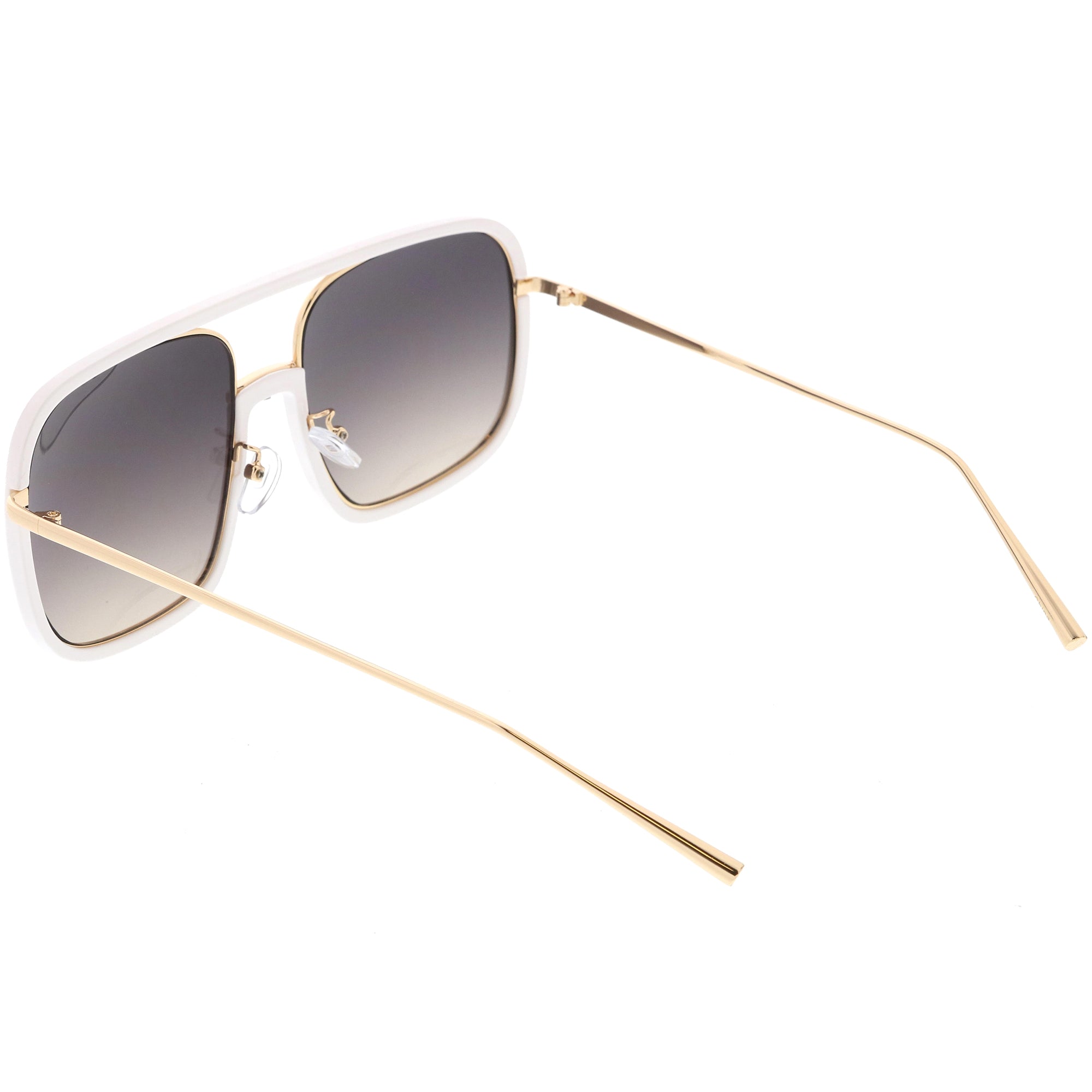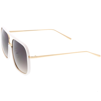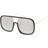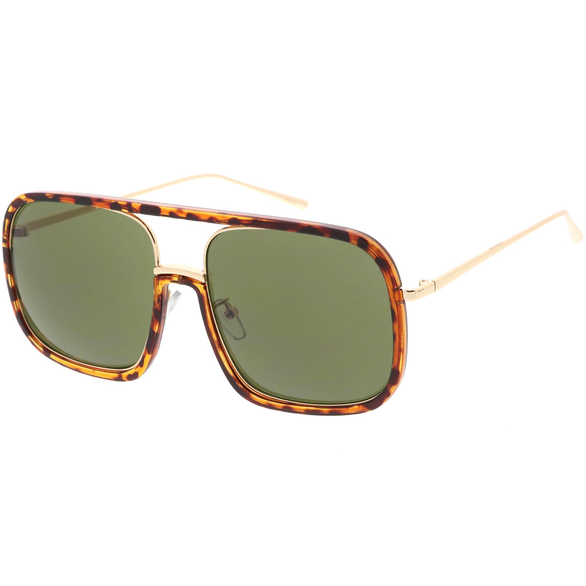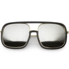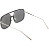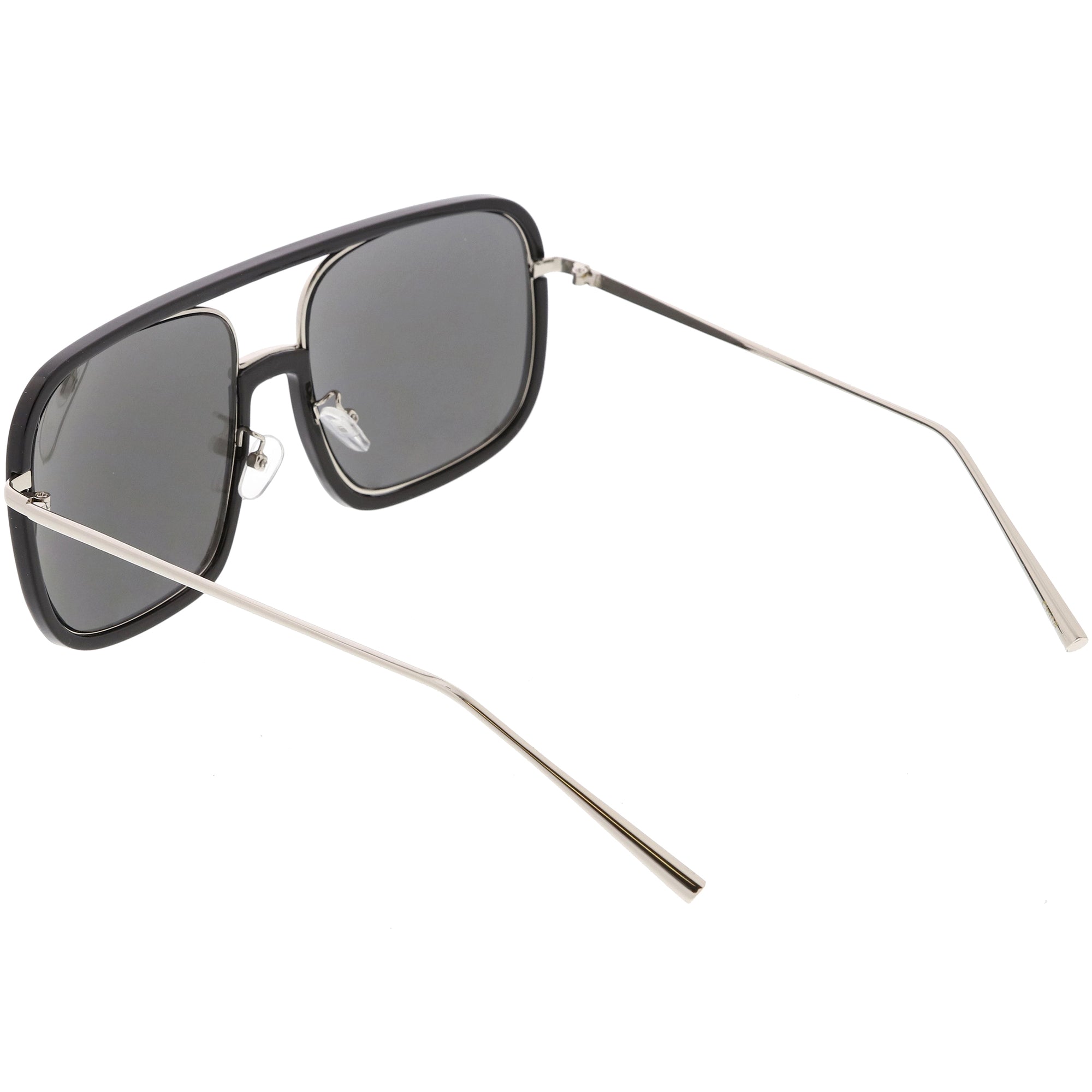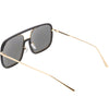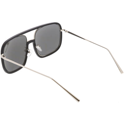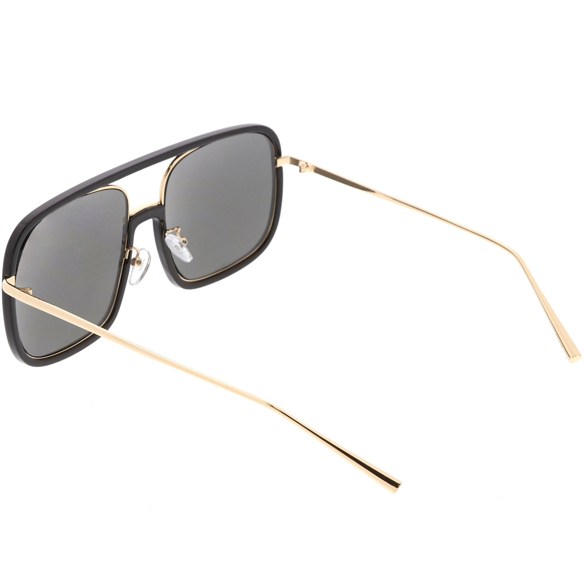 Stylishly cool and modern, these oversize aviator sunglasses are exquisitely design with a flat top and metal trim for a luxurious effect. Square lenses in neutral colored and colored mirrored hues give it it's stand-out look, while thin metal arms finishes it with a sleek touch. Rock it for a beach or pool party this summer season! Made with a plastic and metal based frame, adjustable English style nose pieces, metal hinges, and 100% UV protected lenses.