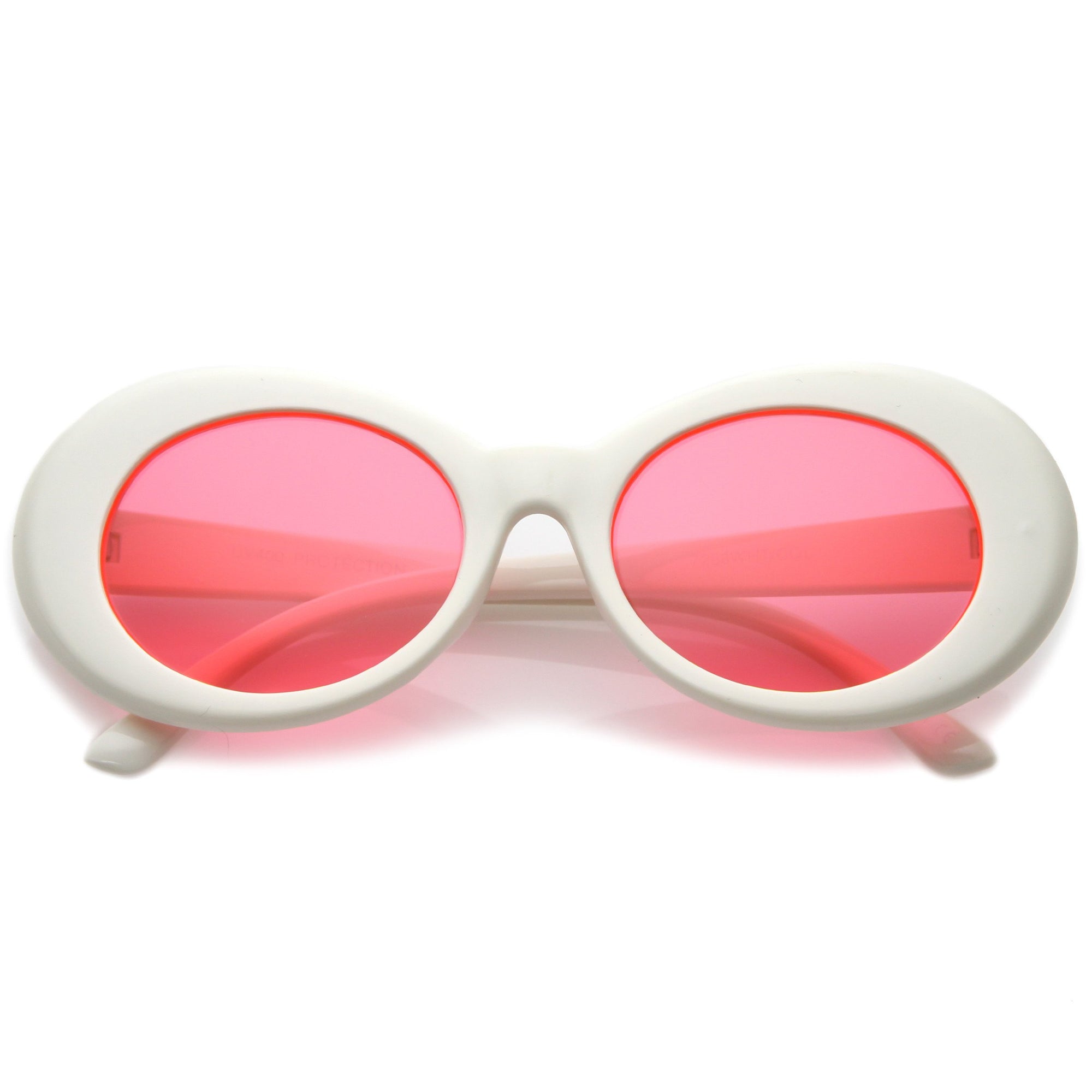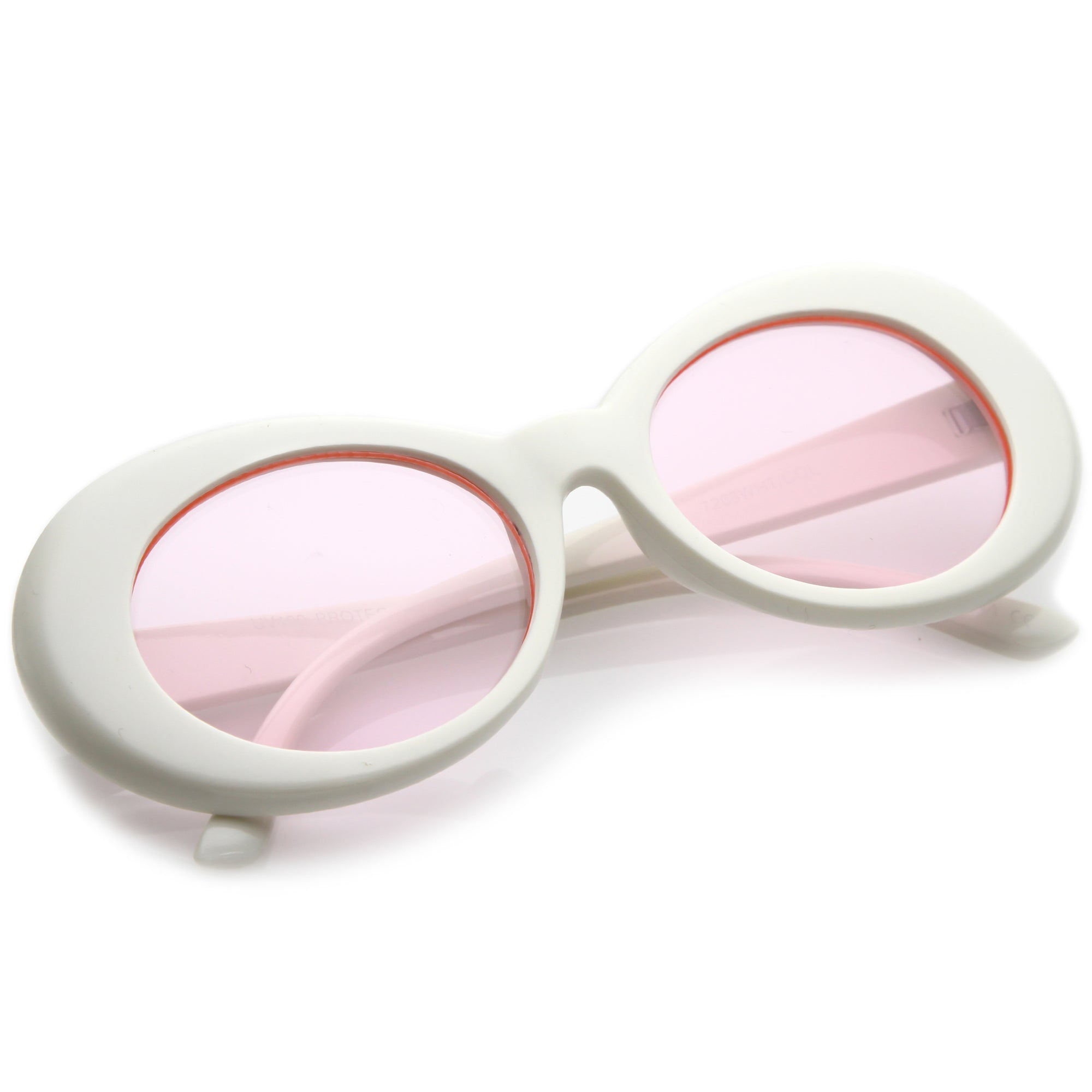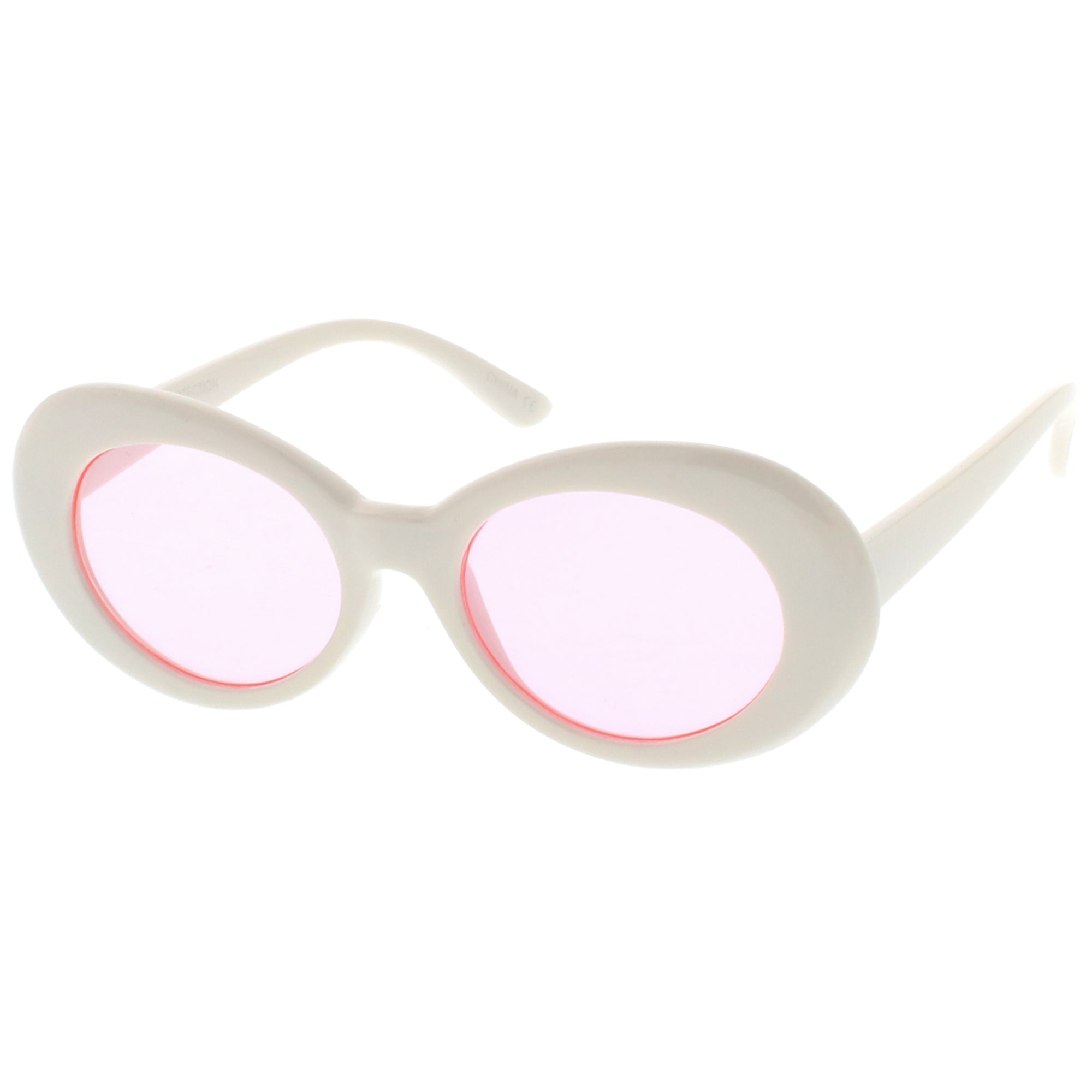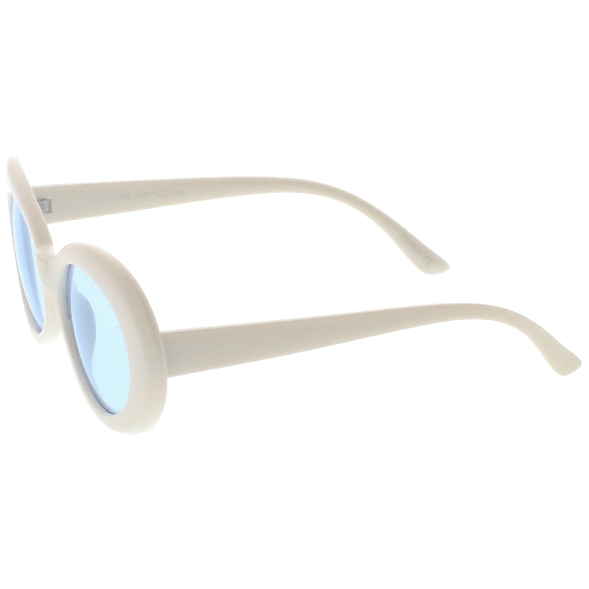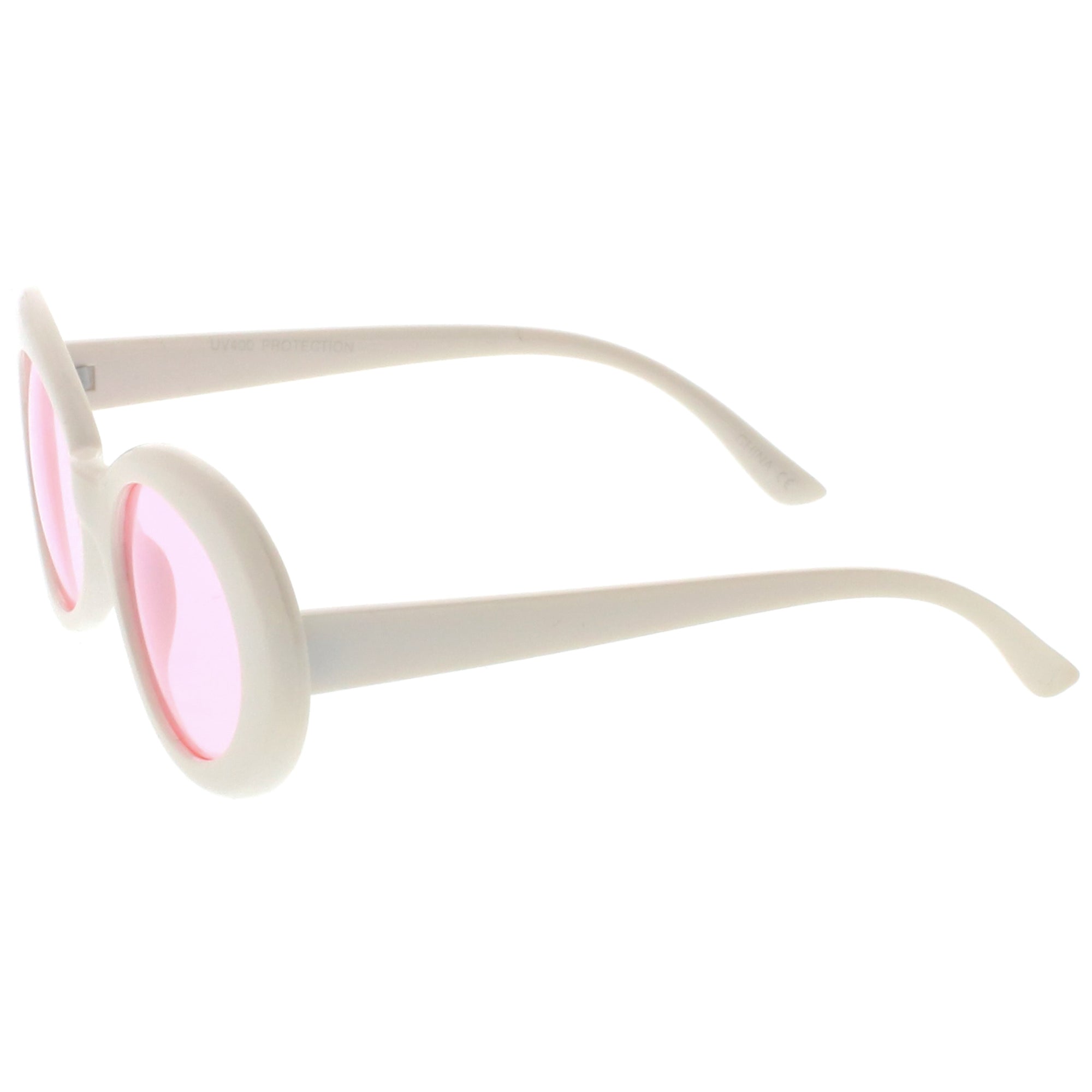 Retro and cool, these white oval clout sunglasses are designed with a rounded oval-shaped frame and round lenses in various colors. Complete with arms that taper at the ends and reinforced metal hinges, these chic sunglasses add a fun element to any outfit. Made with plastic based frame and 100% UV protected lenses.