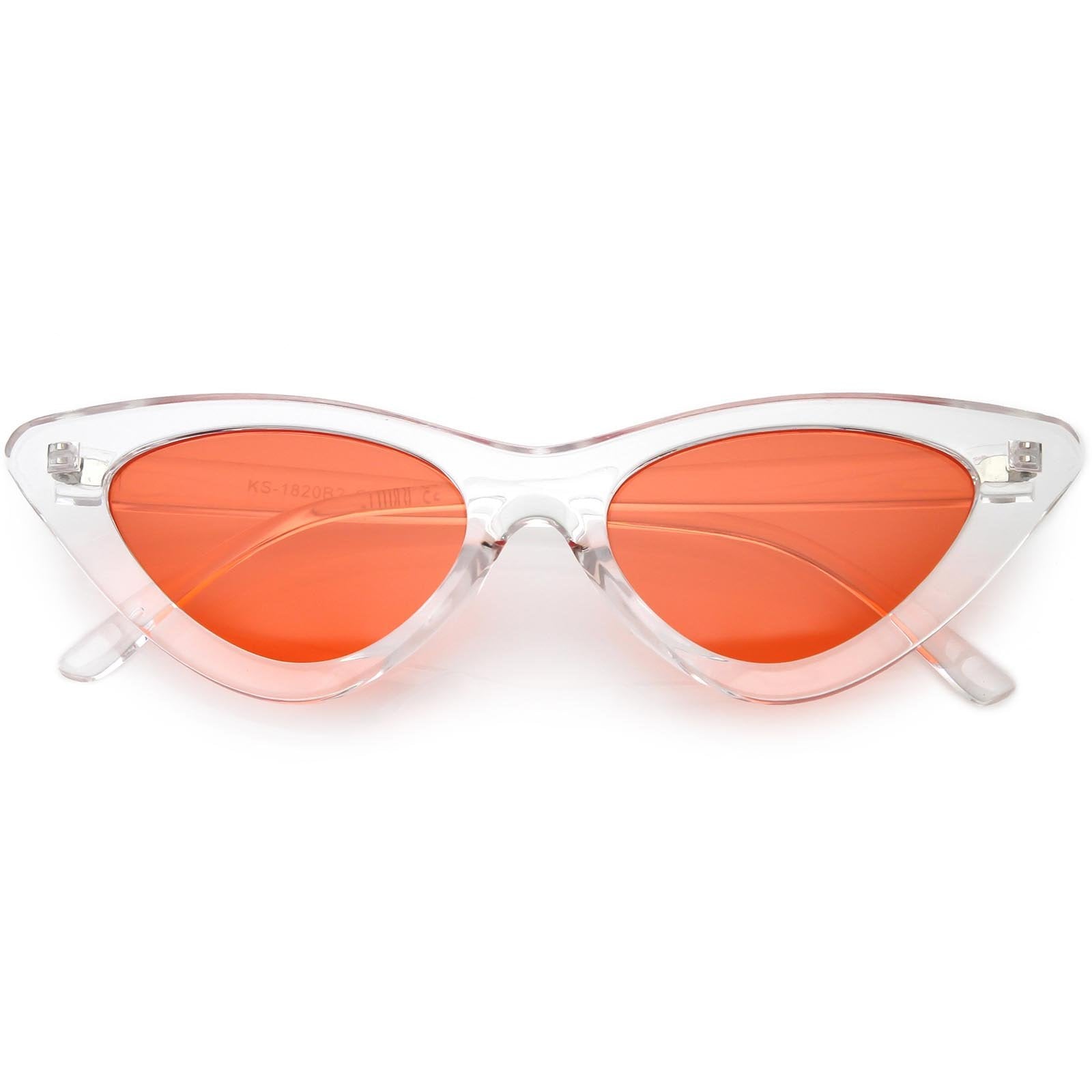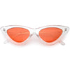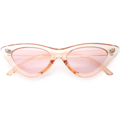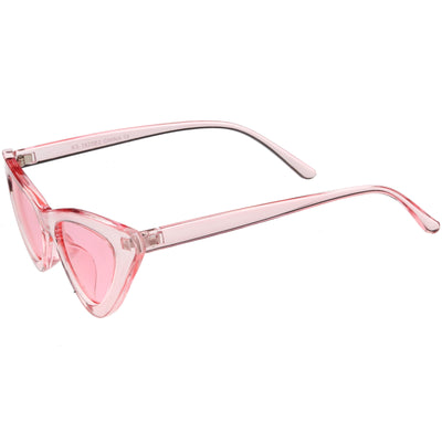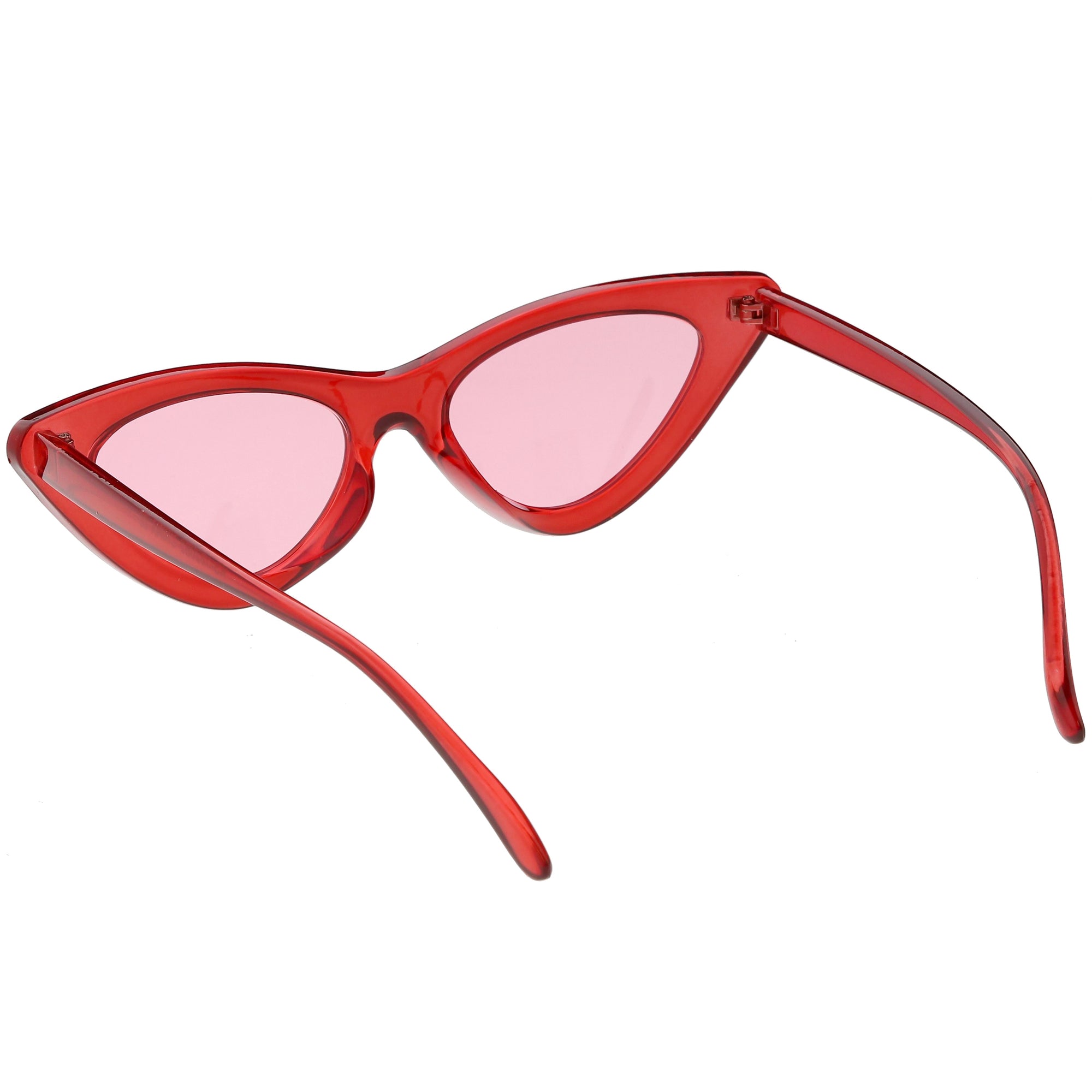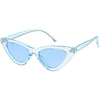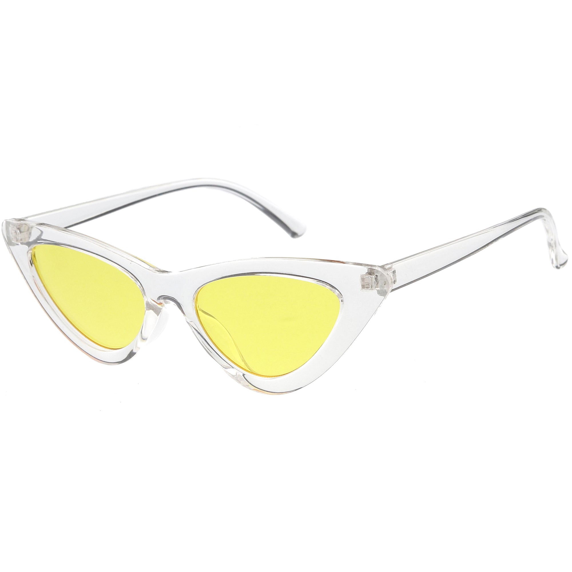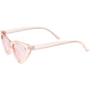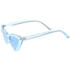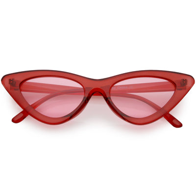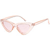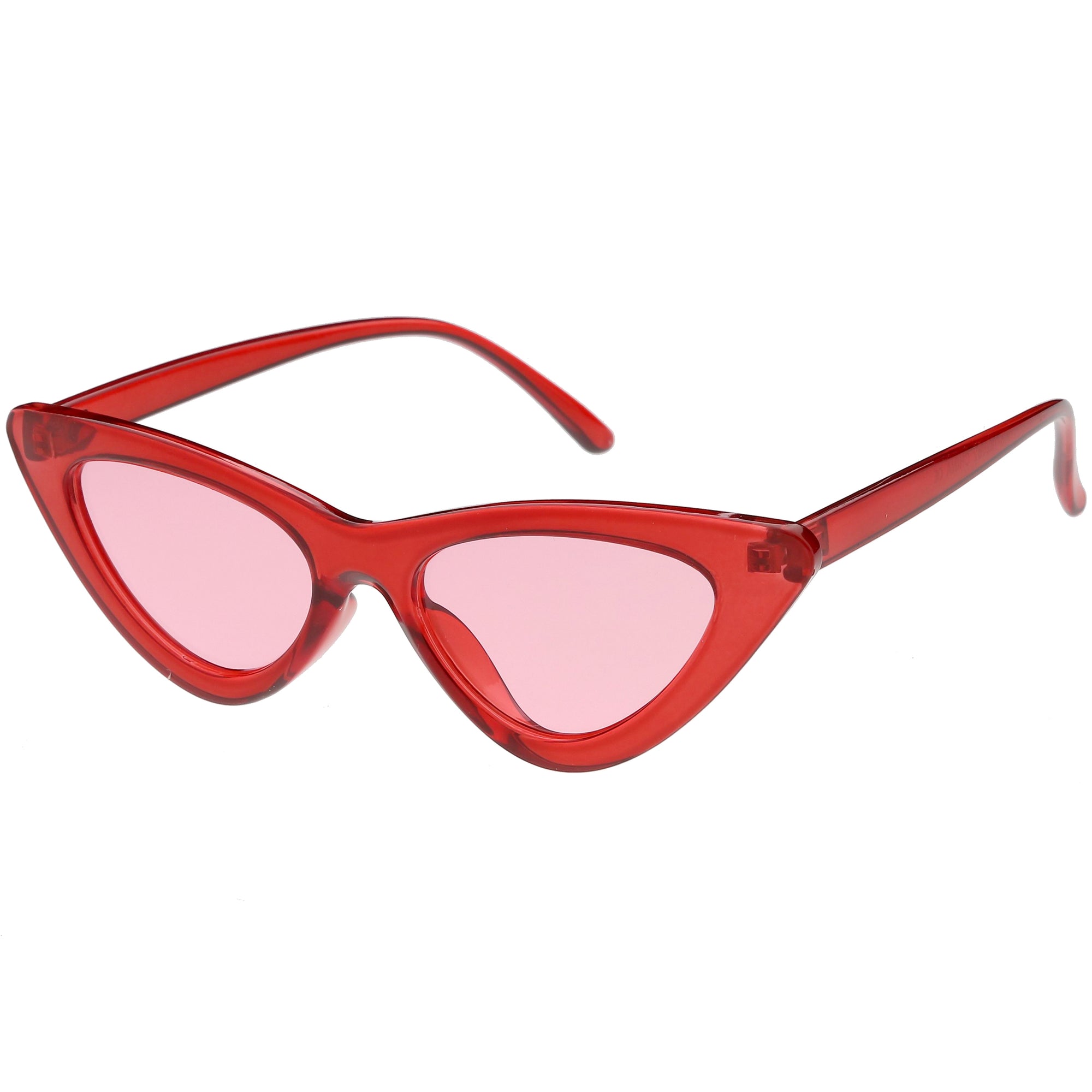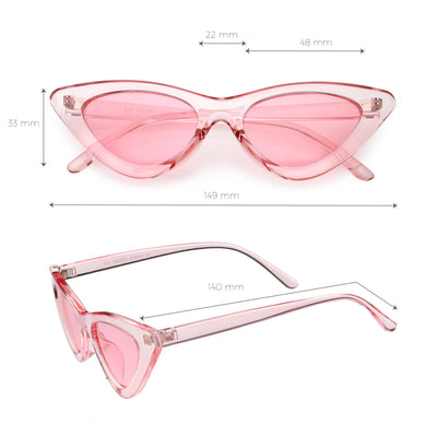 Retro 1990's fashion cat eye sunglasses featuring an exaggerated translucent cat eye frame. Complete with color tinted lenses and high sitting arms, these stylishly chic sunglasses are the must-have accessory to accent this season's outfits. Made with a plastic based frame, reinforced metal hinges, and 100% UV protected lenses.