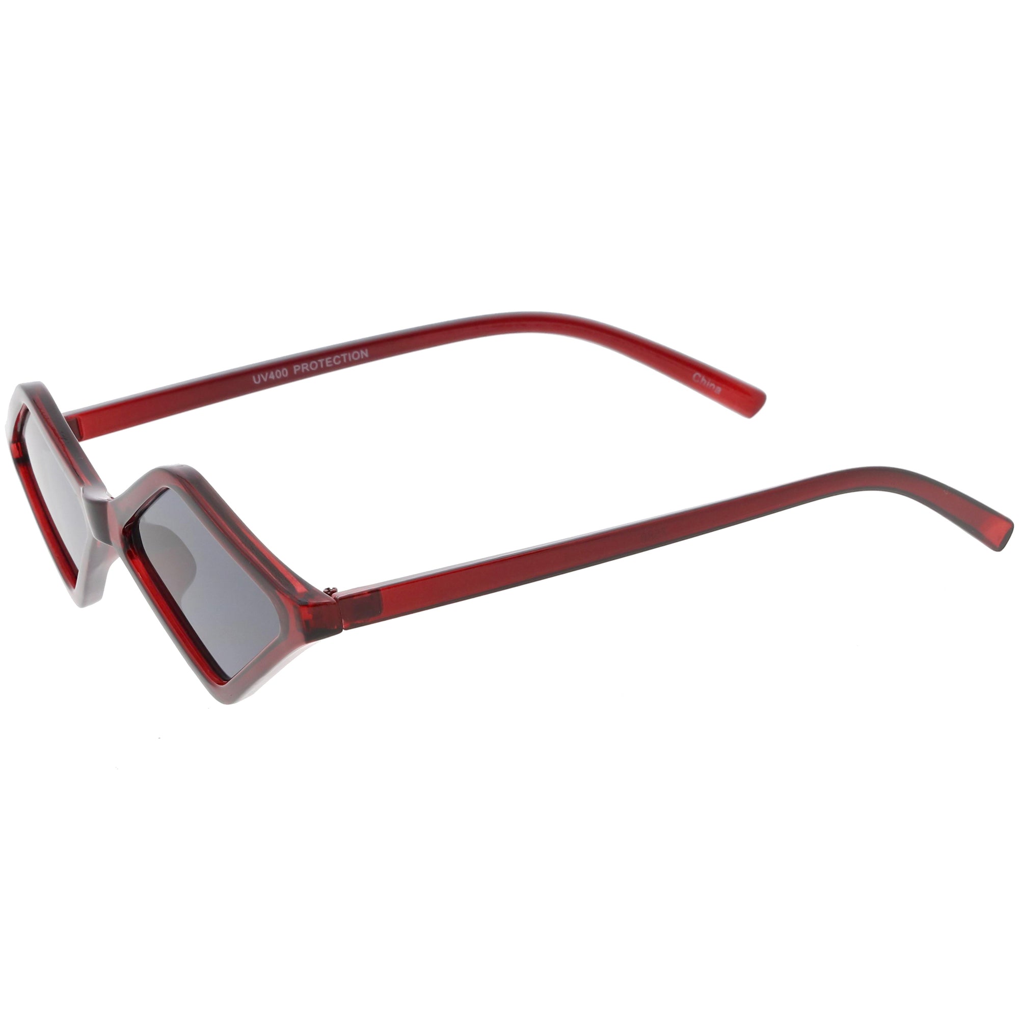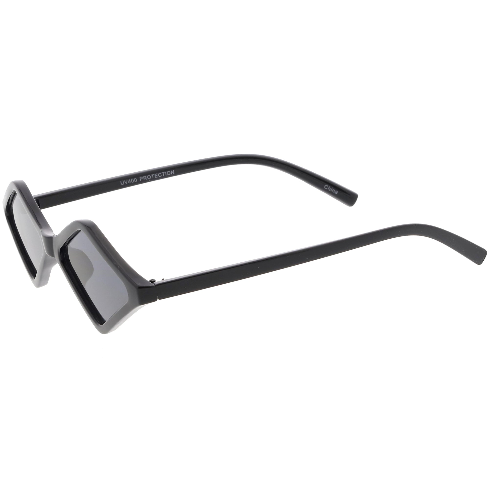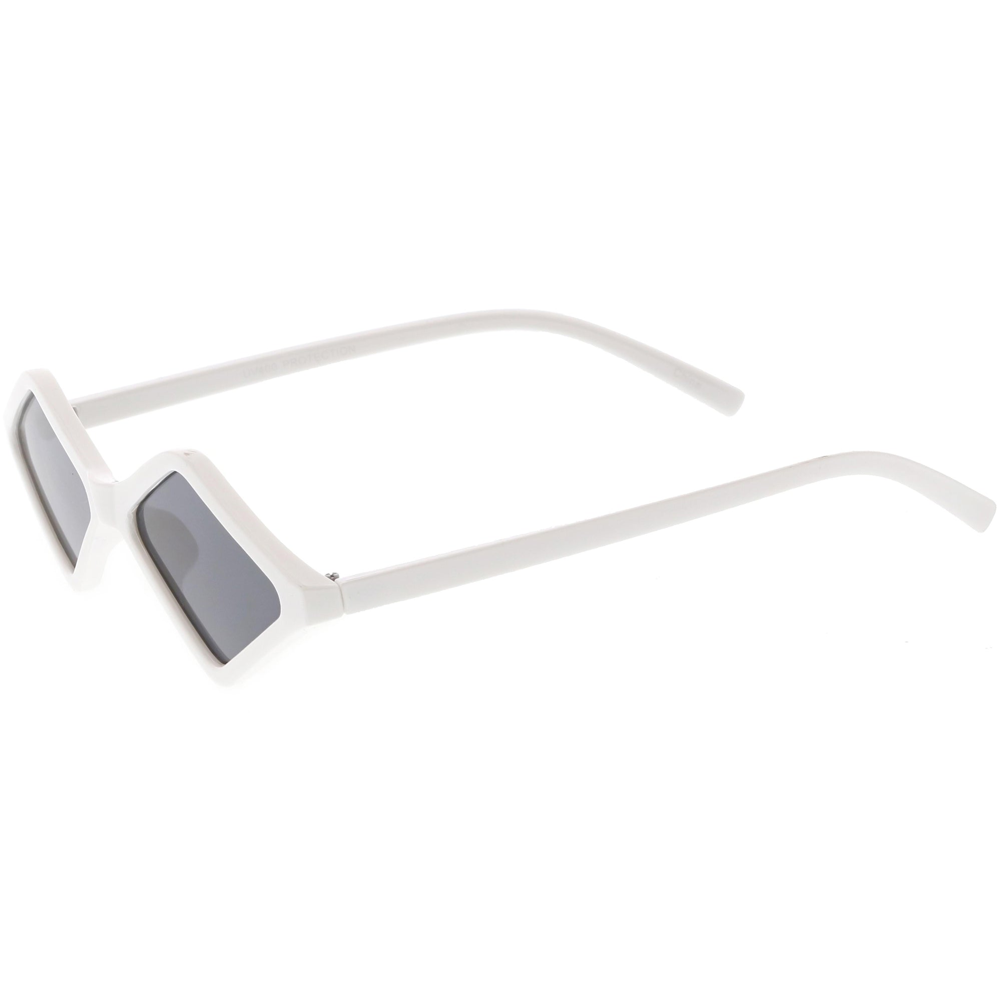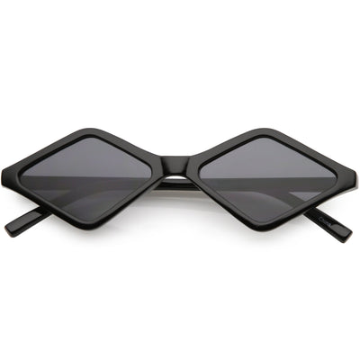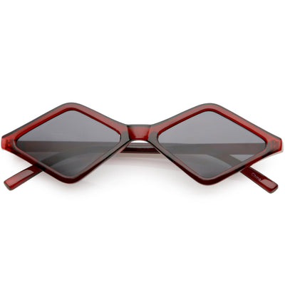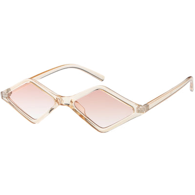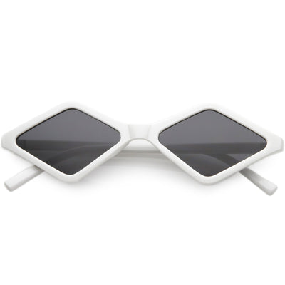 Edgy and cool, these geometric diamond shaped sunglasses feature contrasting neutral colored lenses and slim arms for a sleek effect. With a small design giving off 90's vibes, these fashion forward sunnies are a total must-have accessory. Made with a plastic based frame, reinforced metal hinges, and 100% UV protected lenses.