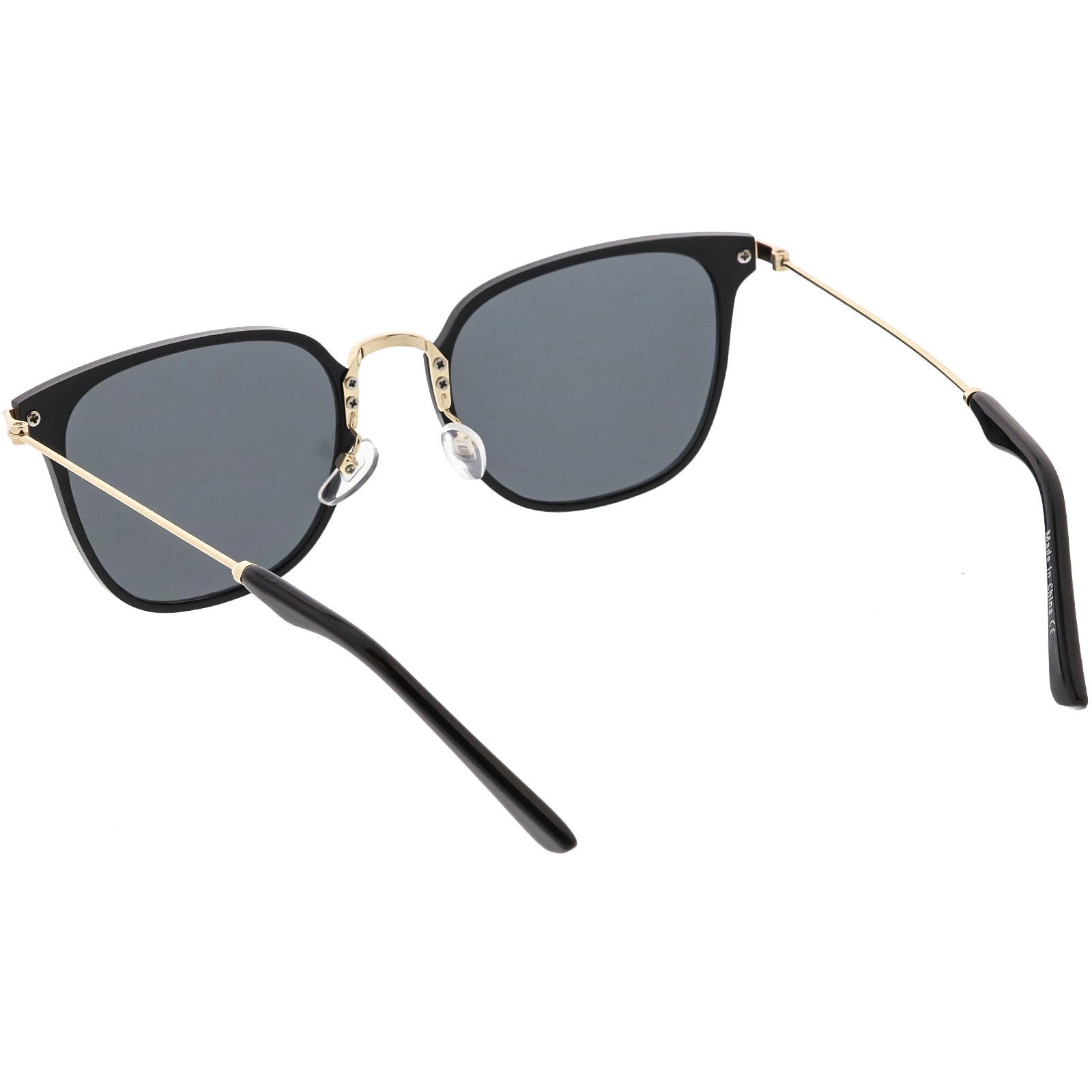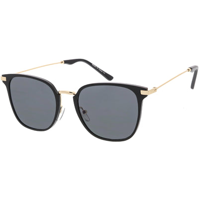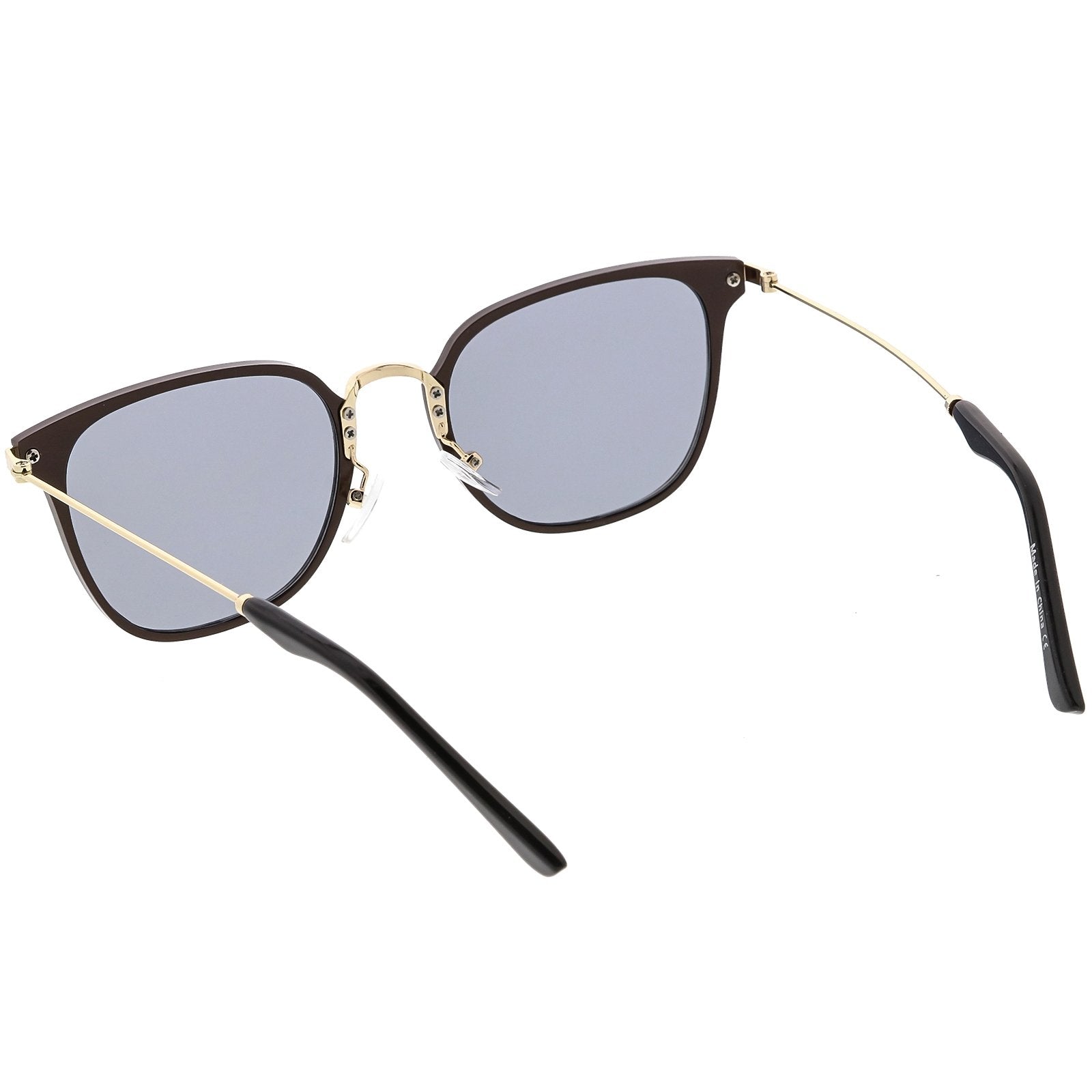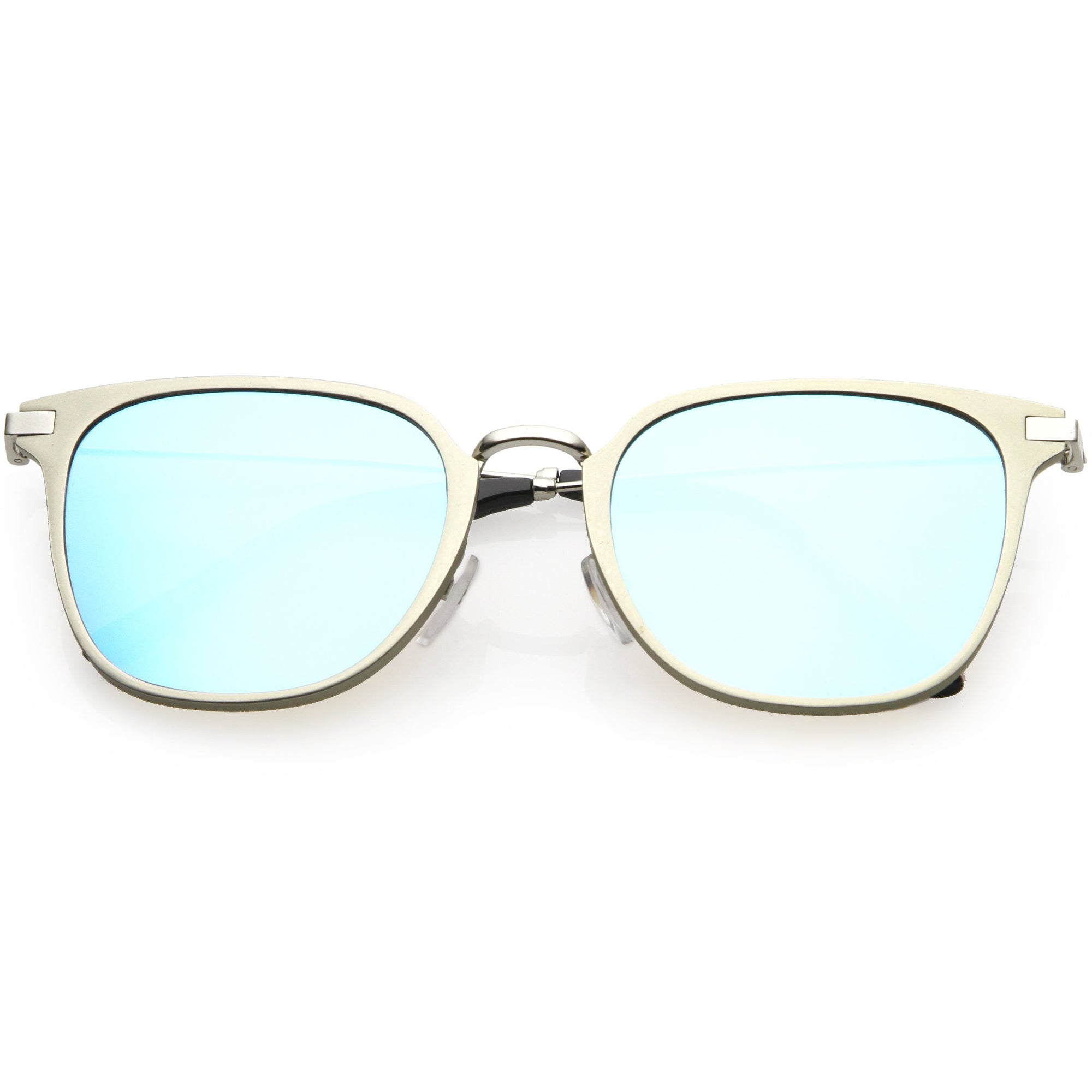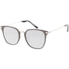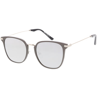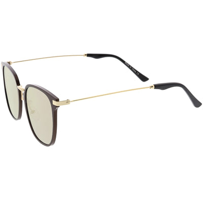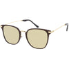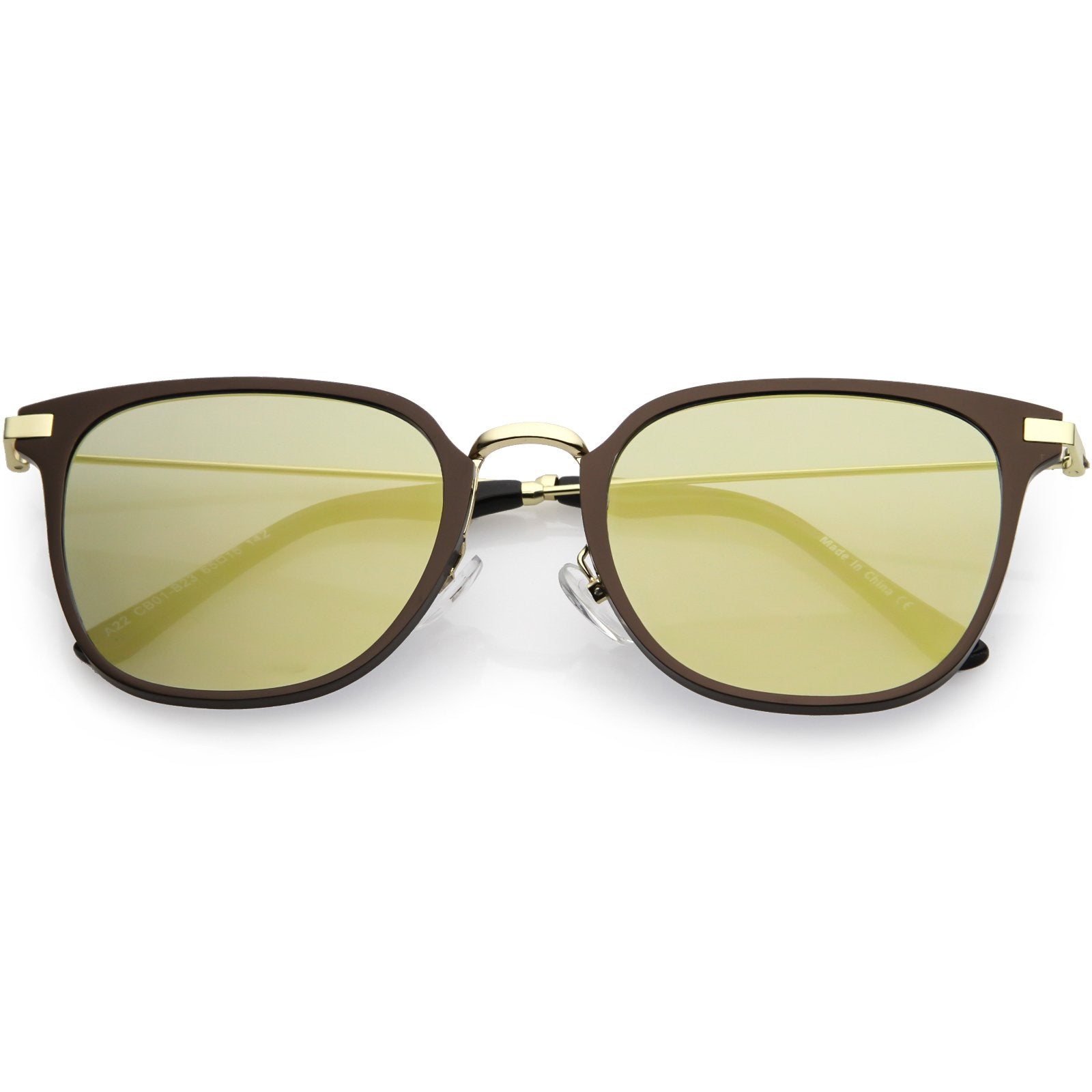 A classic style that can be worn everyday, these square sunglasses are exquisitely crafted with a metal frame and a subtle horn rimmed shape. Flat lenses in neutral and mirrored lenses give it a modern feel, while ultra slim metal arms give it a sleek look. Complete with a metal nose bridge, these horn rimmed square sunglasses are easy to pair with any outfit. Made with a metal based frame, adjustable English style nose pieces, metal hinges, and 100% UV protected lenses.