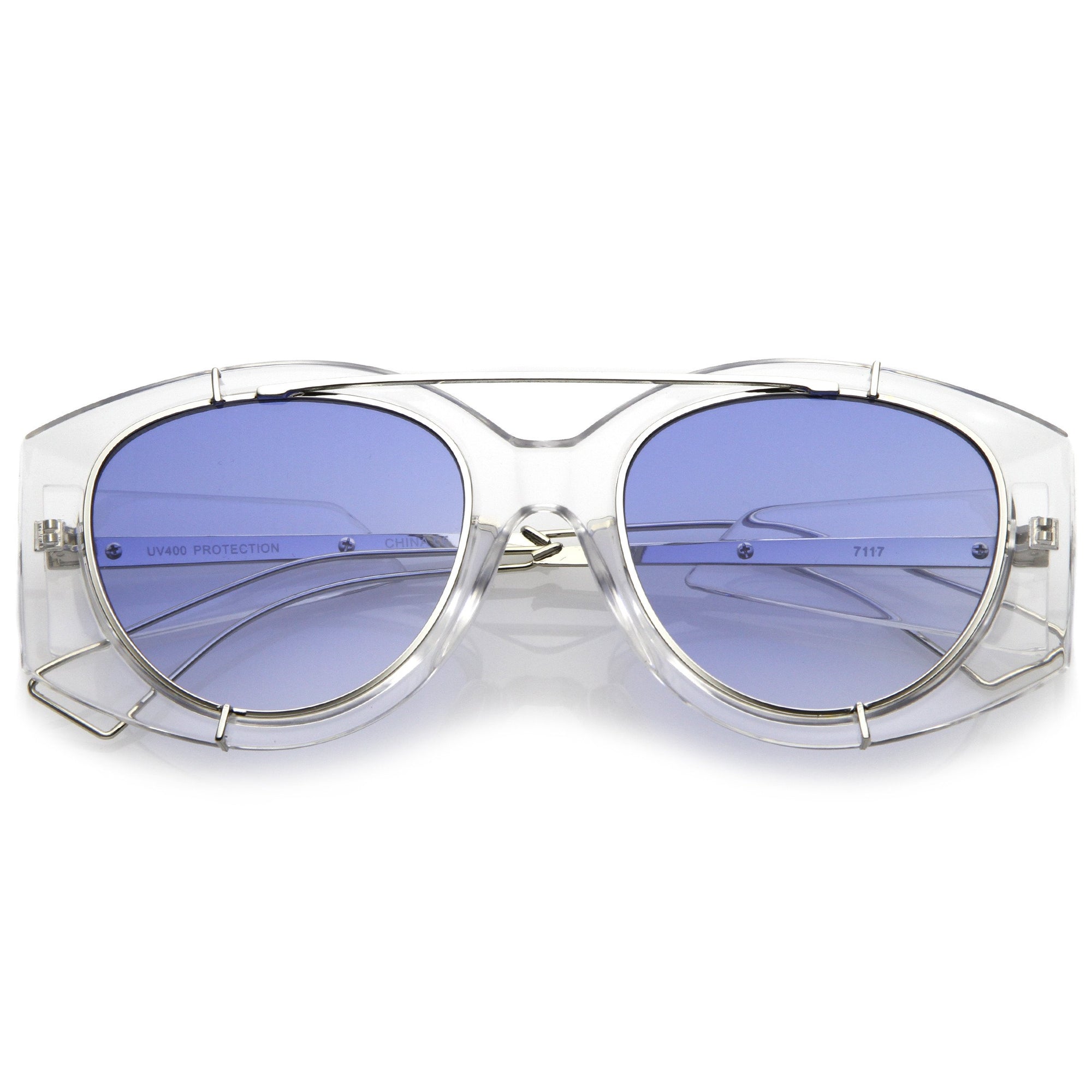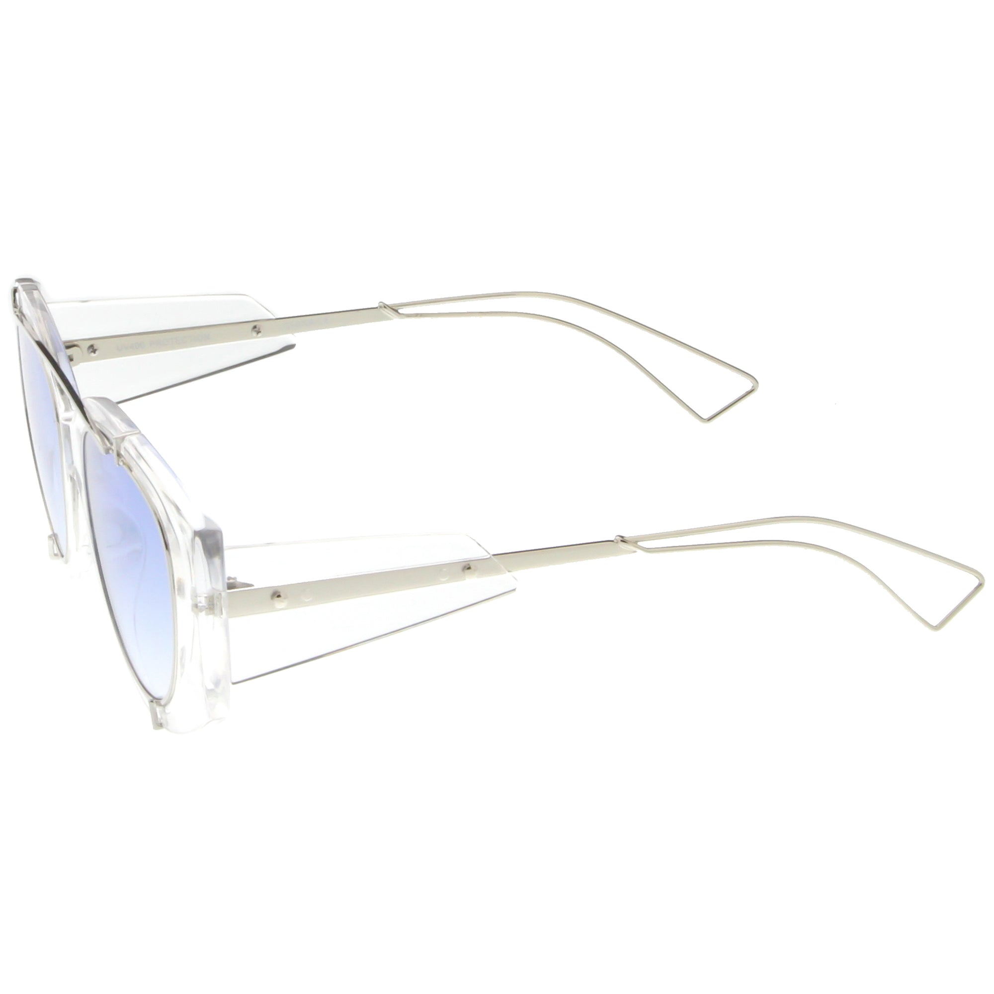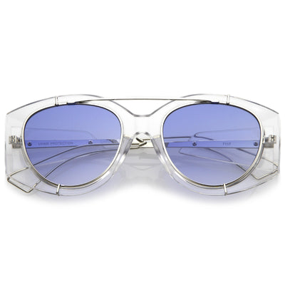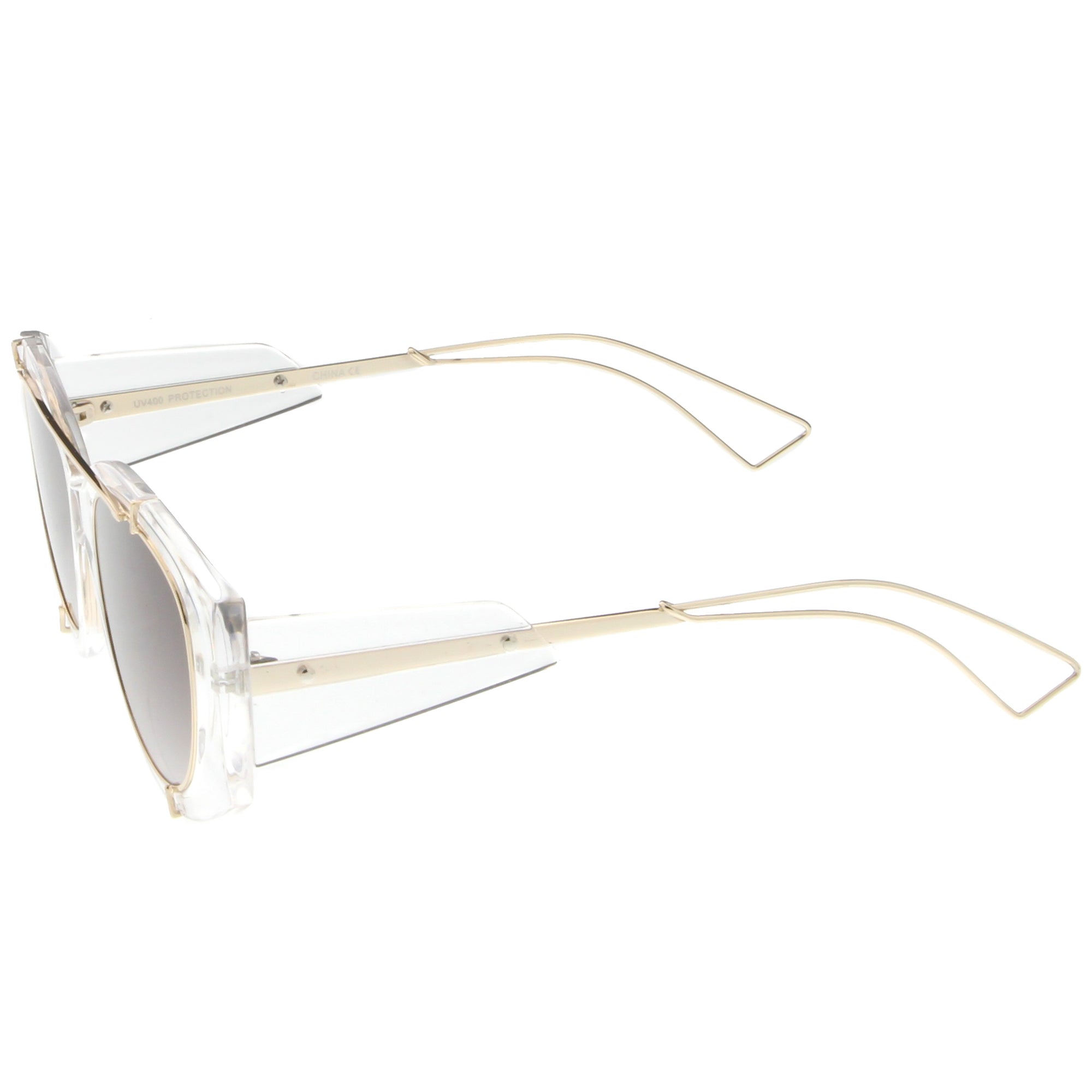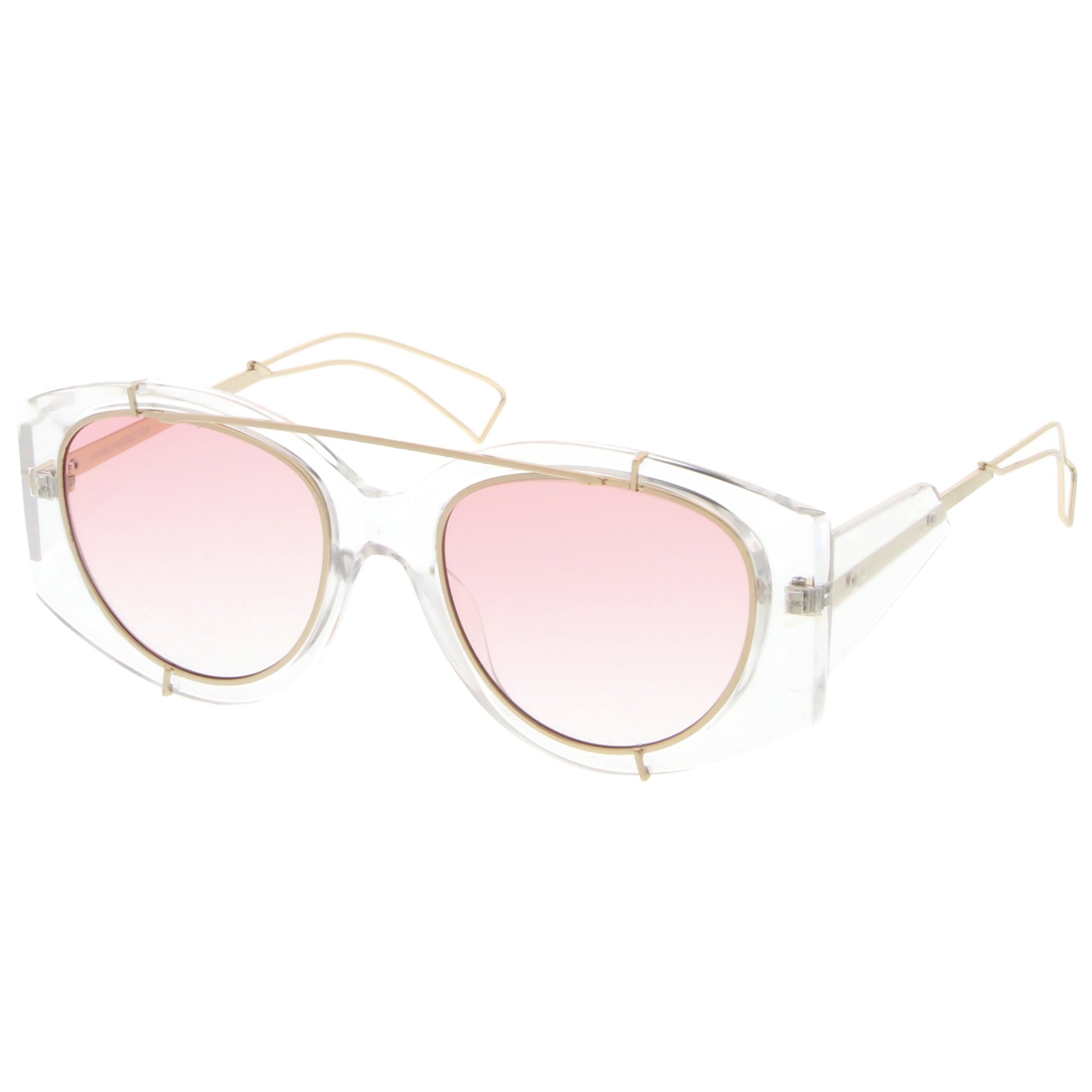 • Bold with futuristic appeal, these oversize sunglasses are crafted with a translucent frame and tinted round flat lenses. A sleek crossbar and open wire arms complete this edgy style. Made with a plastic and metal based frame, reinforced metal hinges, and 100% UV protected lenses.