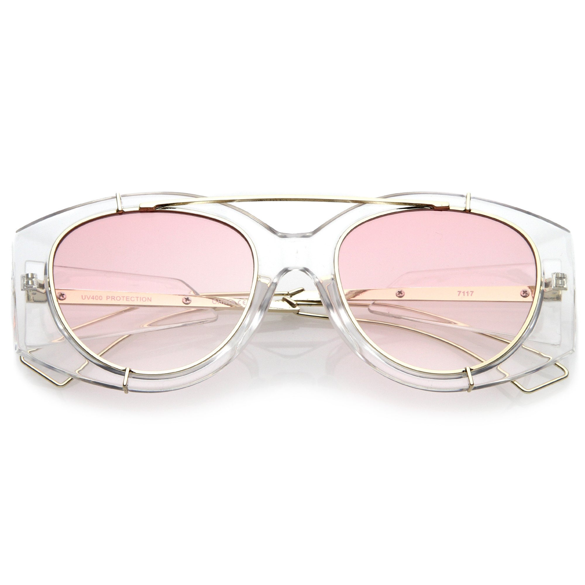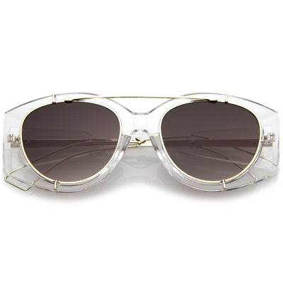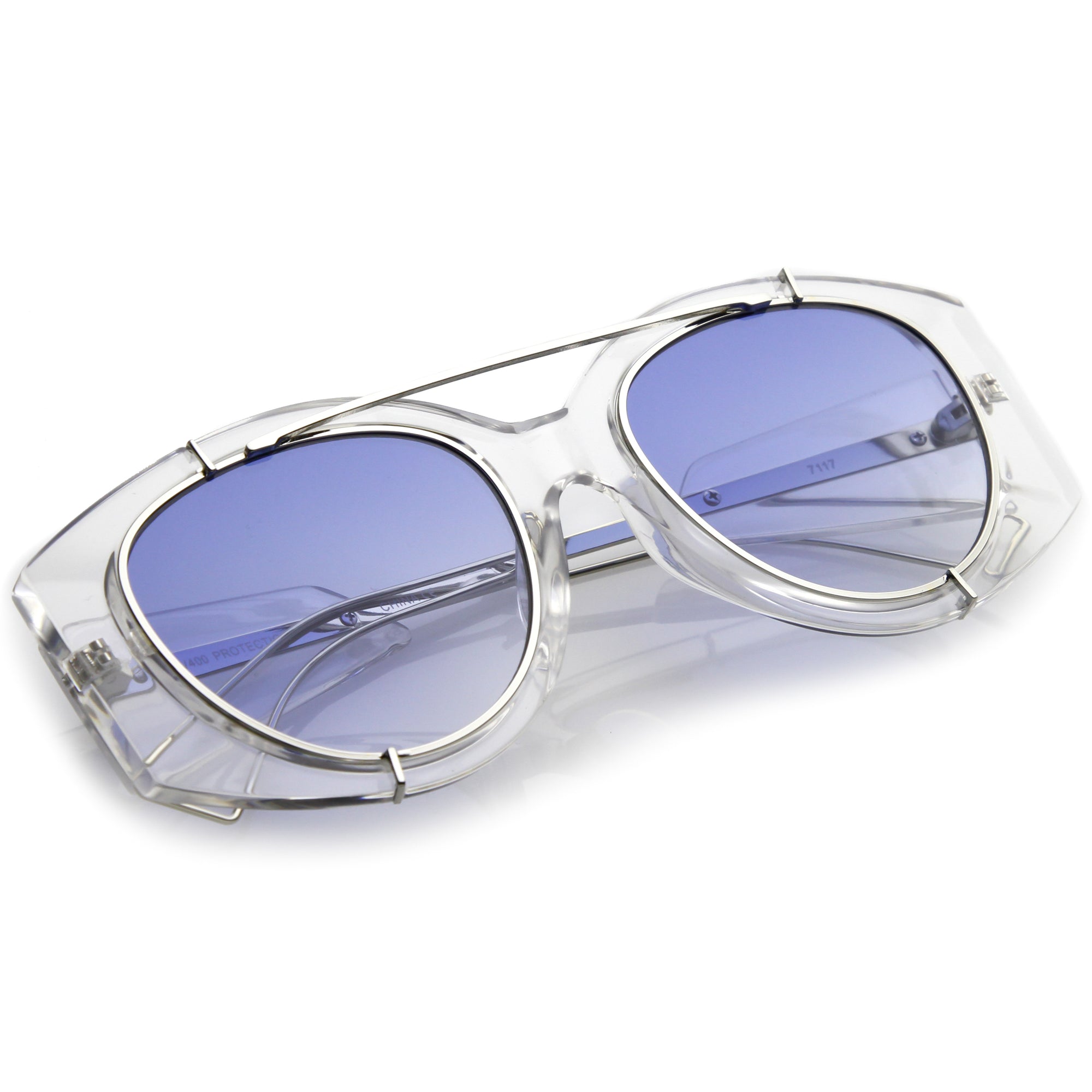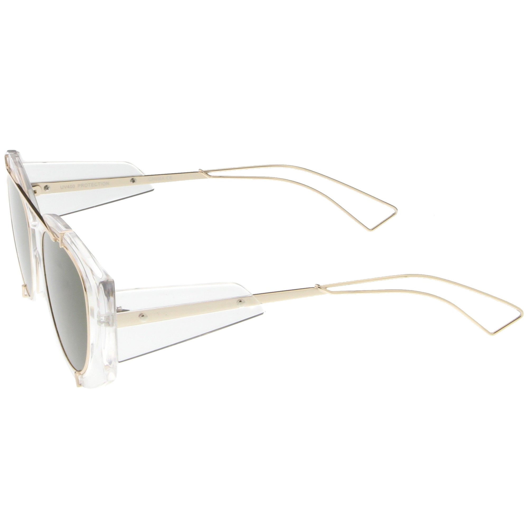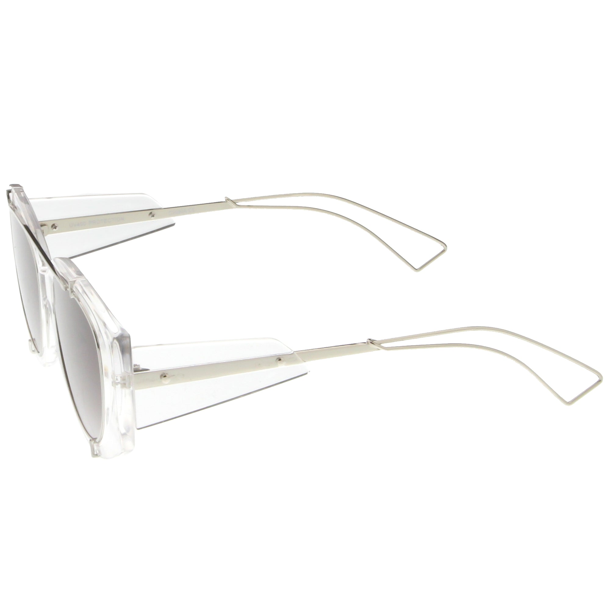 • Bold with futuristic appeal, these oversize sunglasses are crafted with a translucent frame and tinted round flat lenses. A sleek crossbar and open wire arms complete this edgy style. Made with a plastic and metal based frame, reinforced metal hinges, and 100% UV protected lenses.