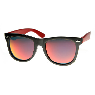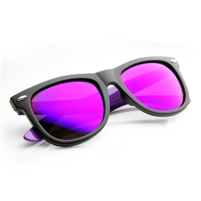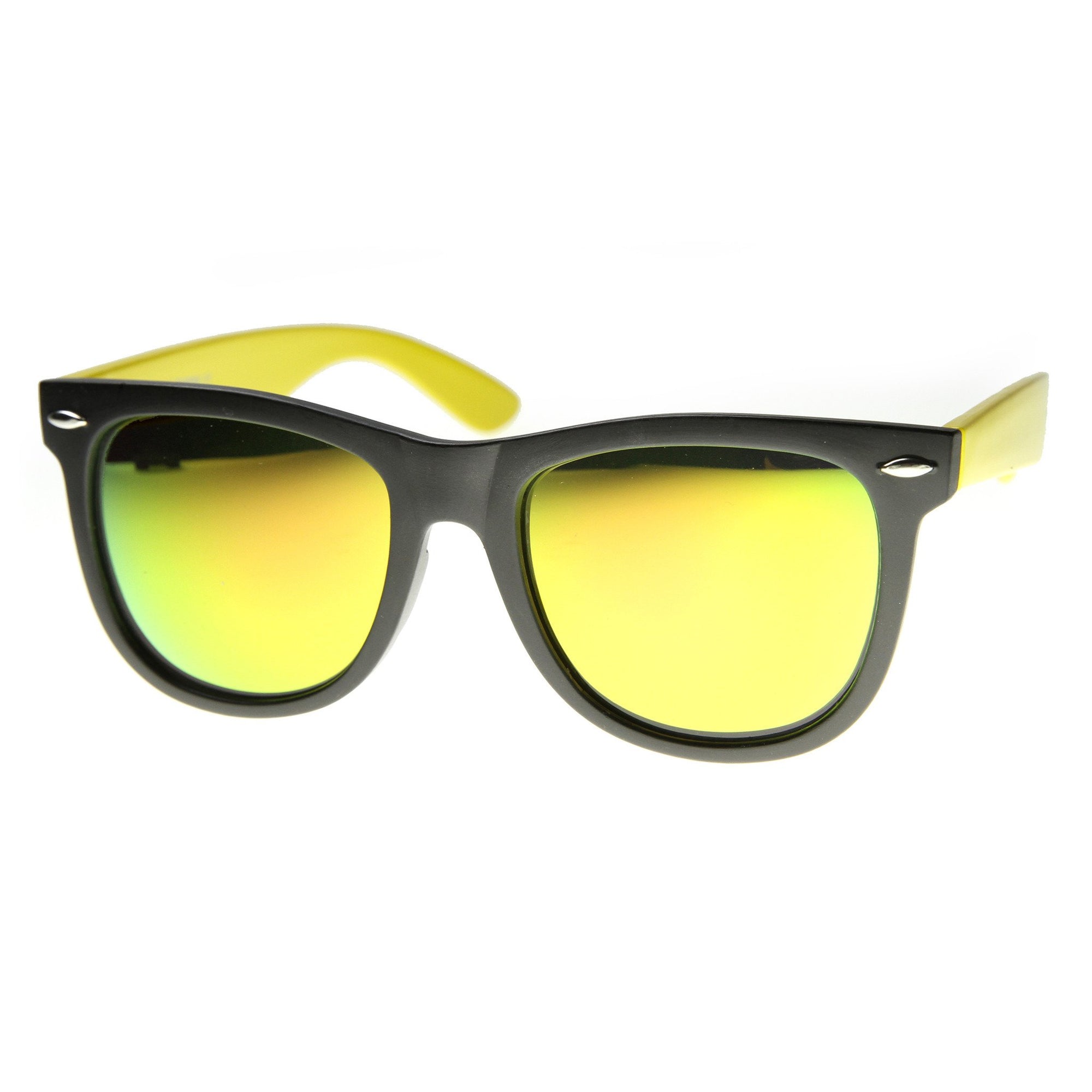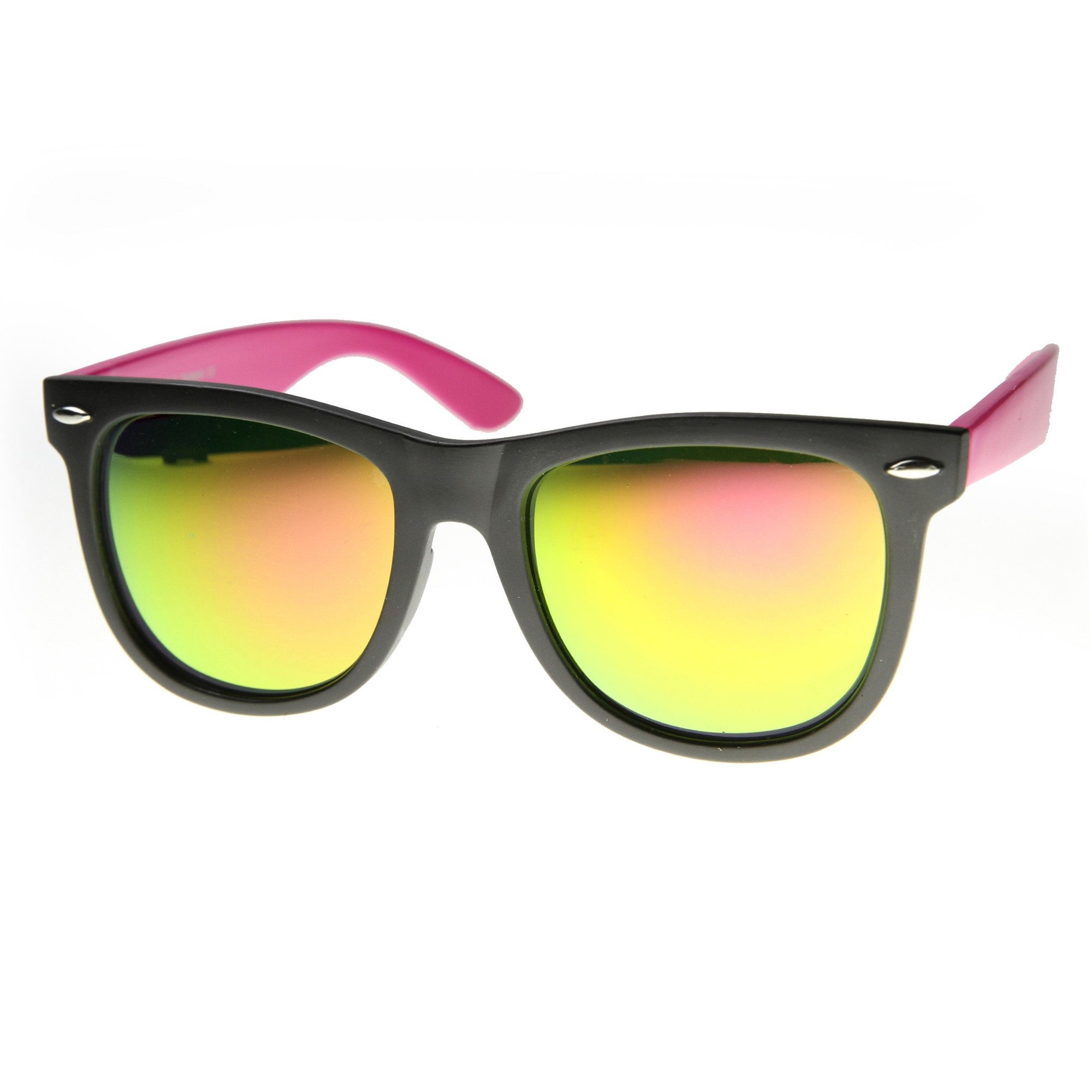 Proteja sus ojos con estilo con estas gafas de sol con montura en forma de cuerno de dos tonos que cuentan con un marco negro mate con combinaciones de colores y lentes espejadas de colores llamativos. Disponible en una variedad de colores divertidos para elegir que funcionan muy bien para cualquier ocasión. Fabricado con un marco de plástico, bisagras de metal y lentes con protección UV400.